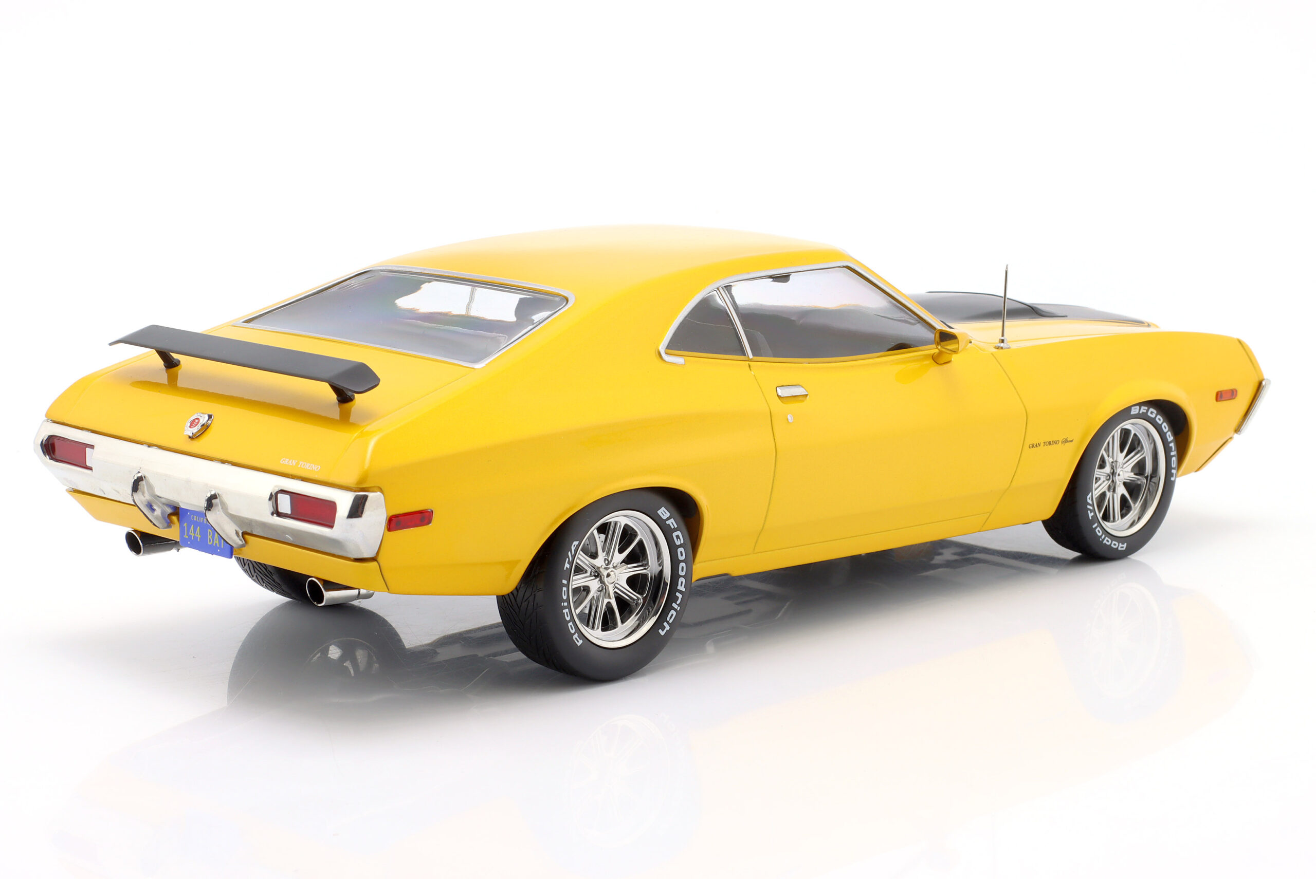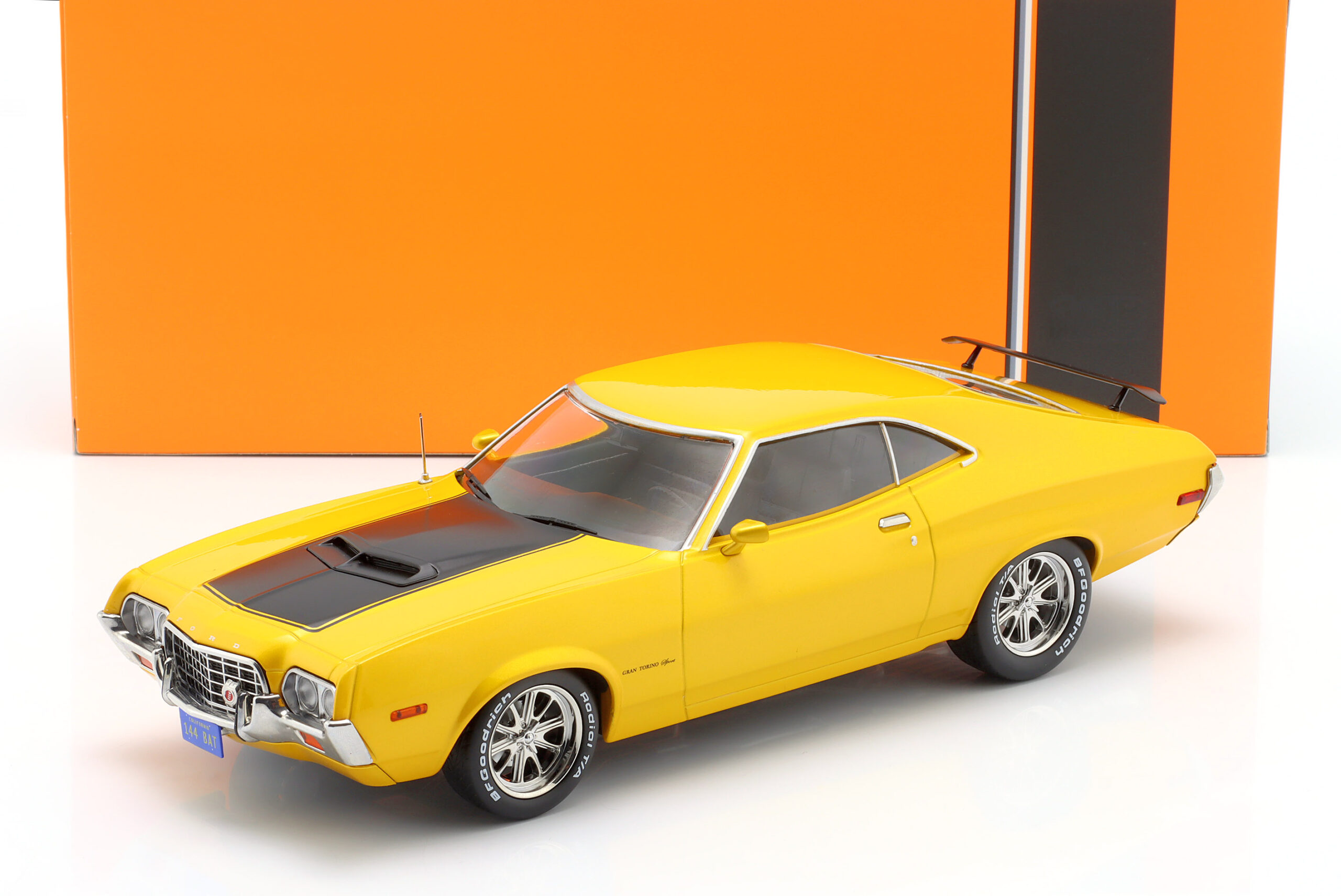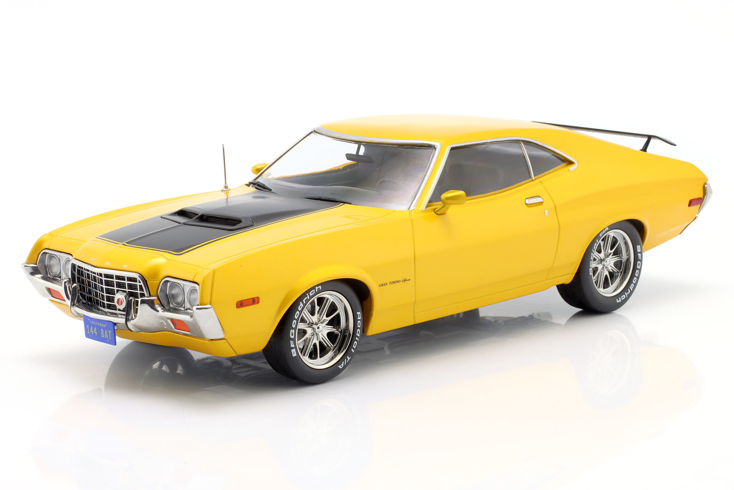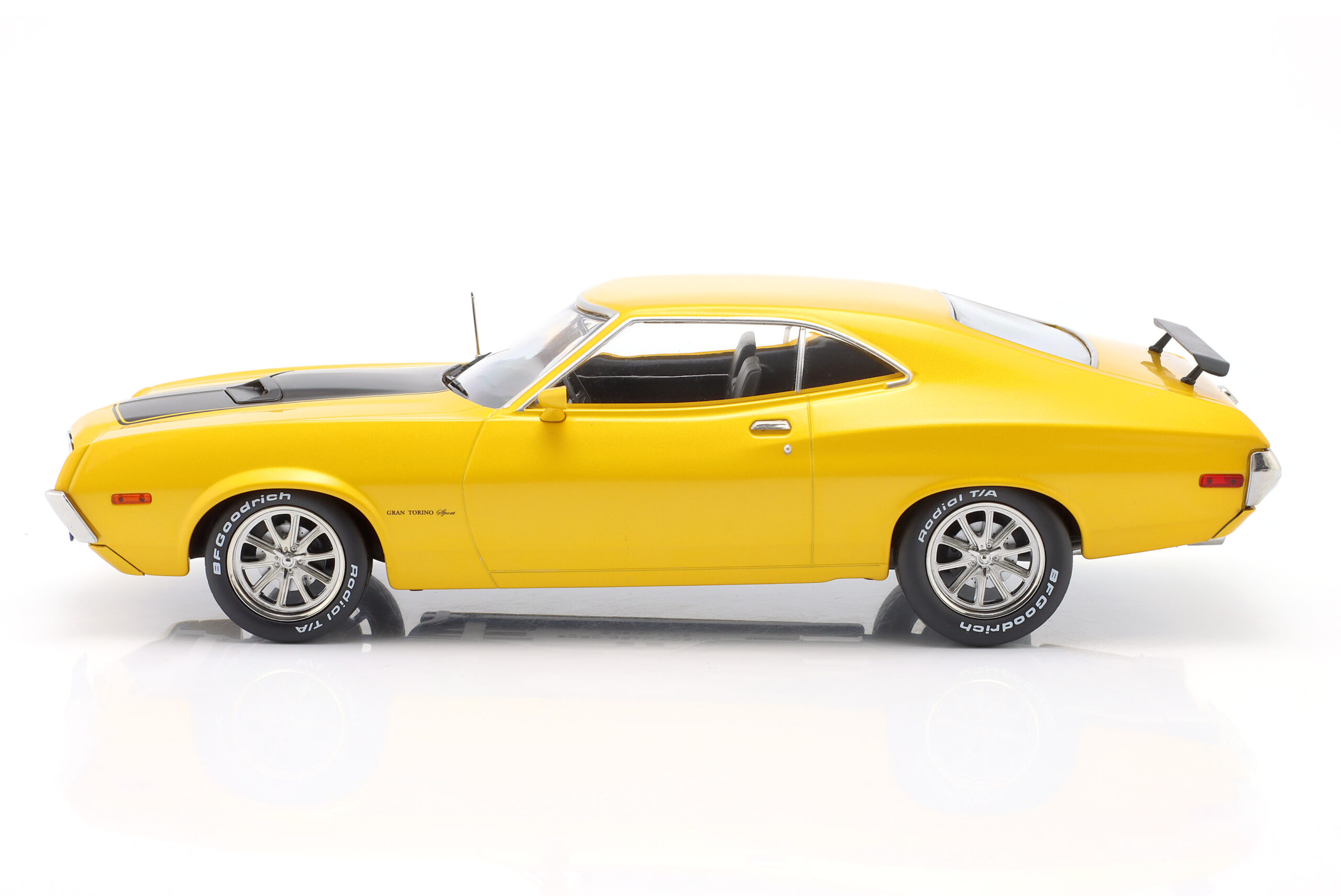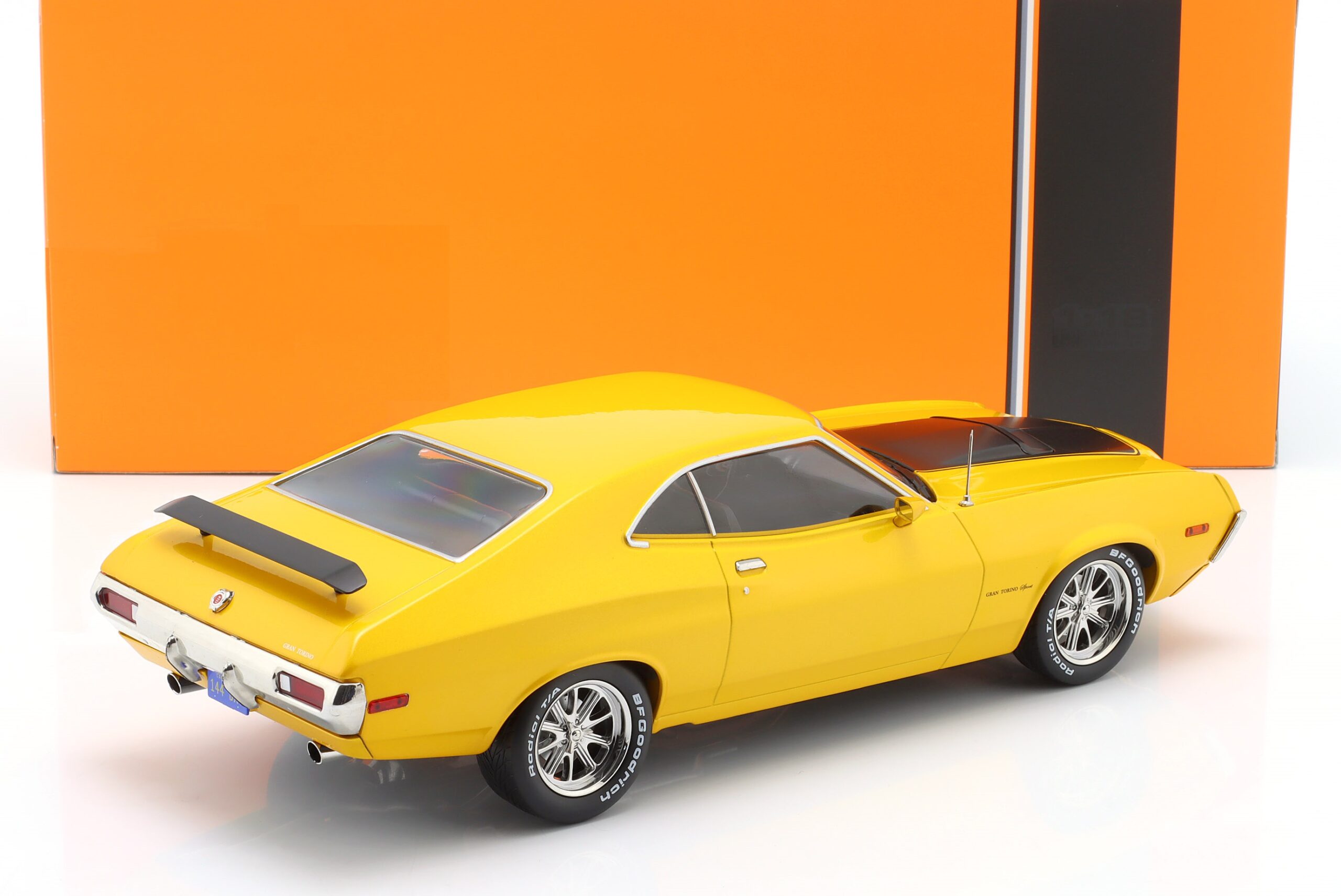 Kolekcjonerski model metalowy z elementami plastikowymi samochodu FORD GRAN TORINO SPORT 2-Door z roku 1972 w kolorze Żółtym.Model nie posiada otwieranych elementów.