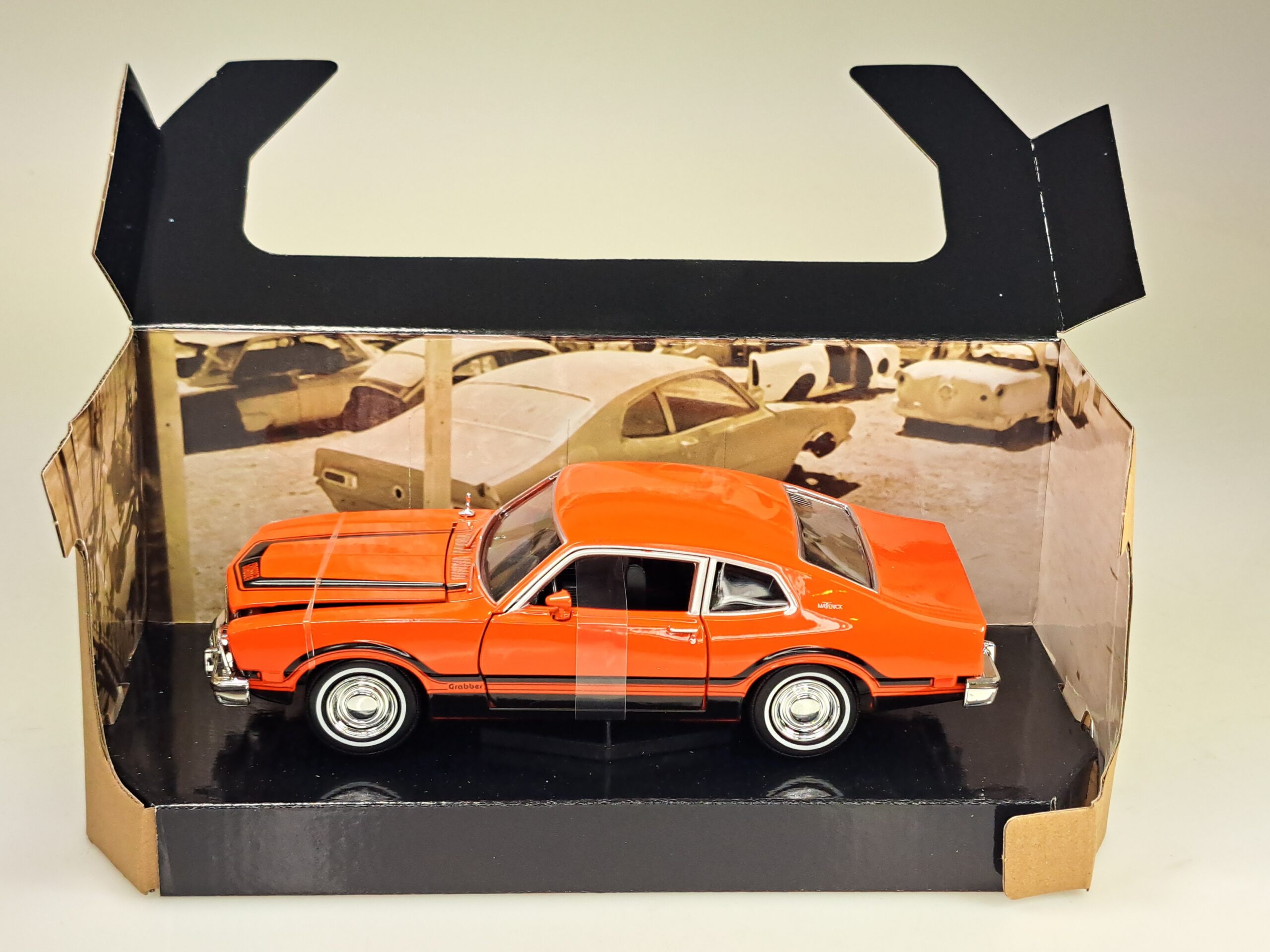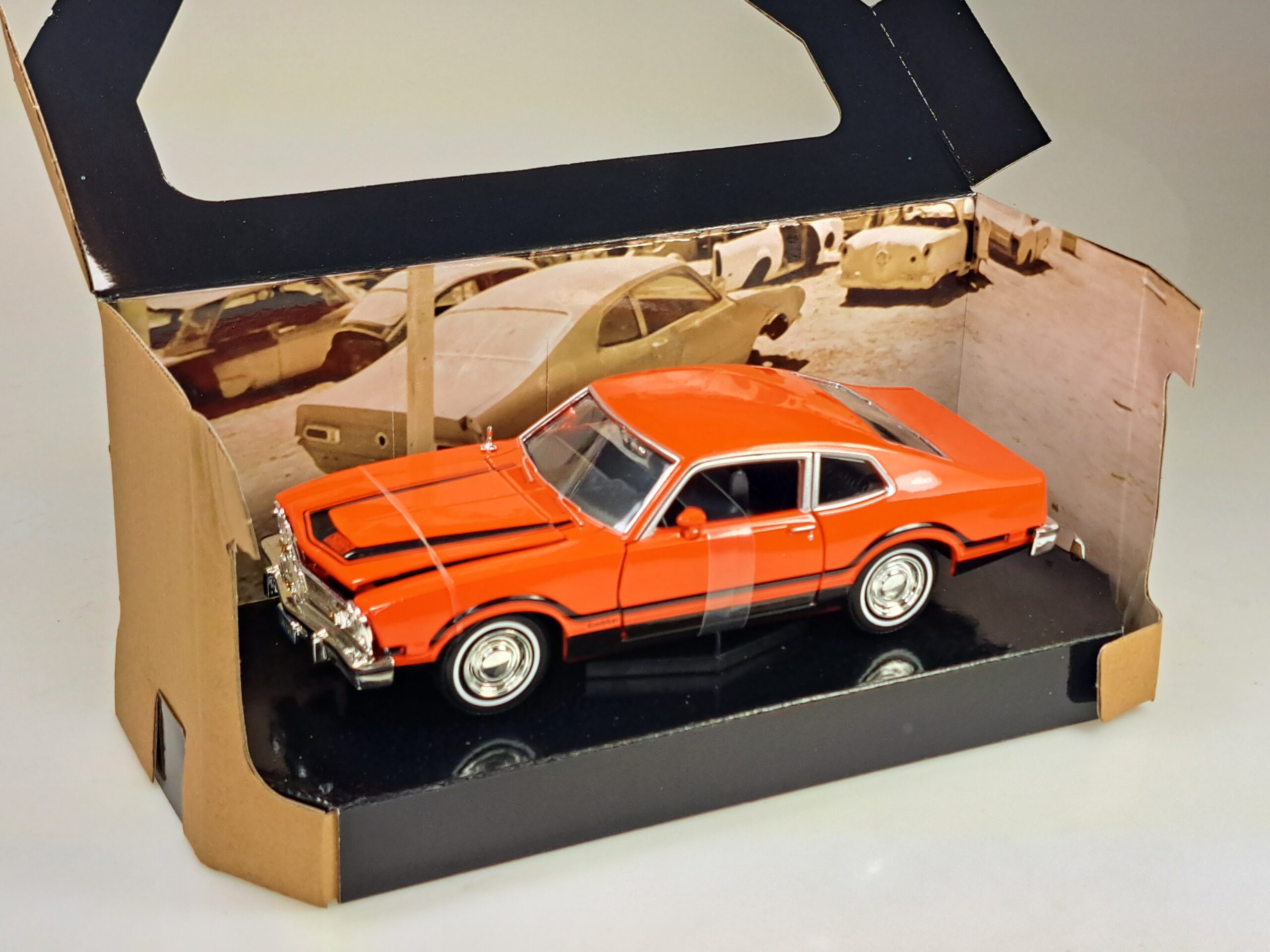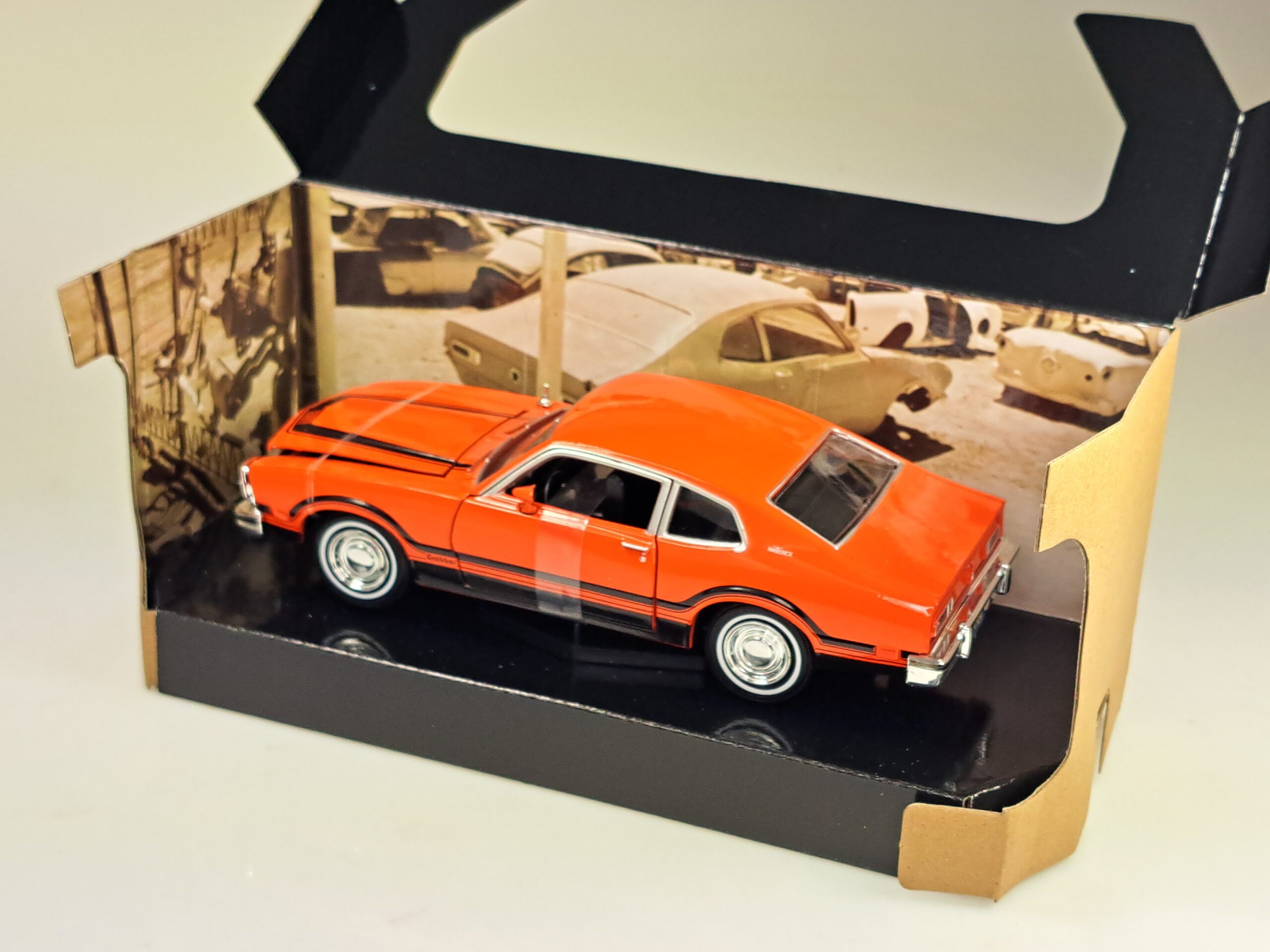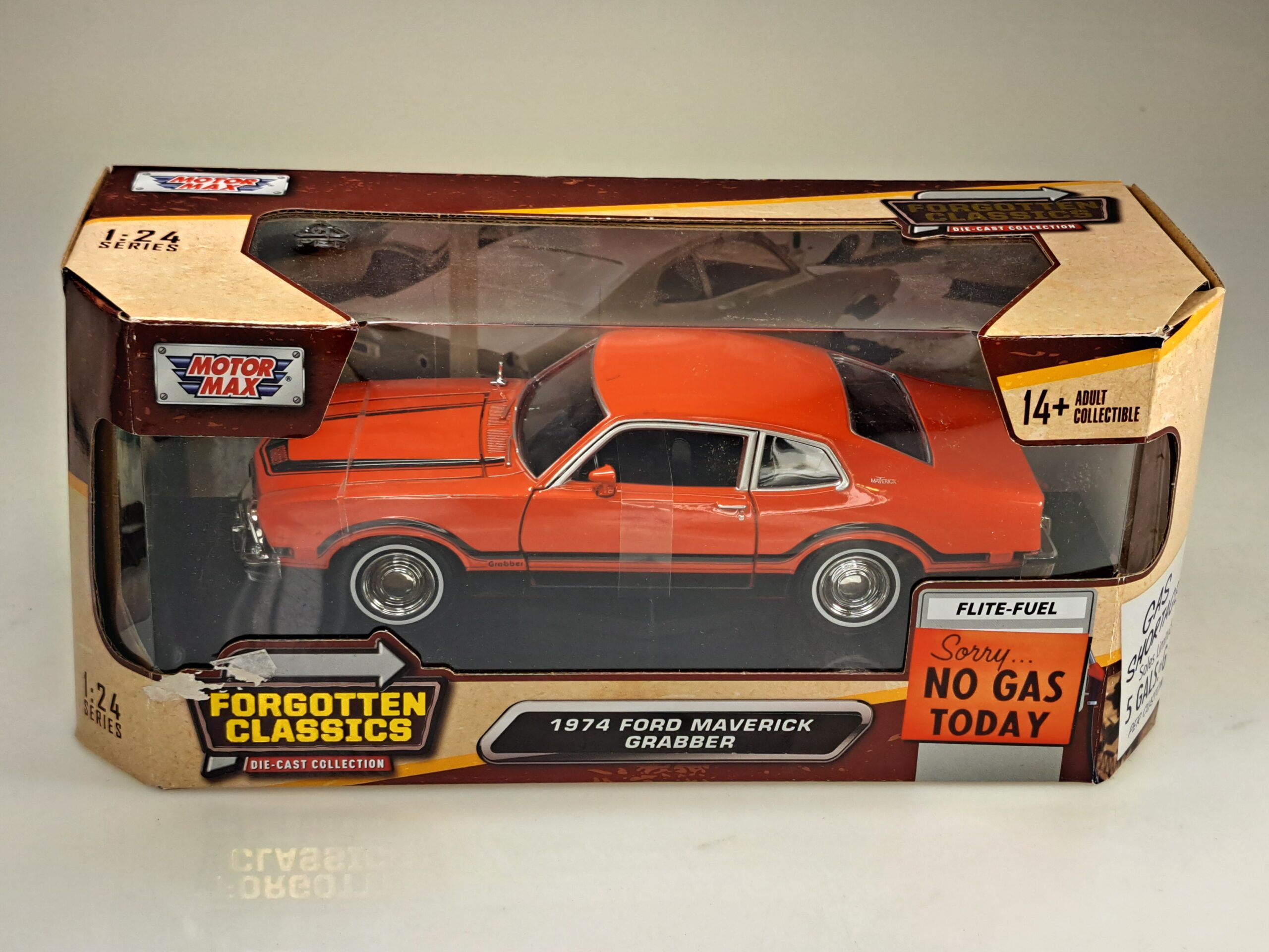 Kolekcjonerski model metalowy z elementami plastikowymi samochodu FORD MAVERICK Grabber z roku 1974 w kolorze Pomarańczowym.Posiada otwierane drzwi.Model zapakowany w kartonowe pudełko witrynką.