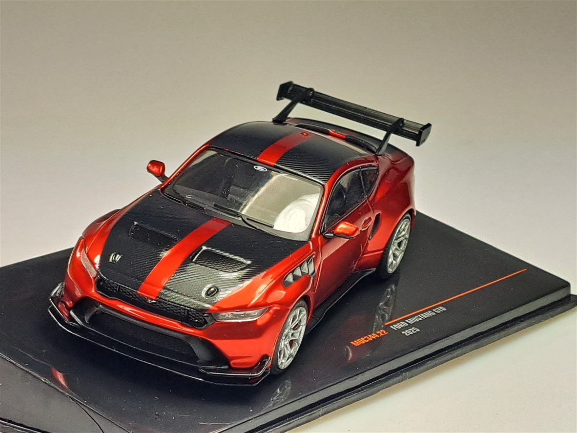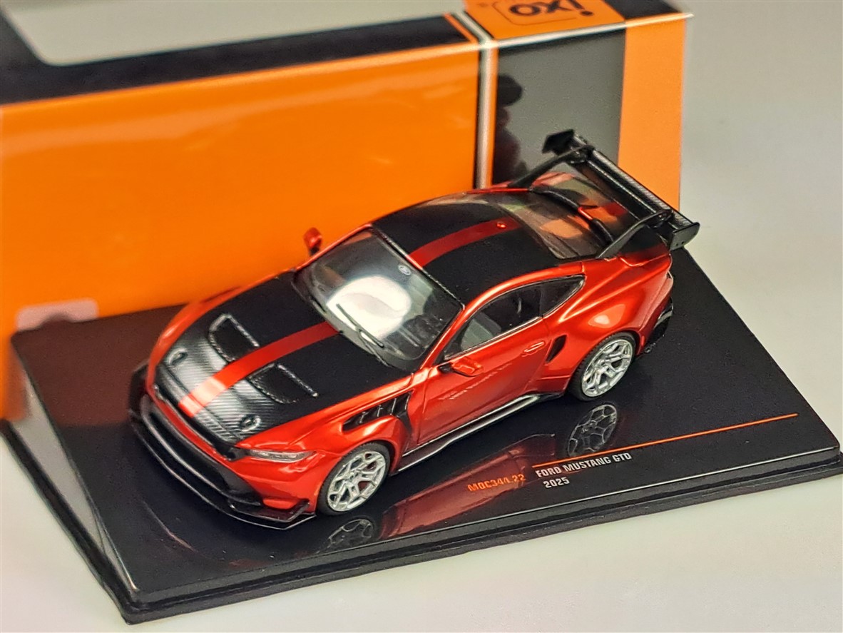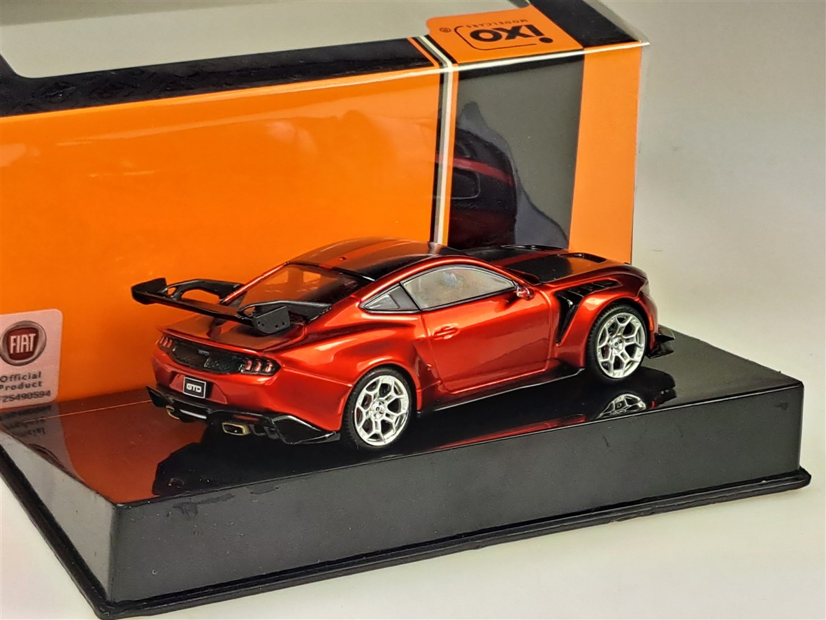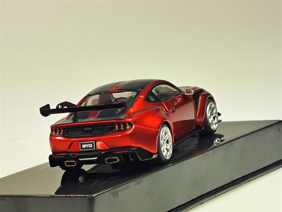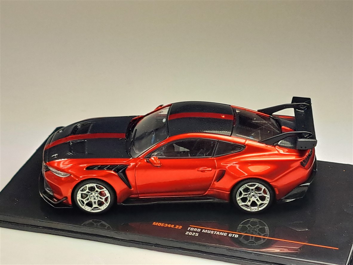 Kolekcjonerski model metalowy z elementami plastikowymi samochodu FORD MUSTANG GTD 5.2L V8 Coupe z roku 2025 w kolorze Czerwony metallic/czarny.Model na podstawce,posiada akrylową gablotkę ekspozycyjną,nie posiada otwieranych elementów.