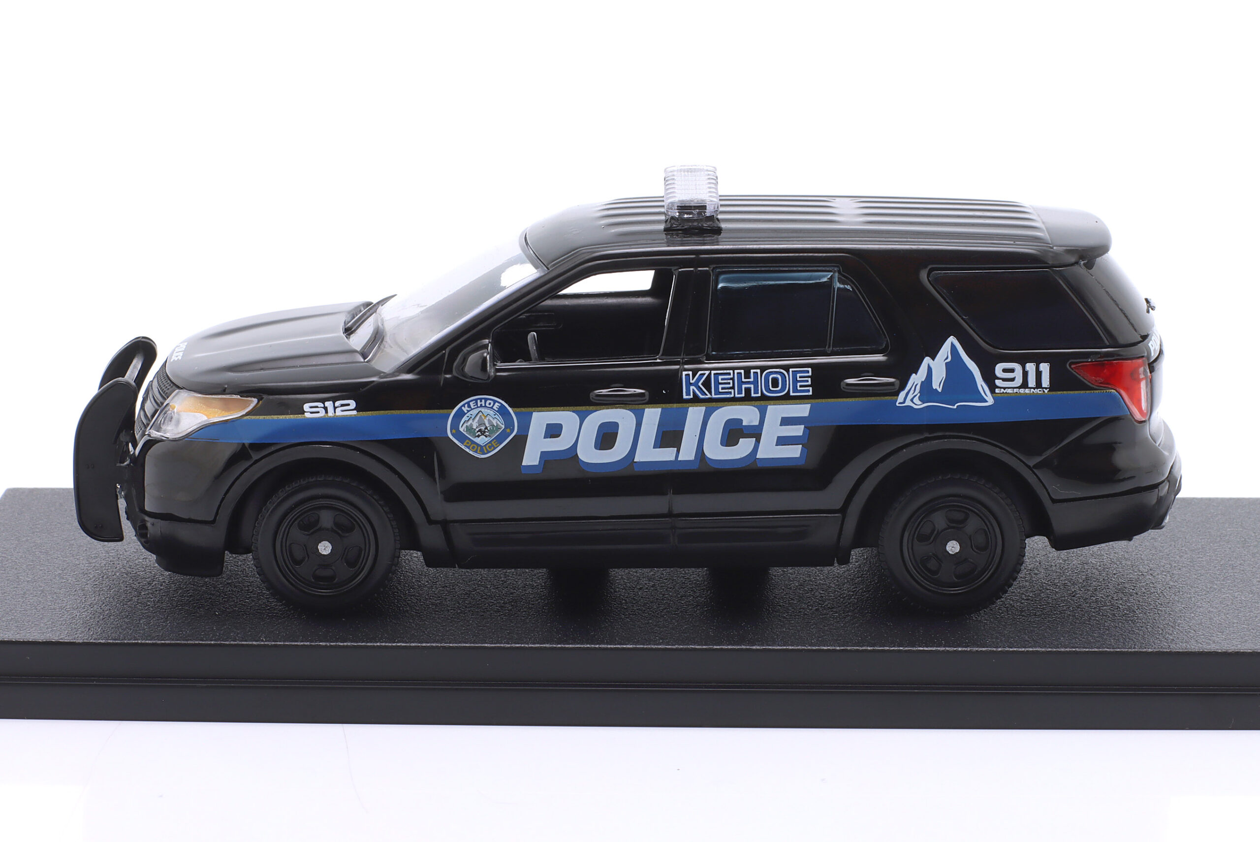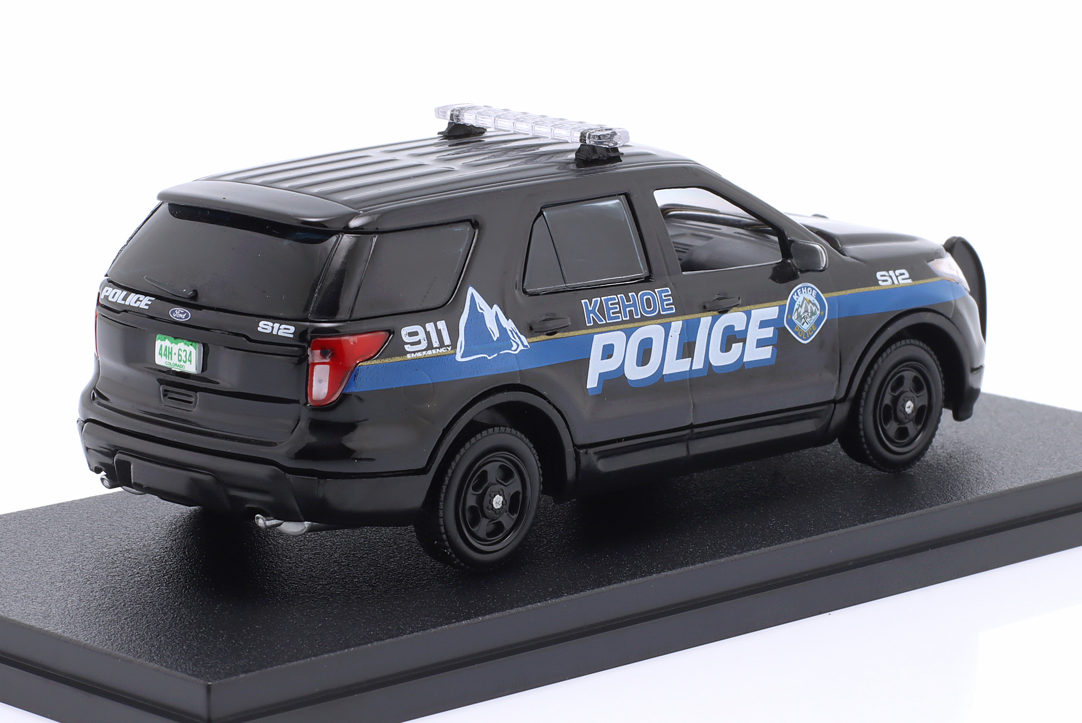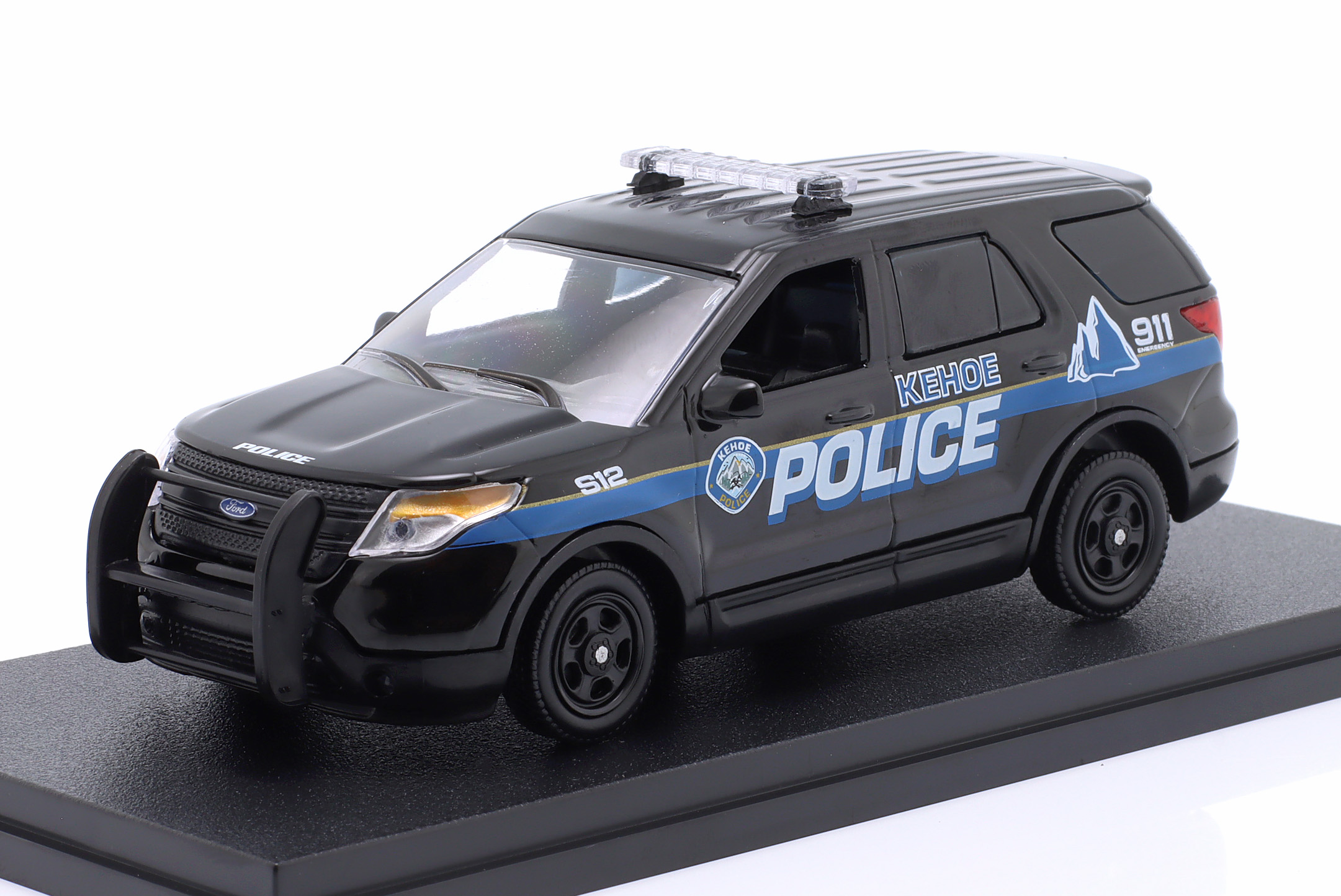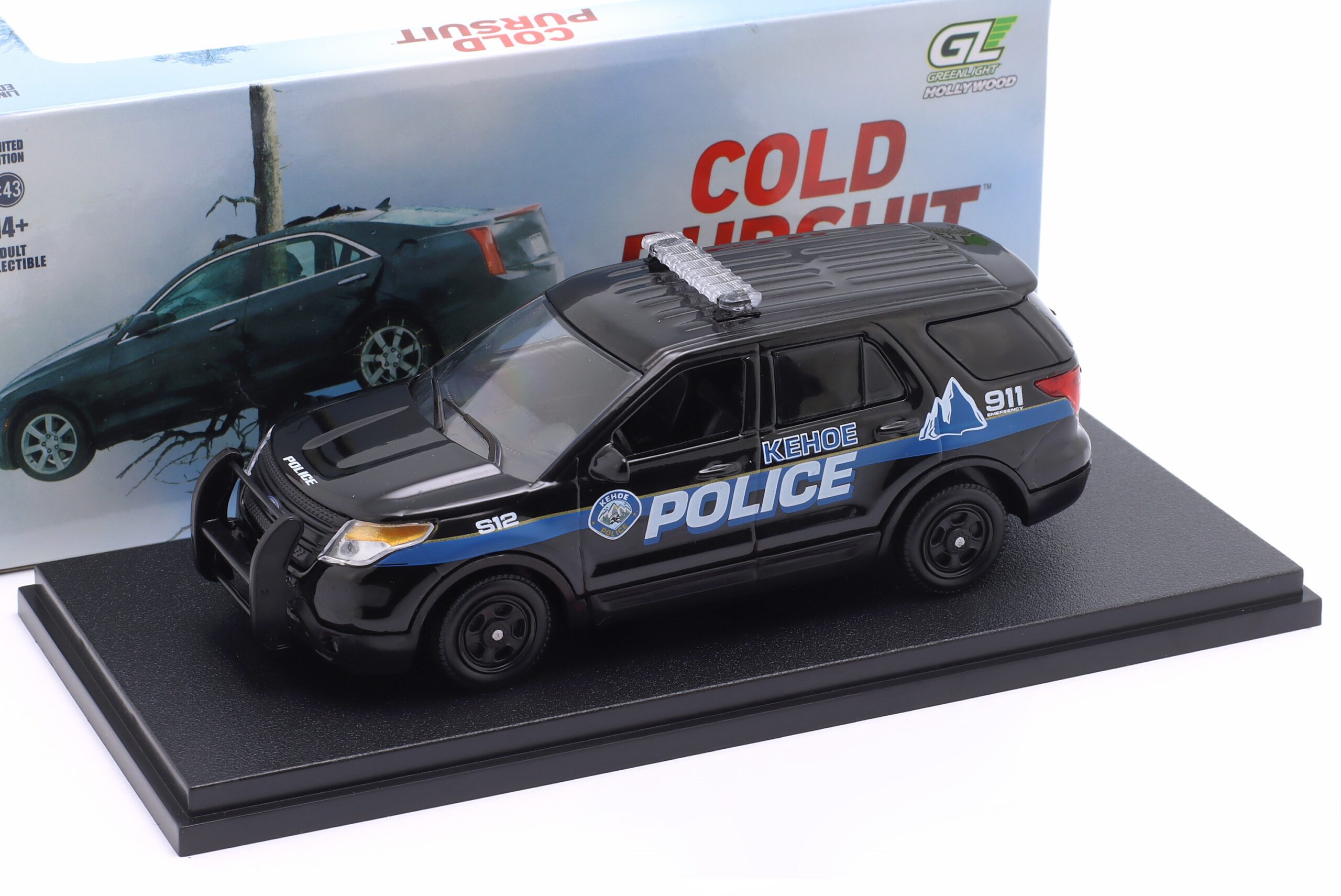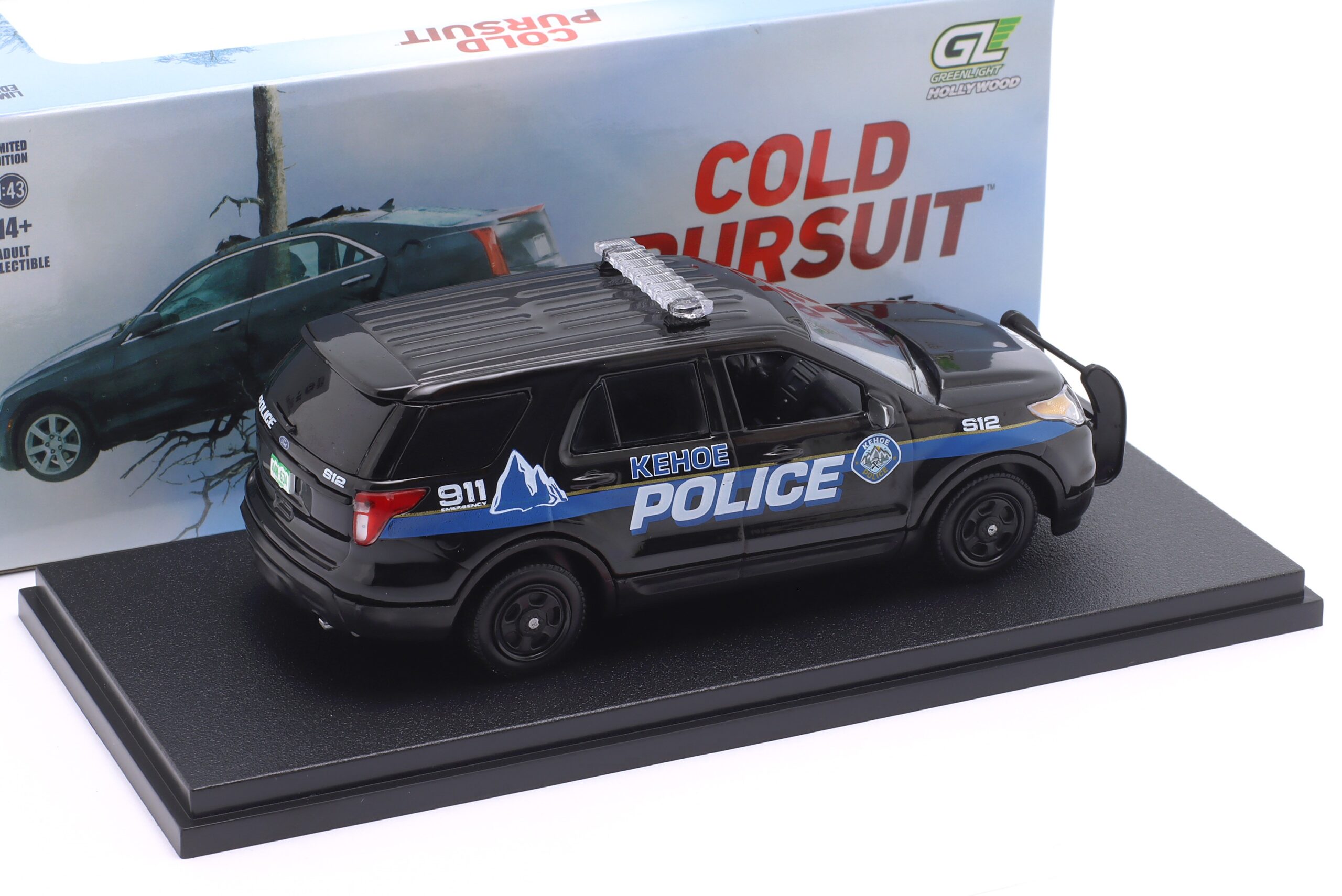 Kolekcjonerski model metalowy z elementami plastikowymi samochodu FORD POLICE INTERCEPTOR UTILITY (Kehoe Police) z roku 2013 z filmu Cold Pursuit (pol.Przykładny obywatel) z roku 2018.Model na podstawce,posiada akrylowa gablotkę ekspozycyjną.