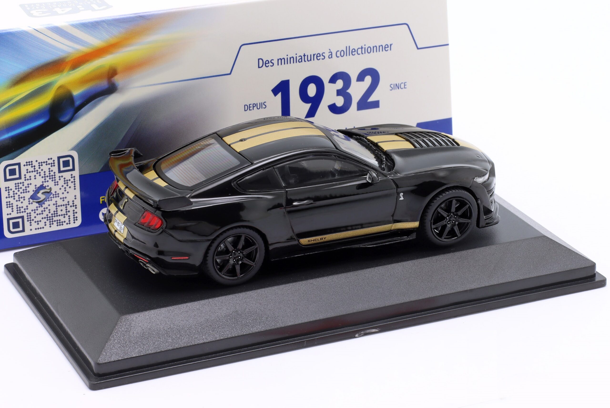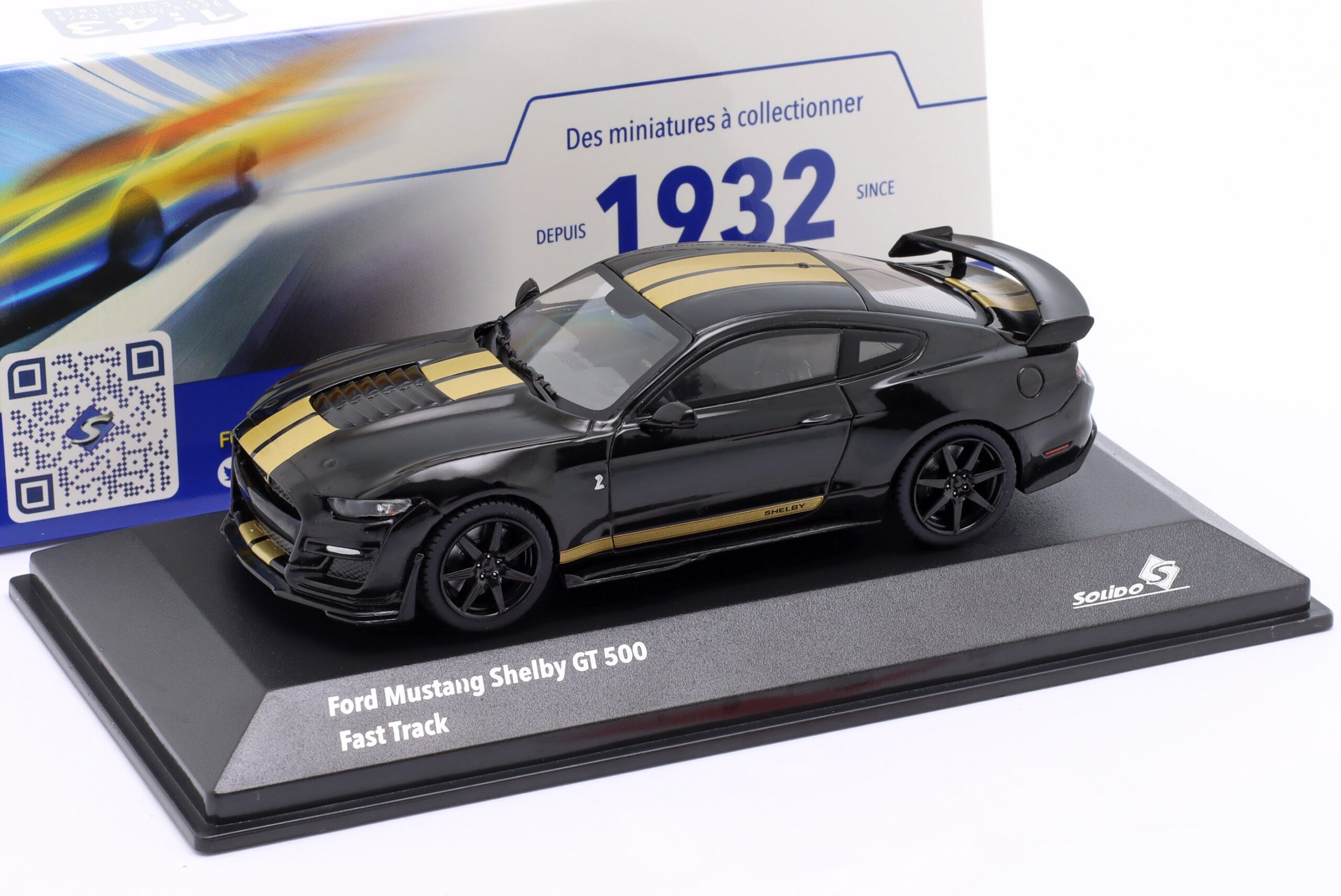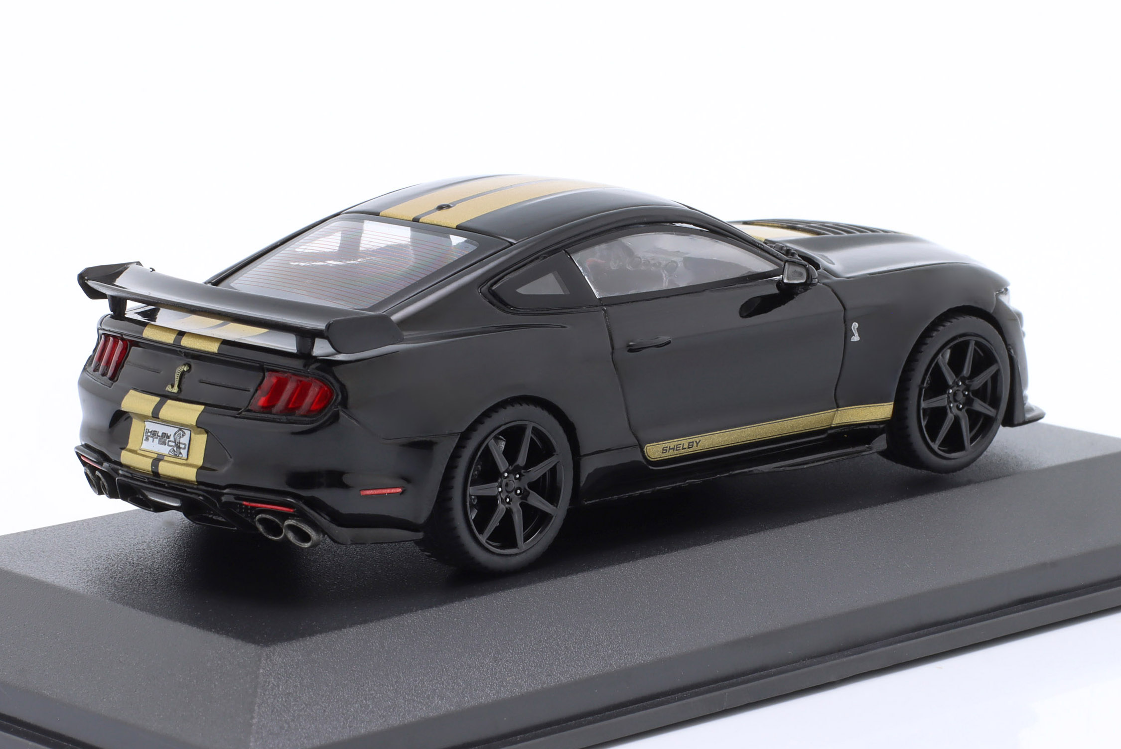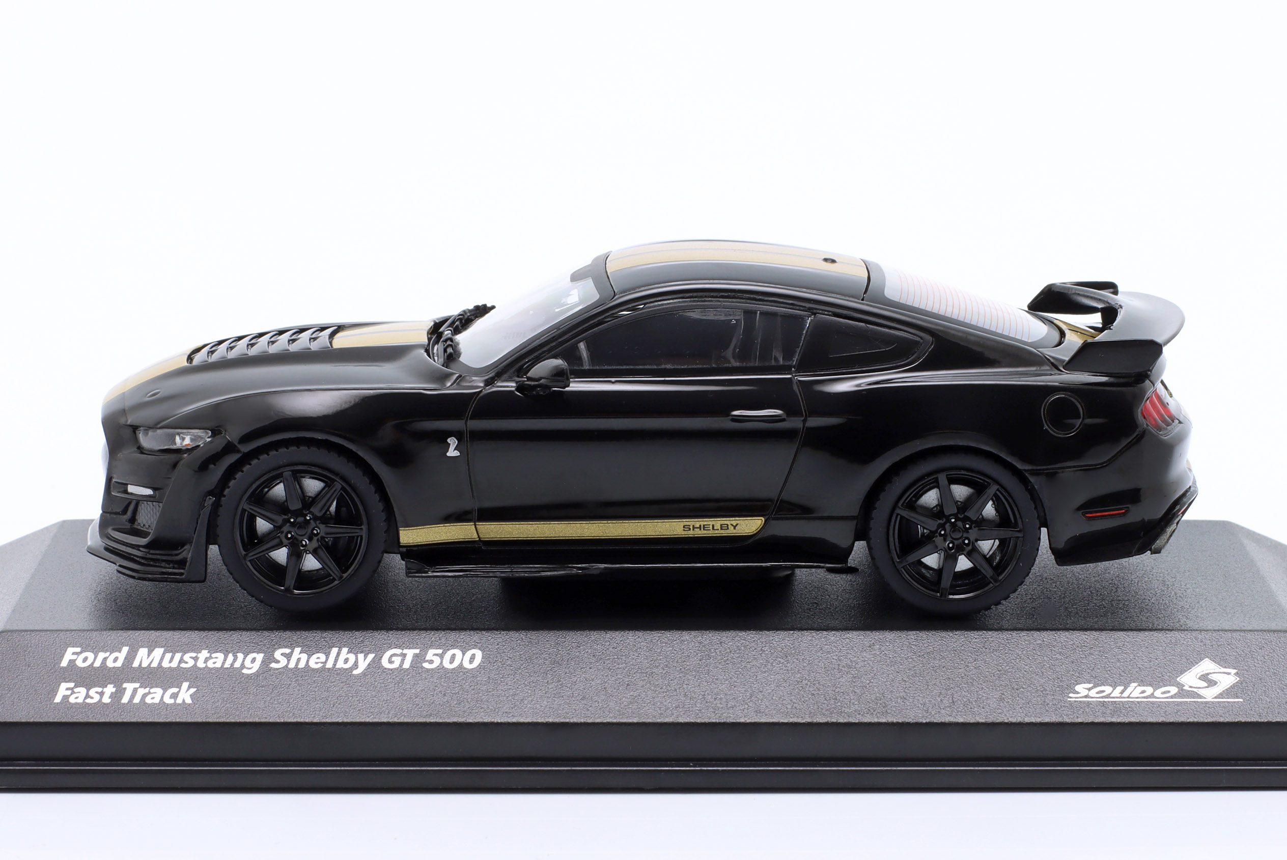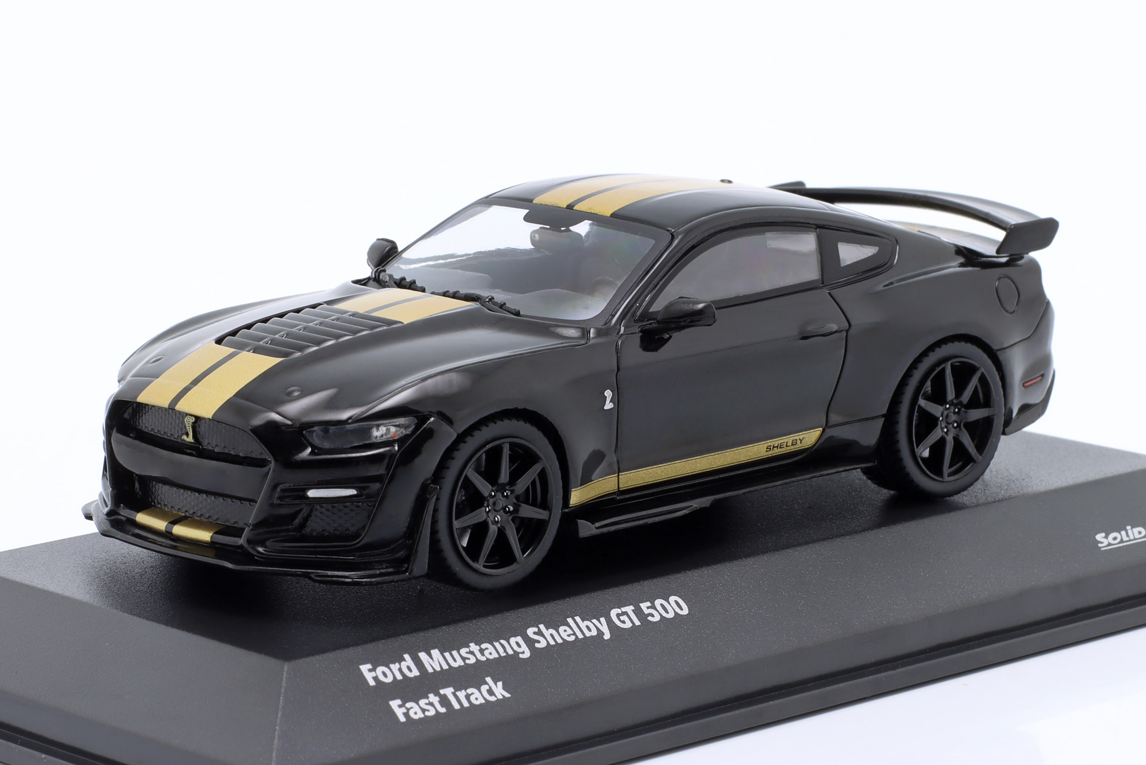 Kolekcjonerski model metalowy z elementami plastikowymi samochodu FORD SHELBY MUSTANG GT500 Fast Track z roku 2020 w kolorze Czarnym ze złotymi pasami.Model na podstawce,posiada akrylową gablotkę ekspozycyjną.