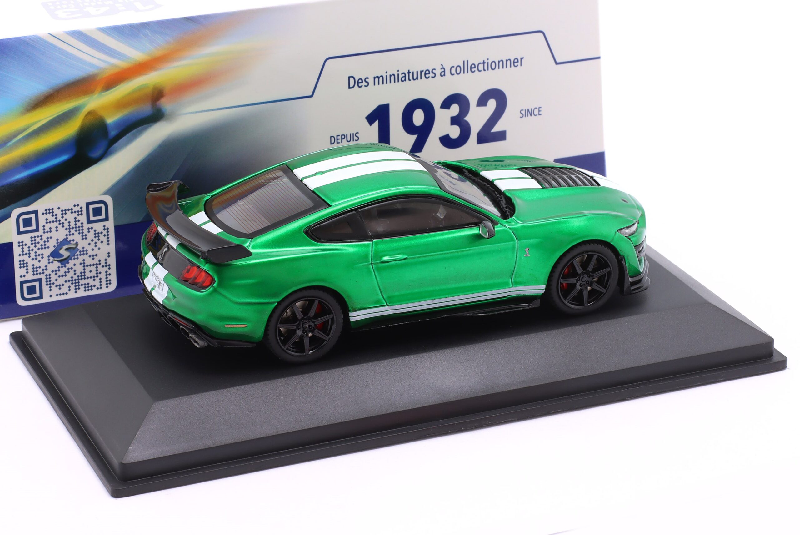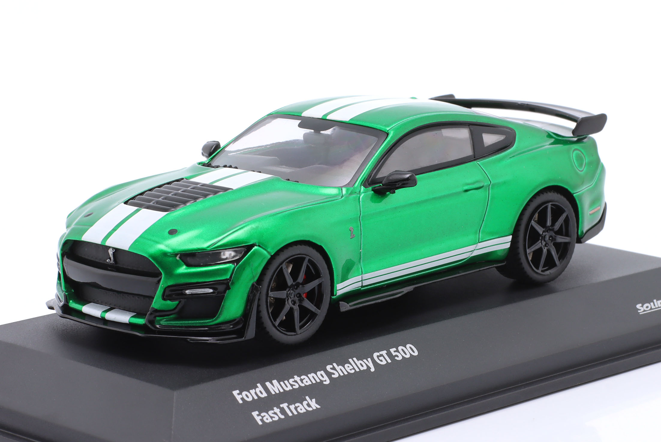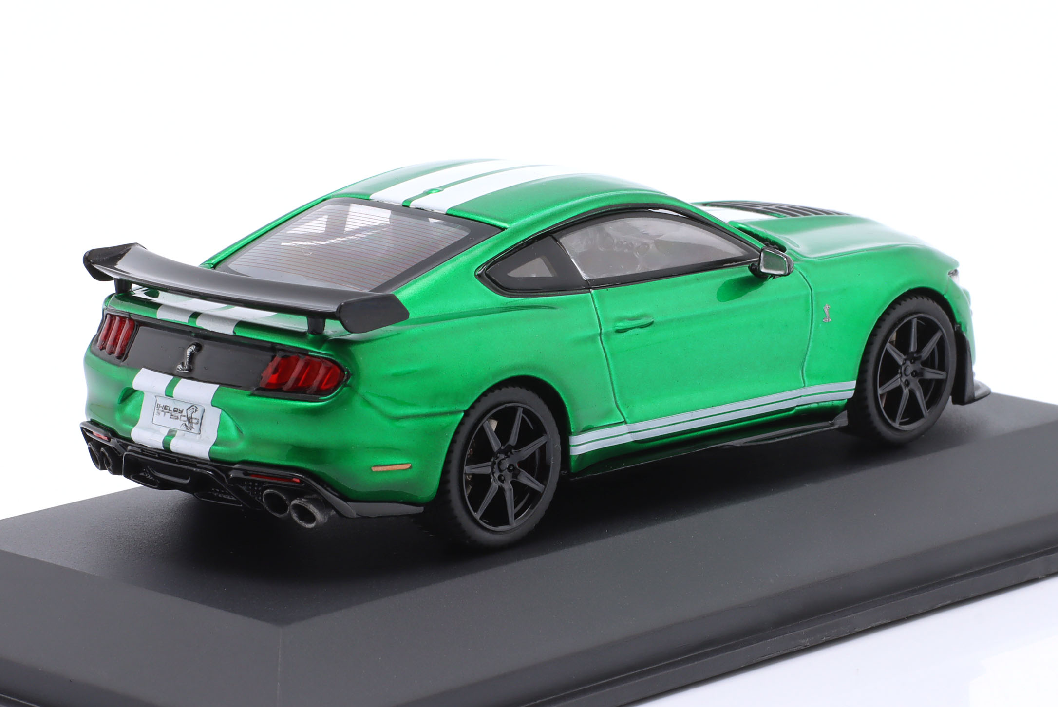 Kolekcjonerski model metalowy z elementami plastikowymi samochodu FORD SHELBY MUSTANG GT500 Fast Track z roku 2020 w kolorze Zielony metallic z białymi pasami.Model posiada podstawkę oraz gablotkę ekspozycyjną.