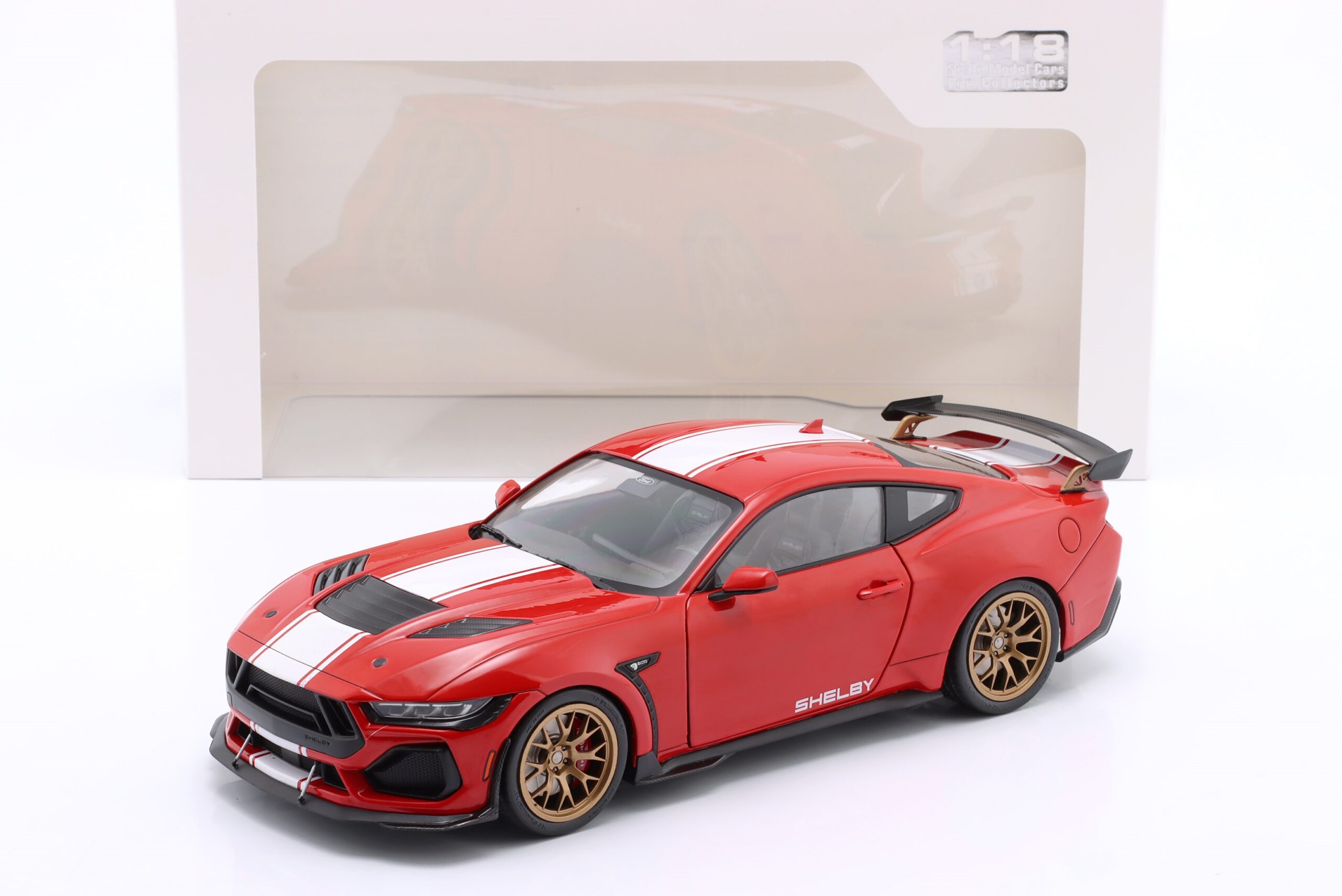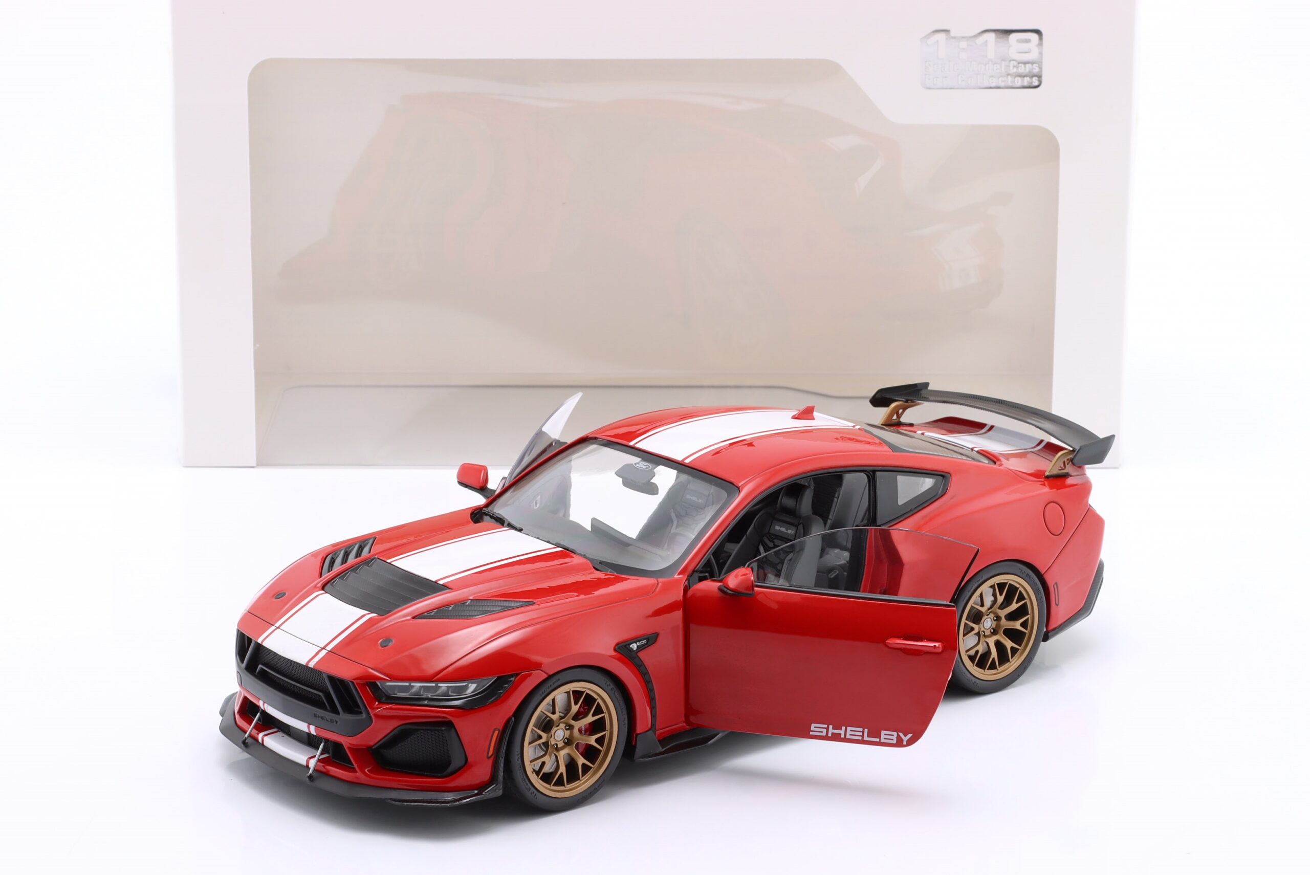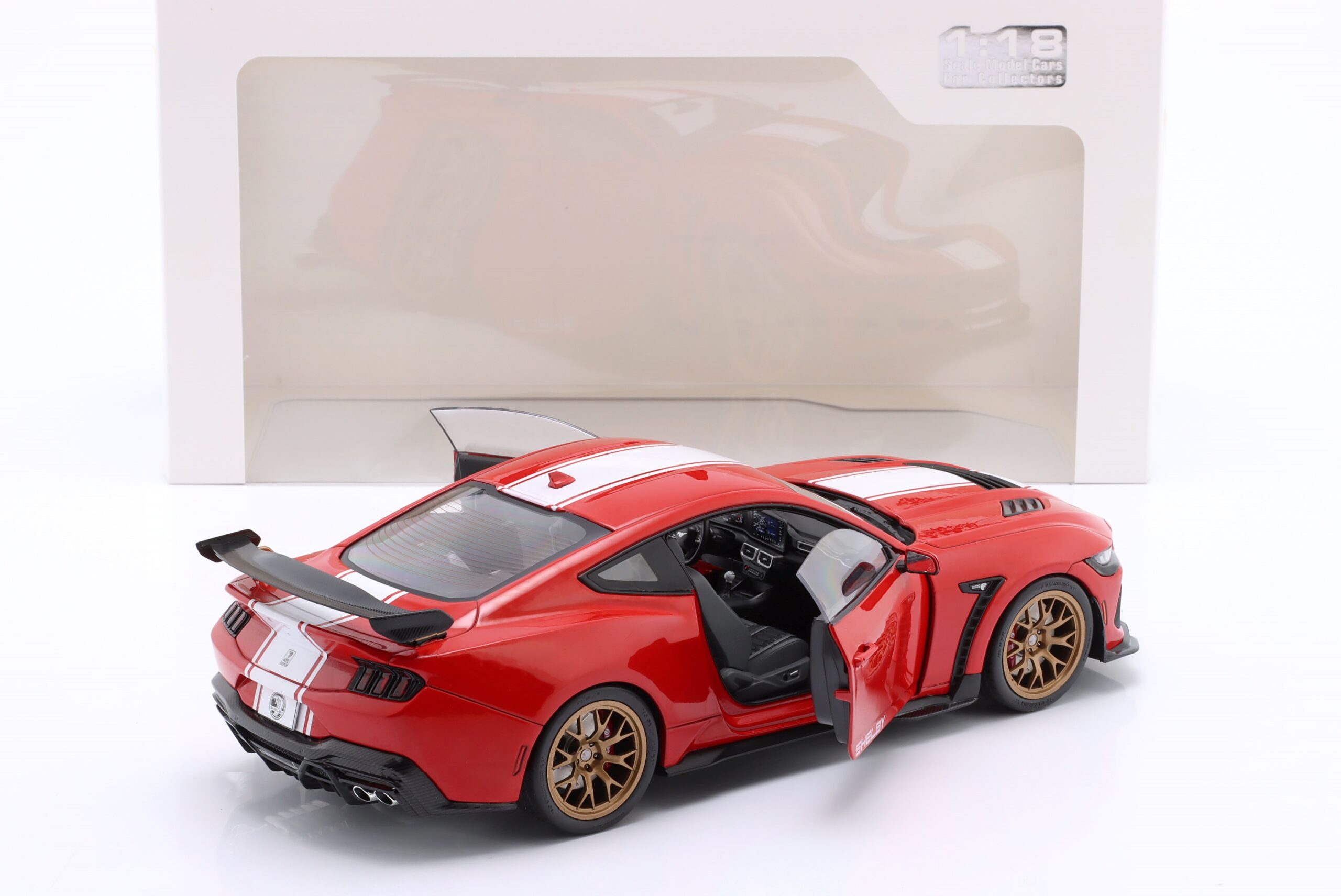Kolekcjonerski model metalowy z elementami plastikowymi samochodu FORD SHELBY MUSTANG Super Snake z roku 2024 w kolorze Czerwonym z białymi pasami.Model posiada otwierane drzwi.
