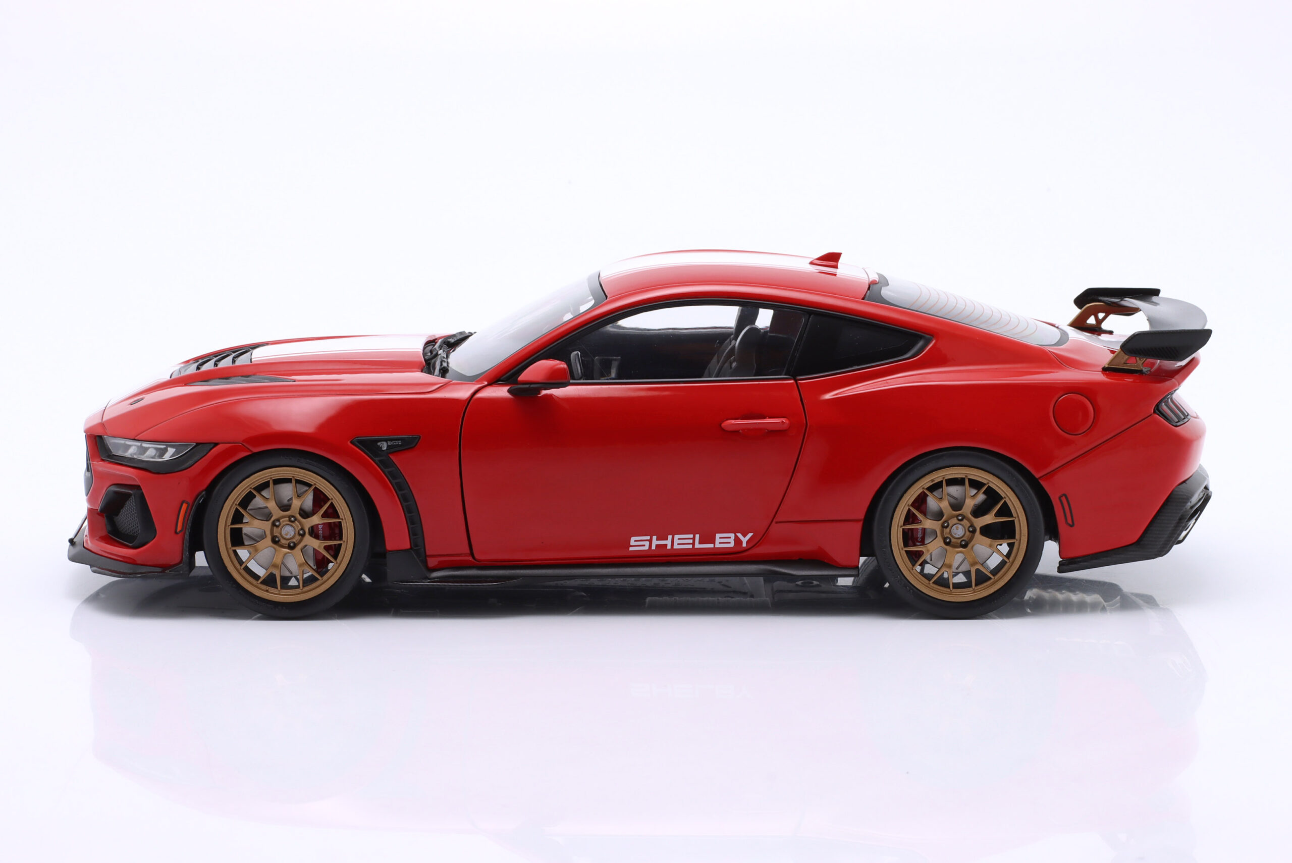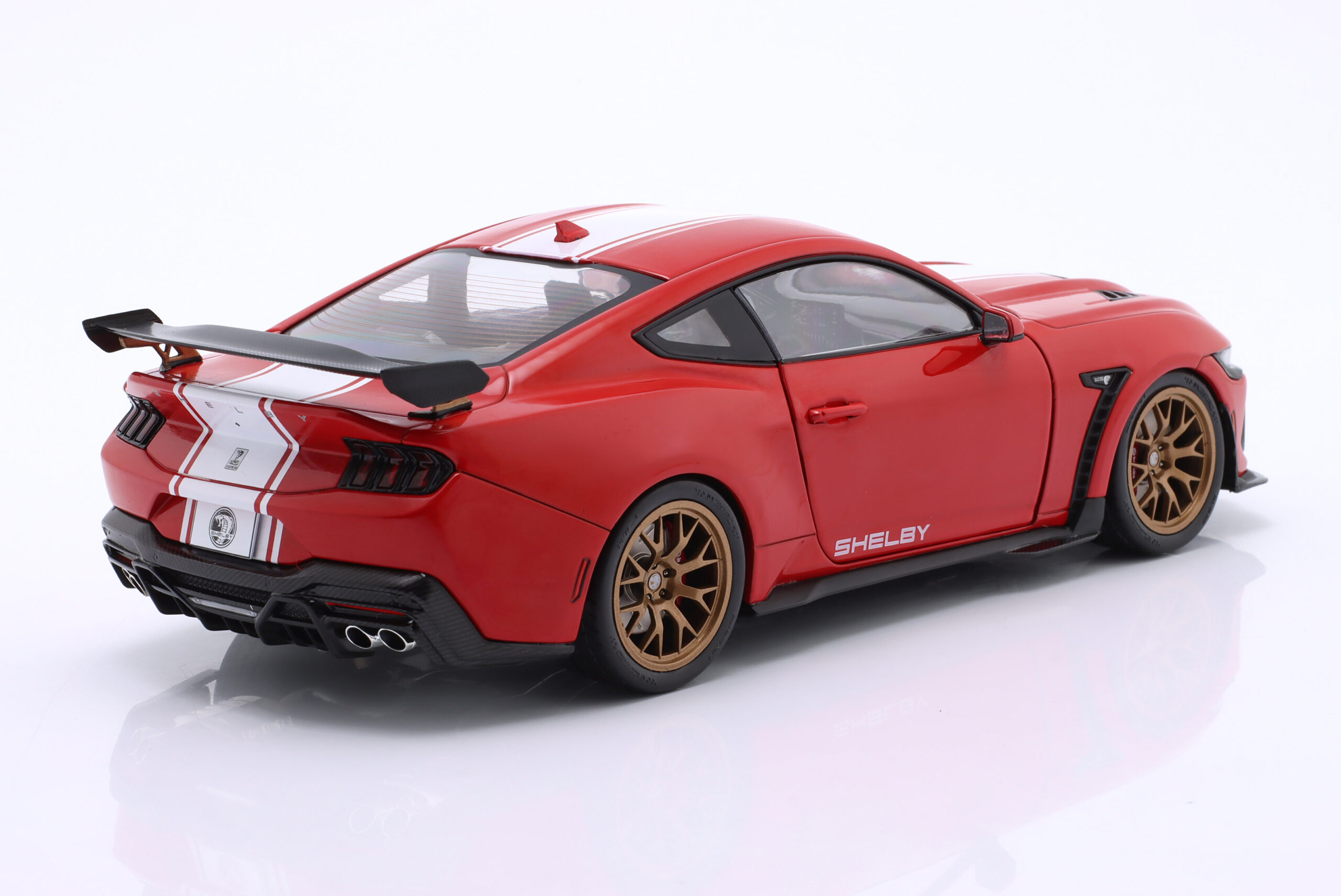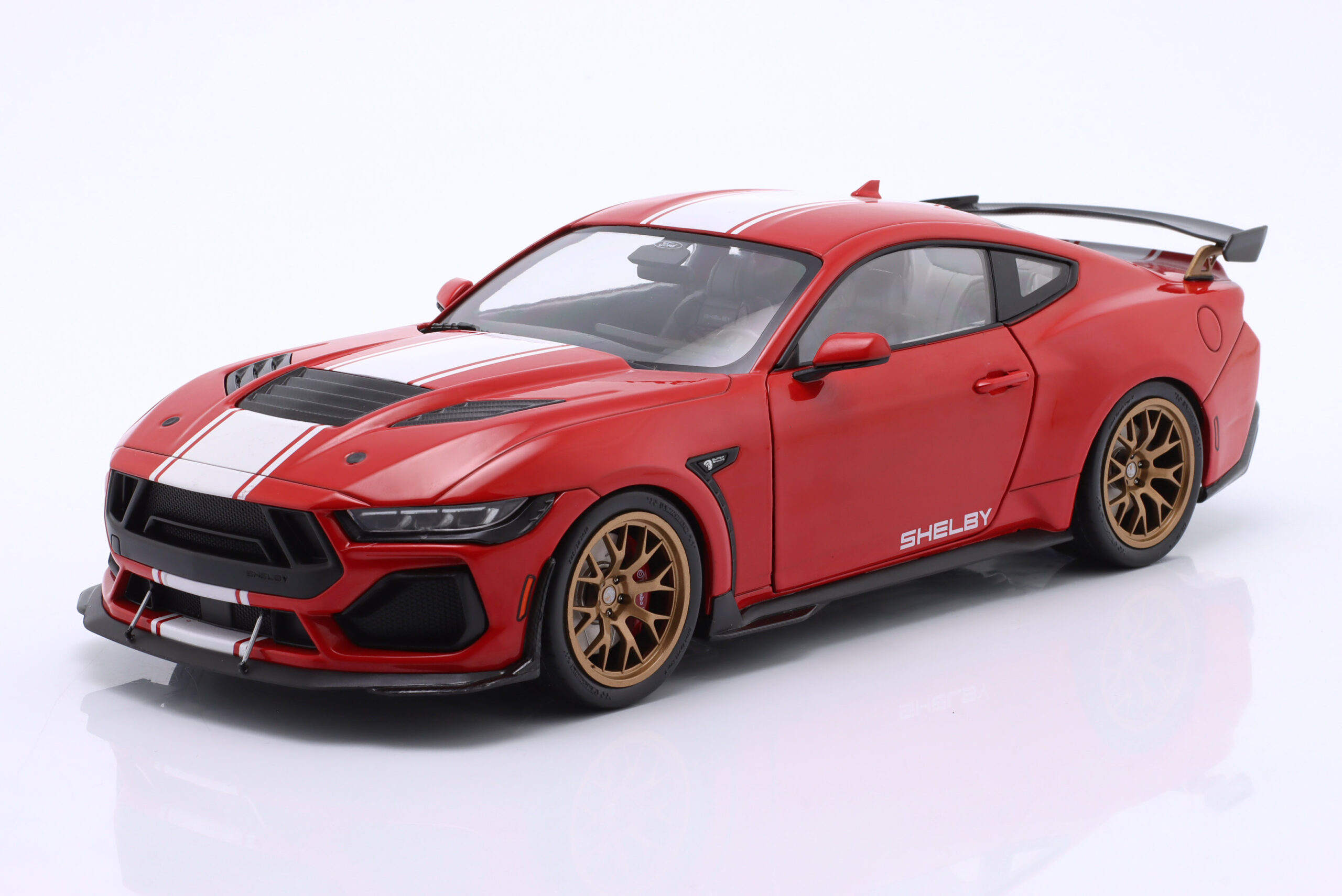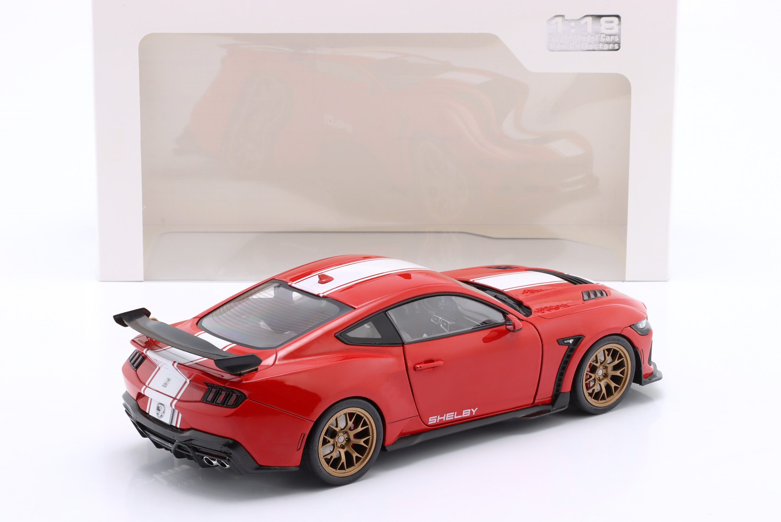 Kolekcjonerski model metalowy z elementami plastikowymi samochodu FORD SHELBY MUSTANG Super Snake z roku 2024 w kolorze Czerwonym z białymi pasami.Model posiada otwierane drzwi.
