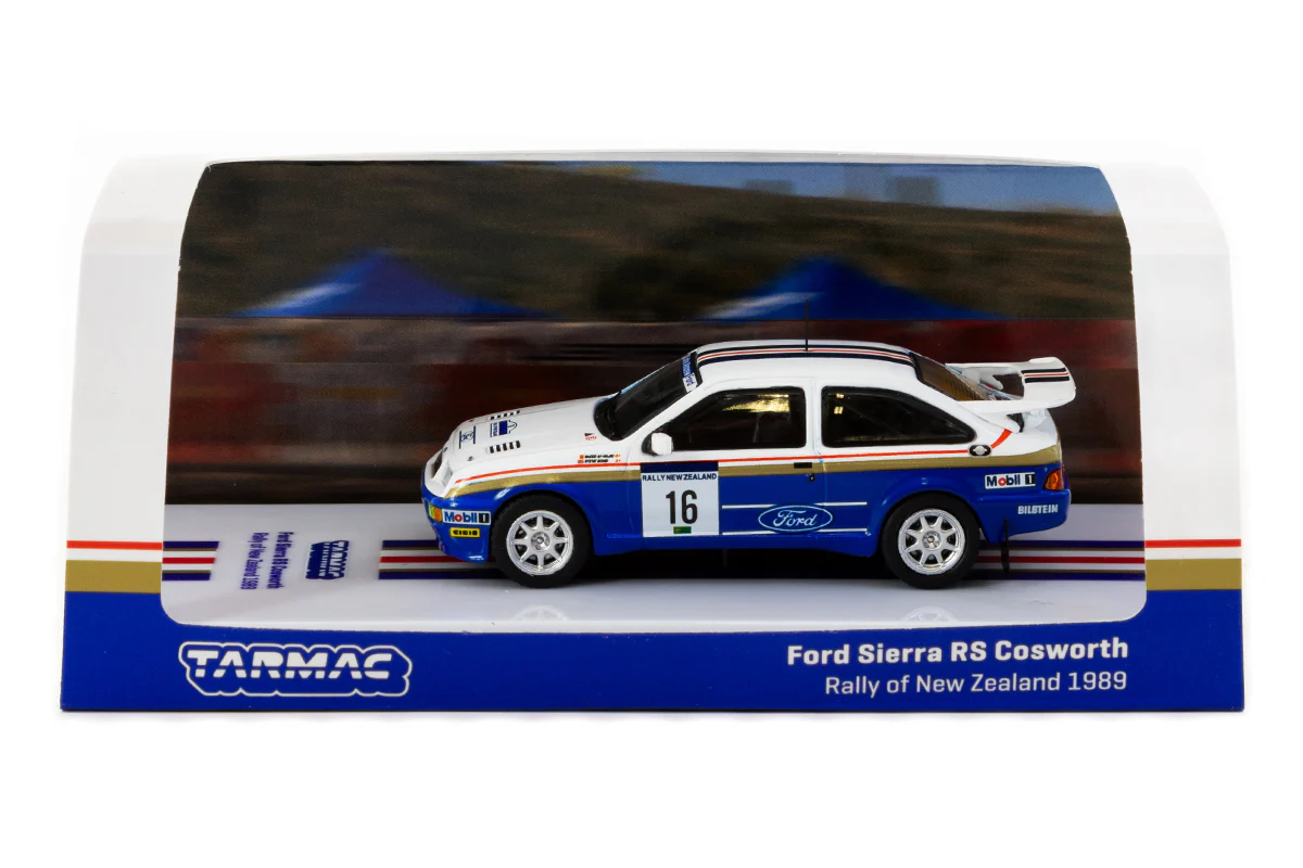 Kolekcjonerski model metalowy z elementami plastikowymi samochodu rajdowego FORD SIERRA RS Cosworth #16 w którym katarski kierowca S.Al-Hajri startował w Rajdzie Nowej Zelandii w roku 1989.Model na podstawce,posiada akrylową gablotkę ekspozycyjną.