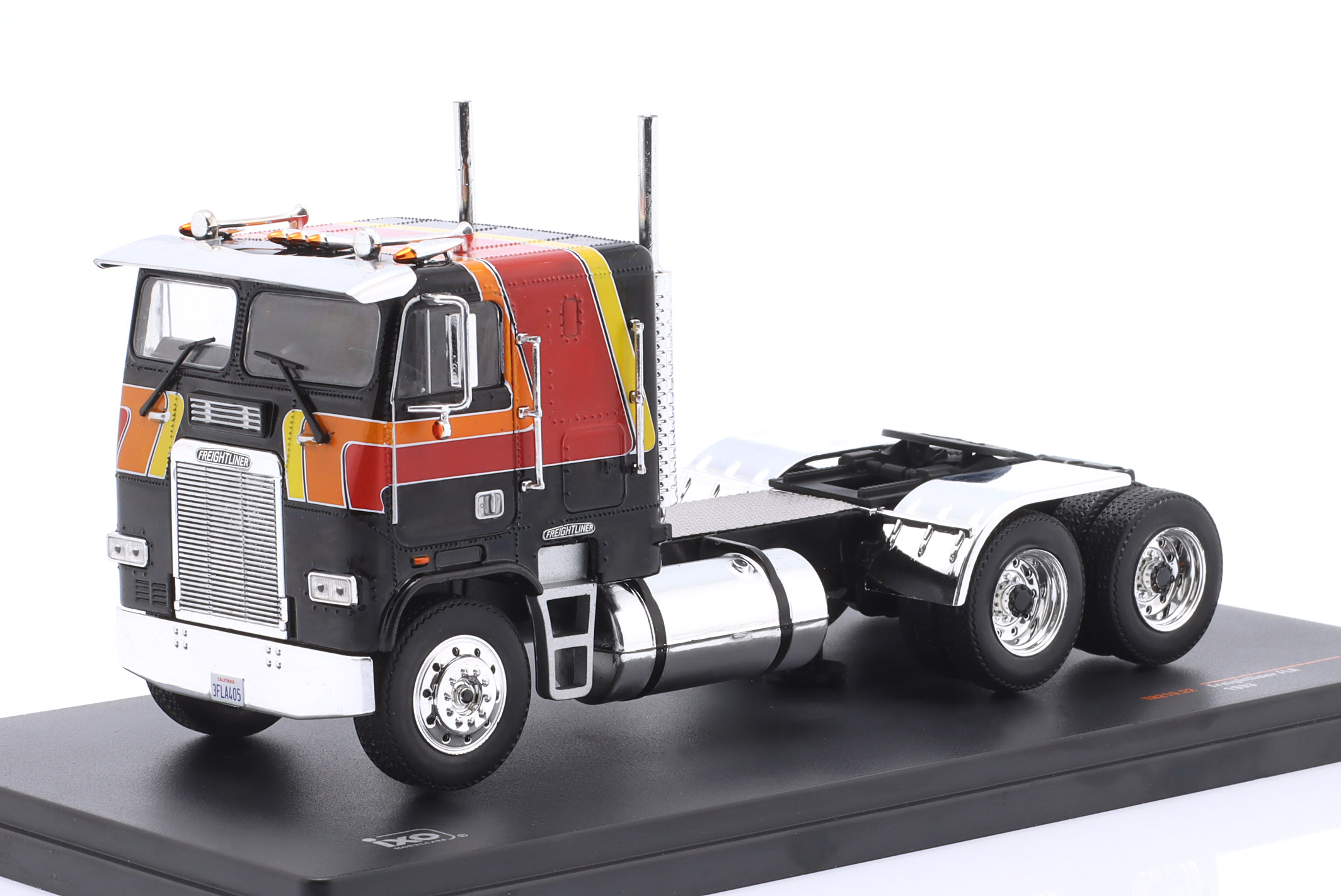 Kolekcjonerski model metalowy z elementami plastikowymi amerykańskiego ciągnika siodłowego FREIGHTLINER FLA z roku 1993 w kolorze Czarny/Czerwony.Model nie posiada otwieranych elementów.Model na plastikowej podstawce,zapakowany w kartonowe pudełko z witrynką.