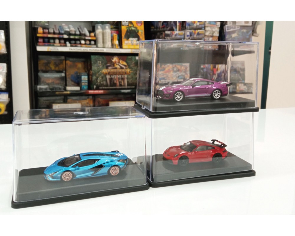 Zestaw 10-ciu gablotek ekspozycyjnych do modeli w skali 1:64.Wymiary gablotek:długść 11,9 cm szerokość 6,4 cm,wysokość zewnętrzna 6,9 cm,wyskość wewnętrzna 5,7 cm.Zestaw zapakowany w kartonowe pudełko.