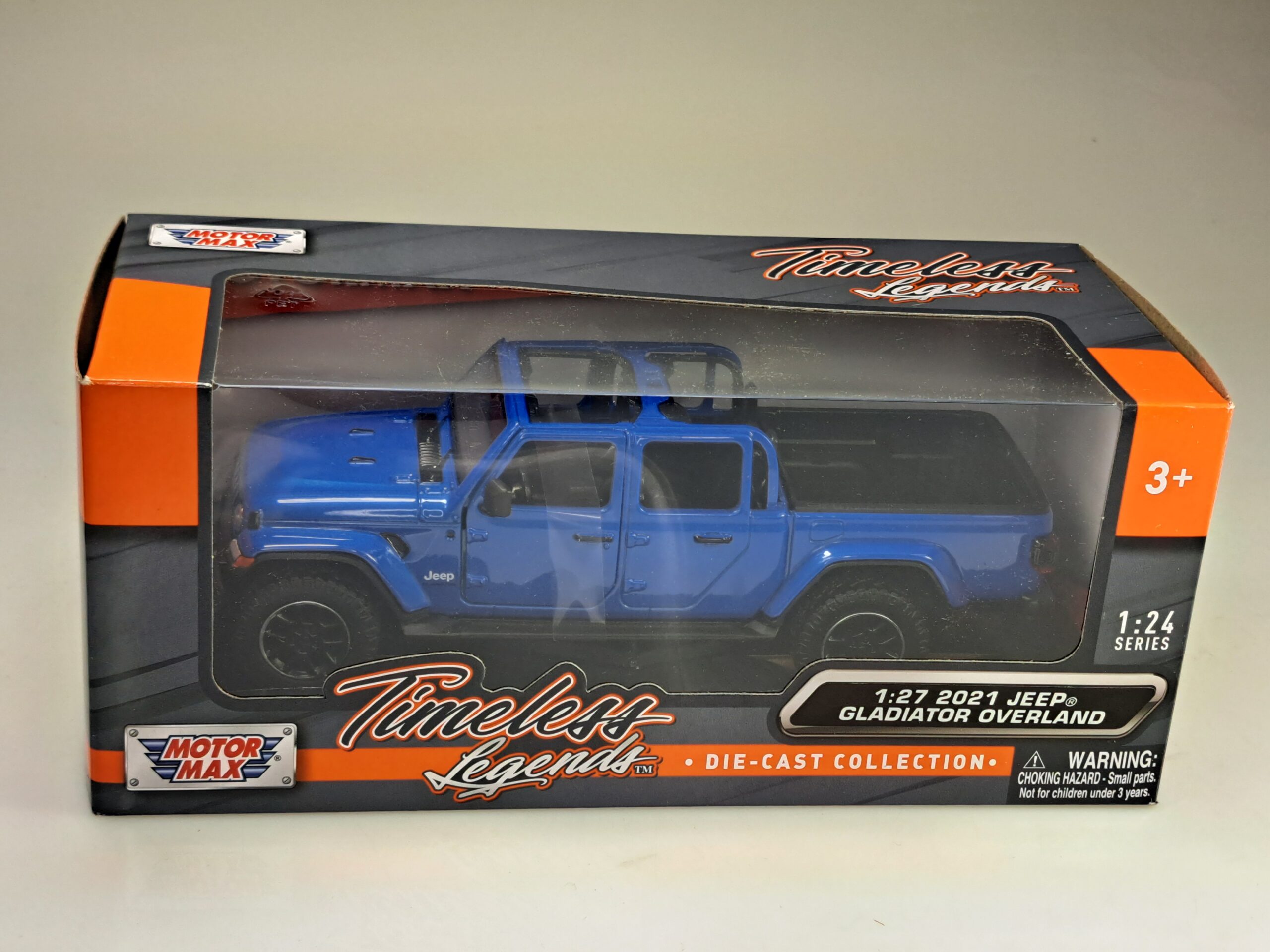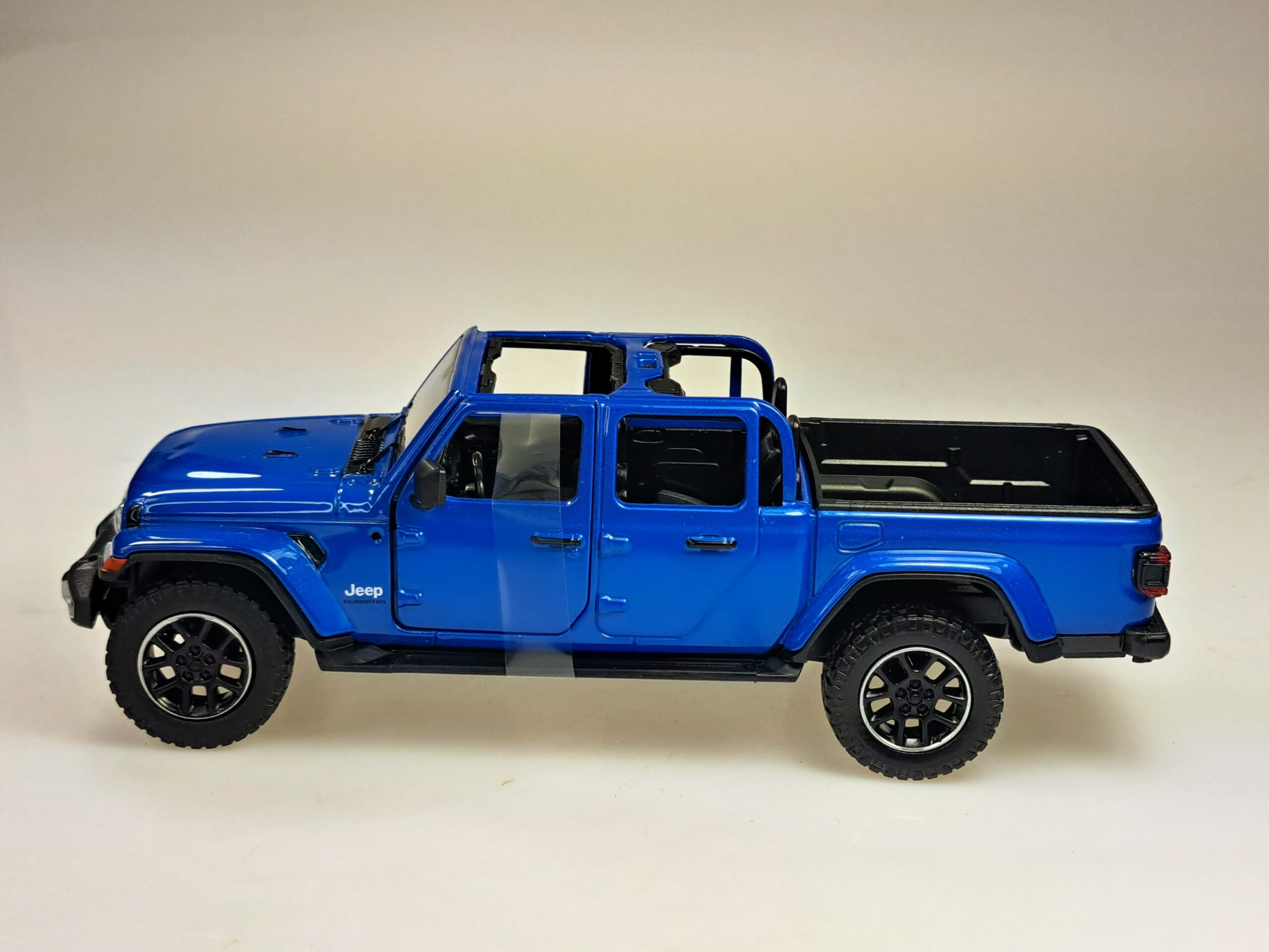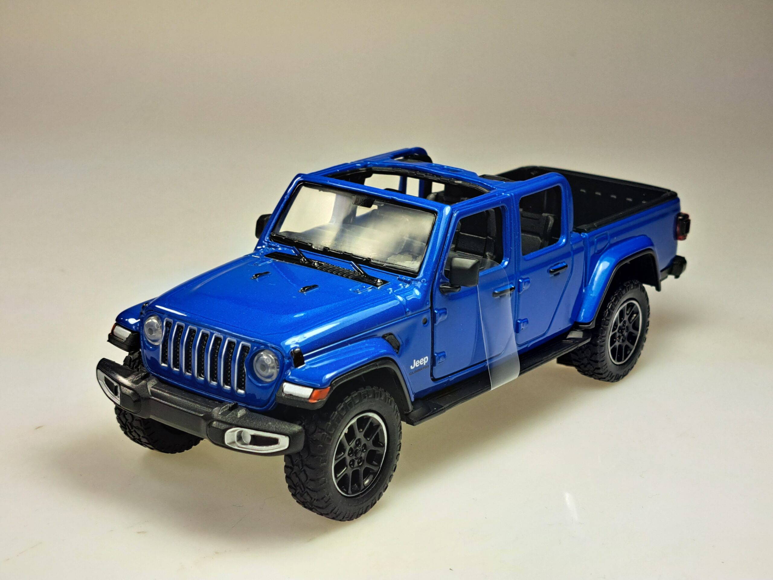Kolekcjonerski model metalowy z elementami plastikowymi samochodu JEEP GLADIATOR OVERLAND z roku 2021 w kolorze Niebieski metallic.Posiada otwierane drzwi.Model zapakowany w kartonowe pudełko witrynką.