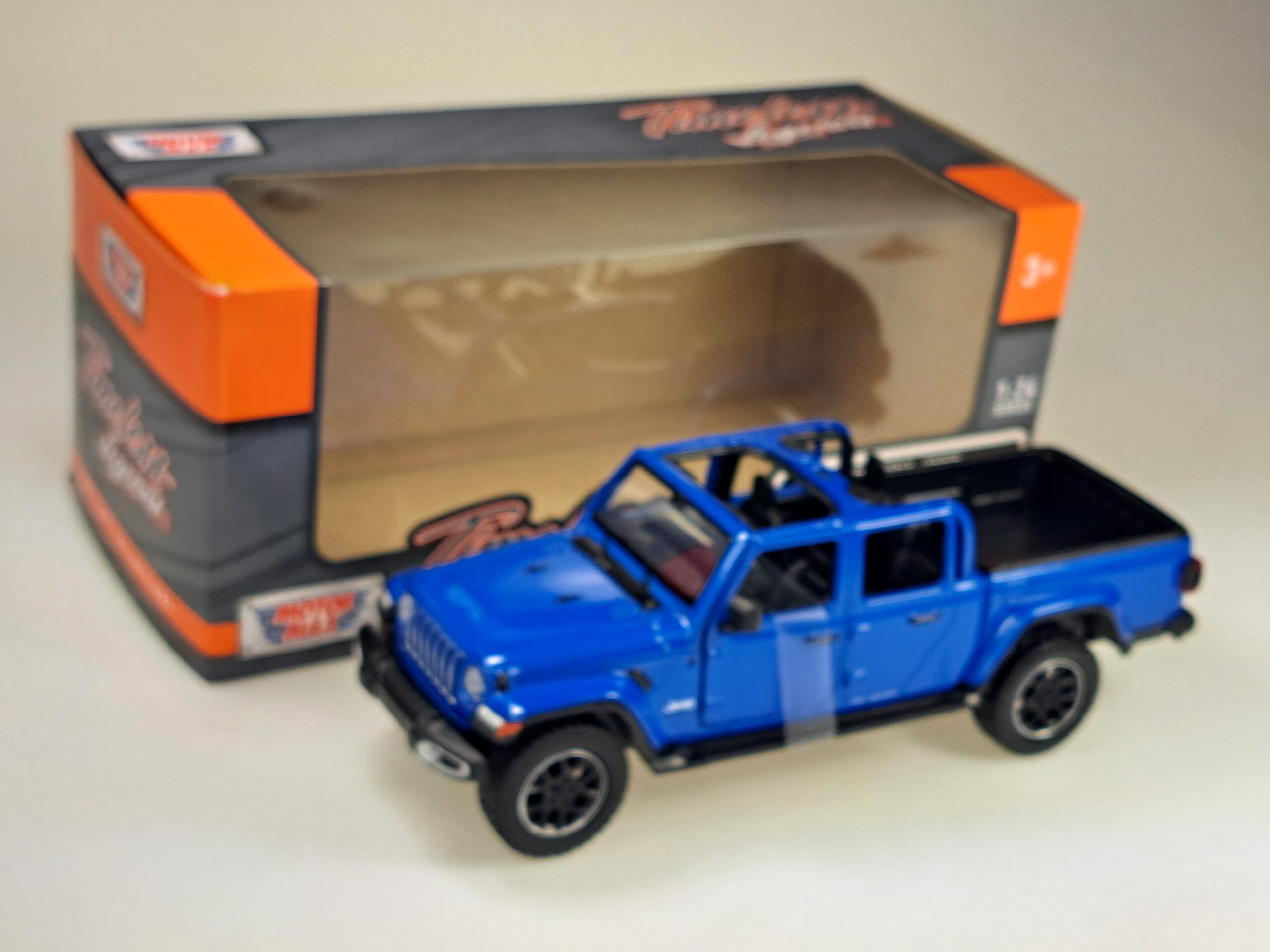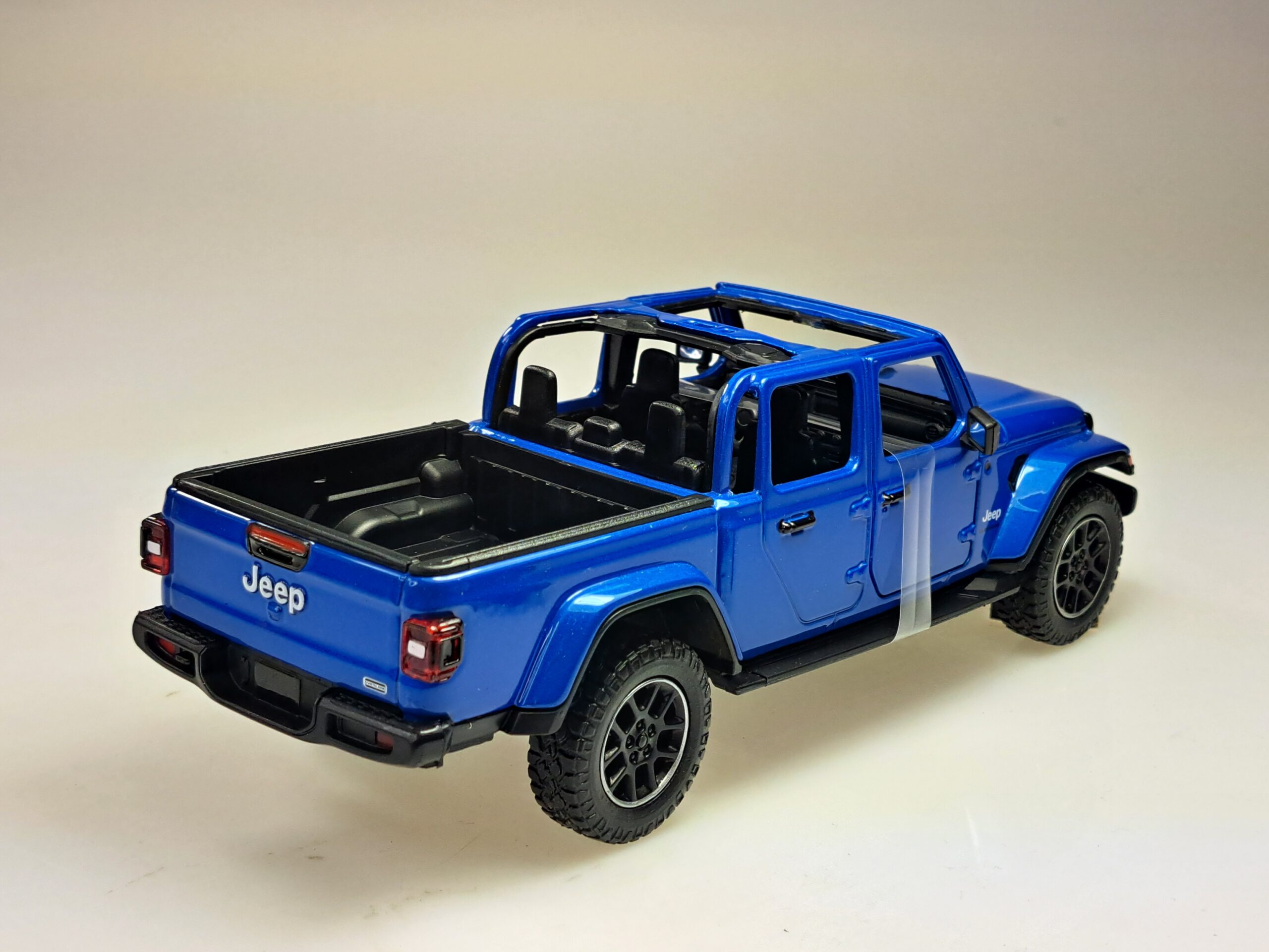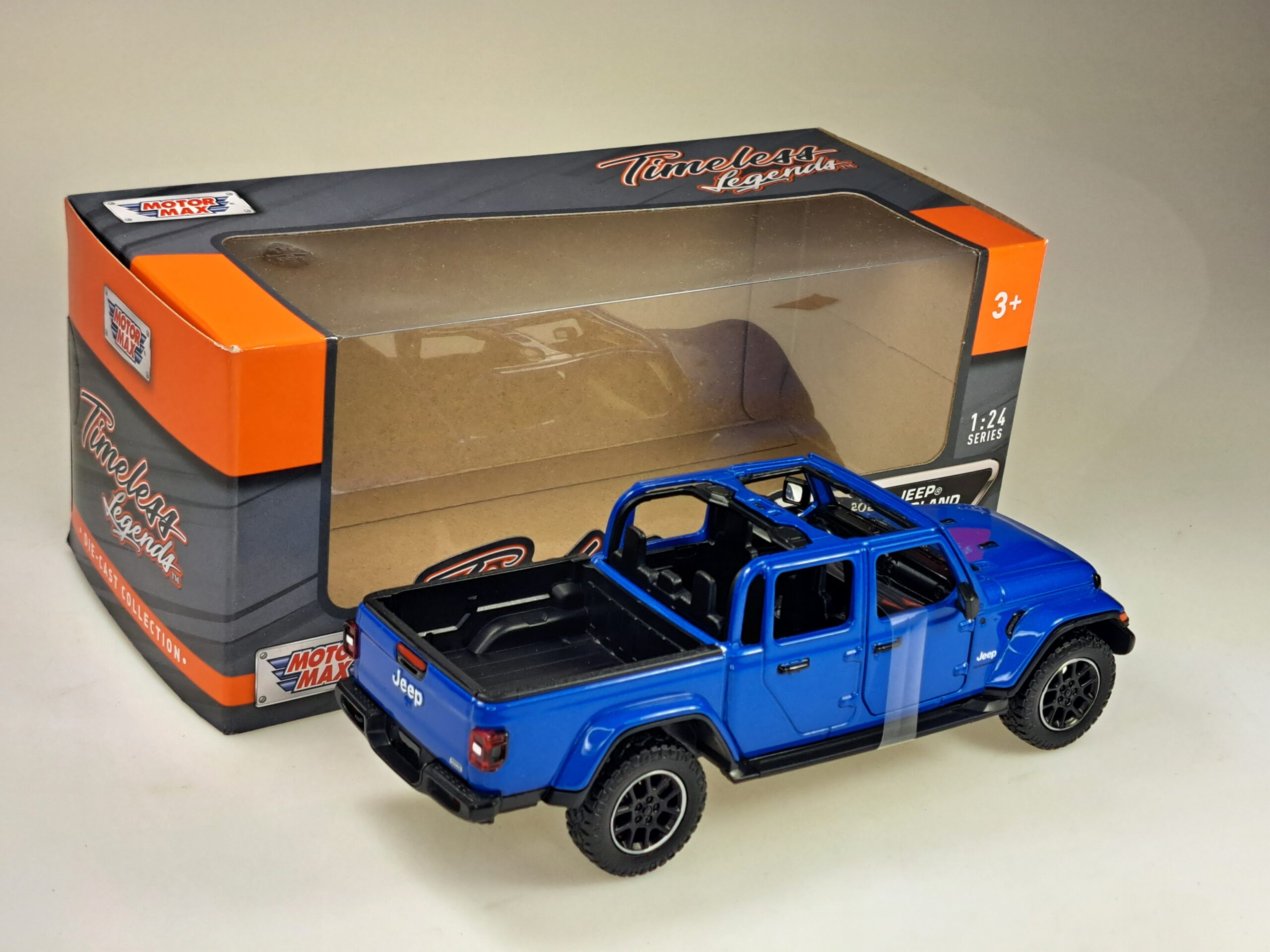 Kolekcjonerski model metalowy z elementami plastikowymi samochodu JEEP GLADIATOR OVERLAND z roku 2021 w kolorze Niebieski metallic.Posiada otwierane drzwi.Model zapakowany w kartonowe pudełko witrynką.