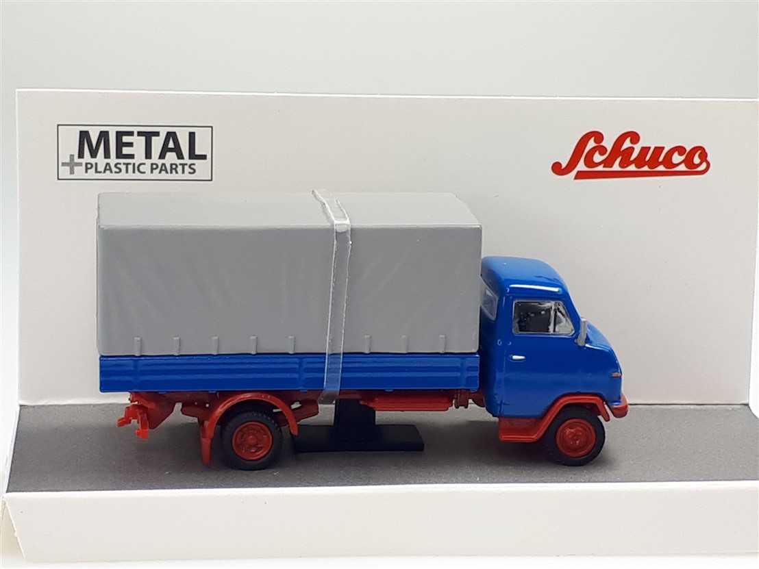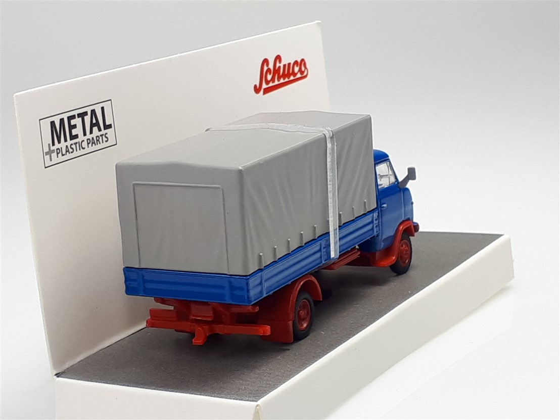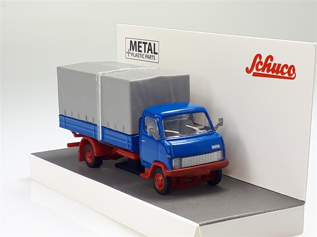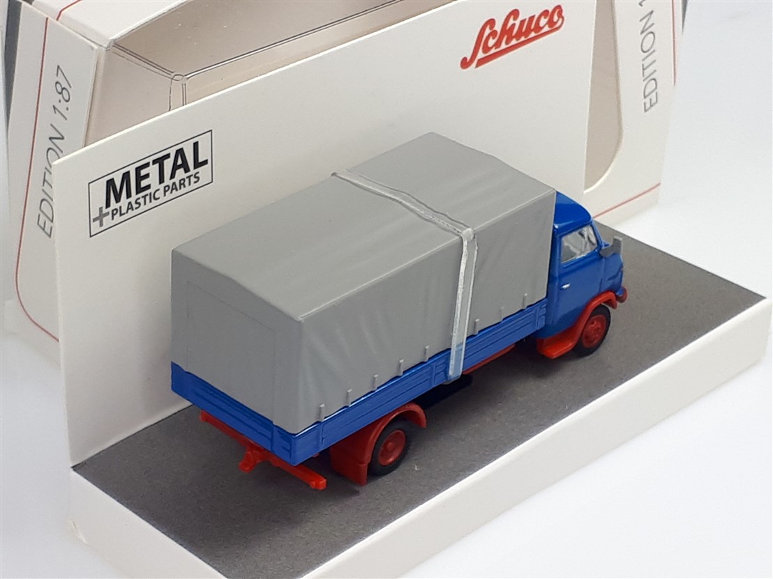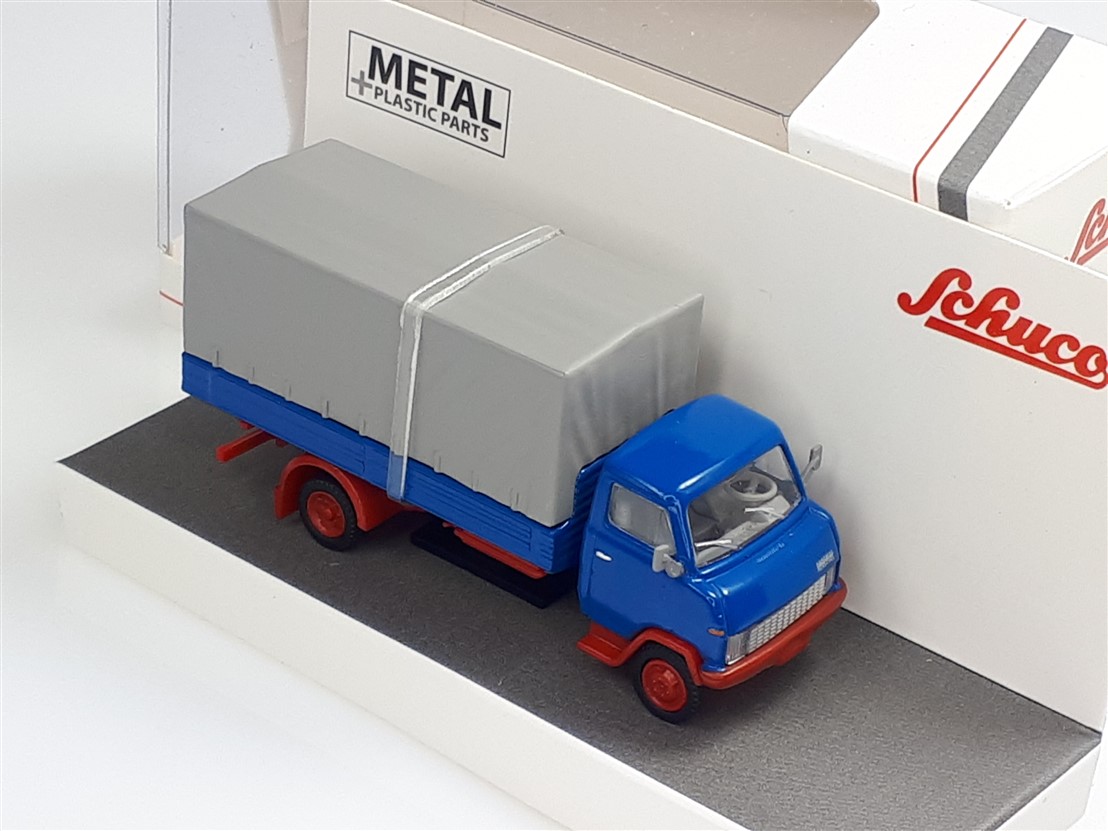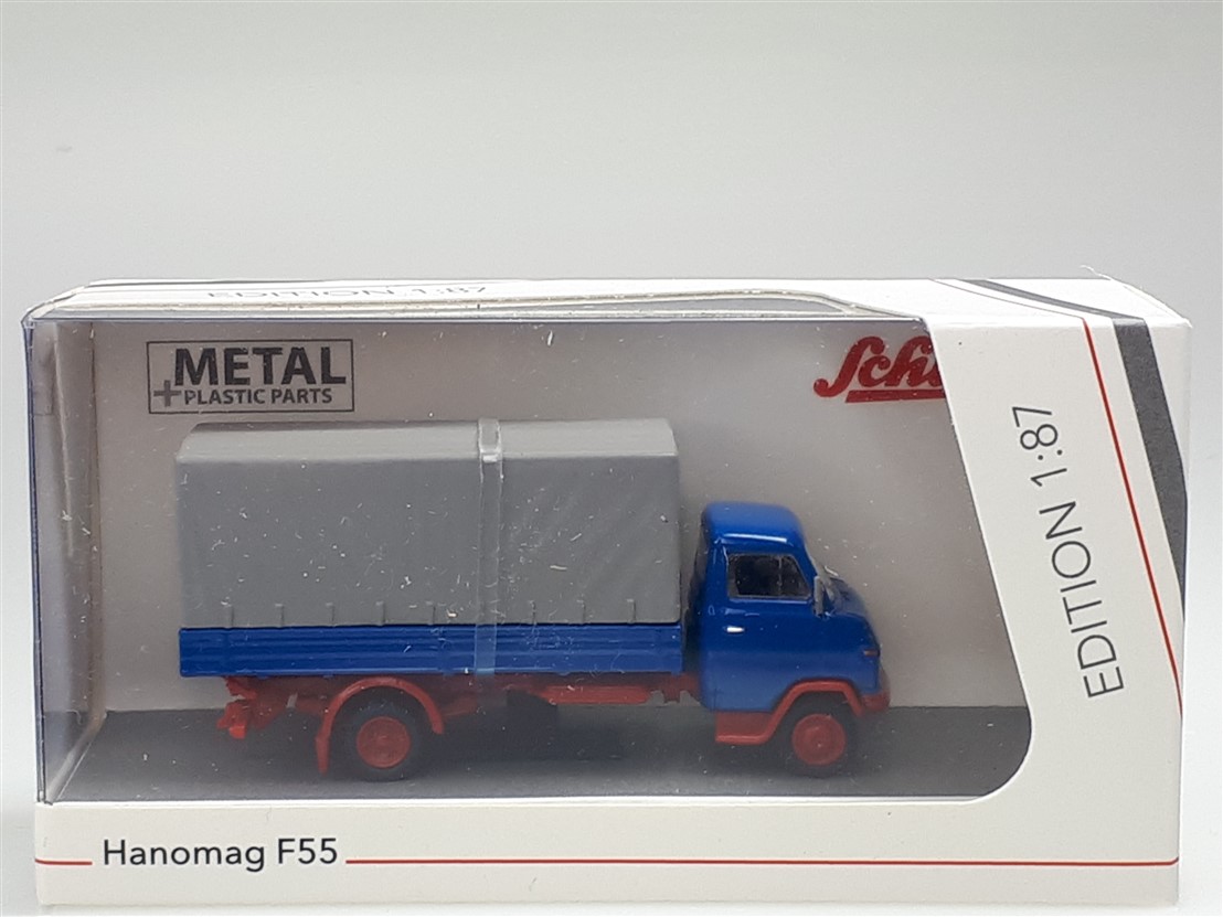 Kolekcjonerski model wmetalowy z elementami plastikowymi samochodu ciężarowego HANOMAG F55 w wersji skrzyniowej z plandeką z roku 1969 w kolorze Niebieskim.