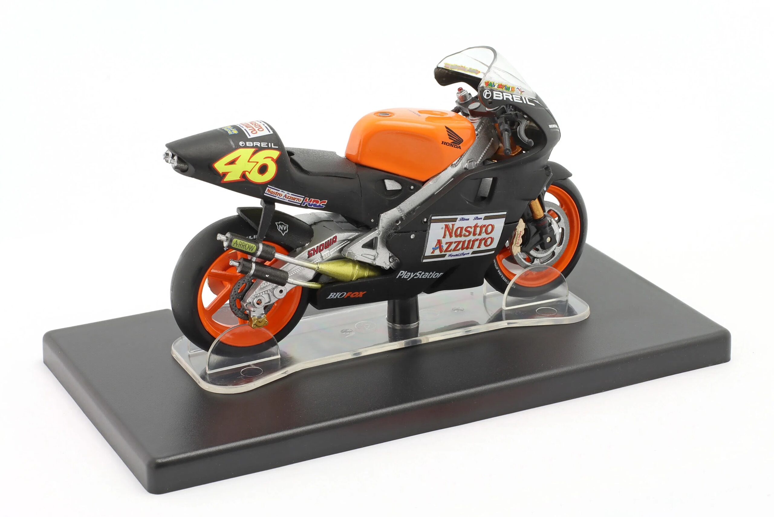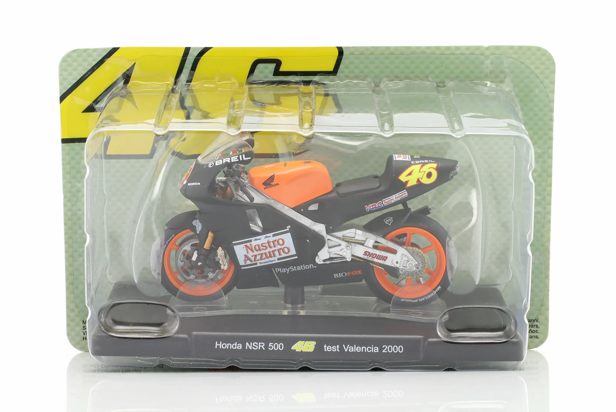 Kolekcjonerski model metalowy z elementami plastikowymi motocykla wyścigowego HONDA NSR 500 #46,który Valentino Rossi testował na Torze Valencji w roku 2000.Model z serii VALENTINO ROSSI Colection.Model na podstawce,zapakowany w blister.