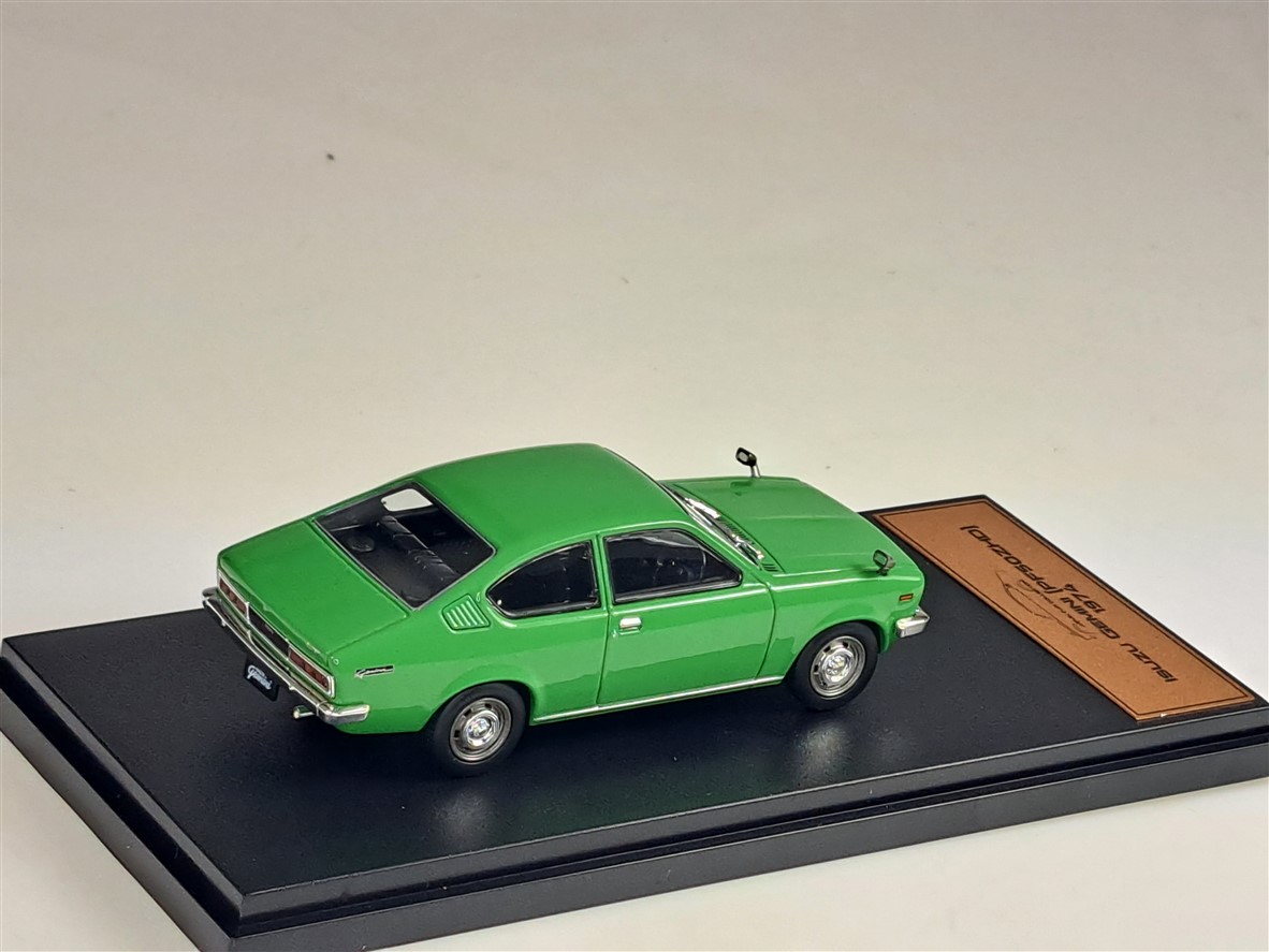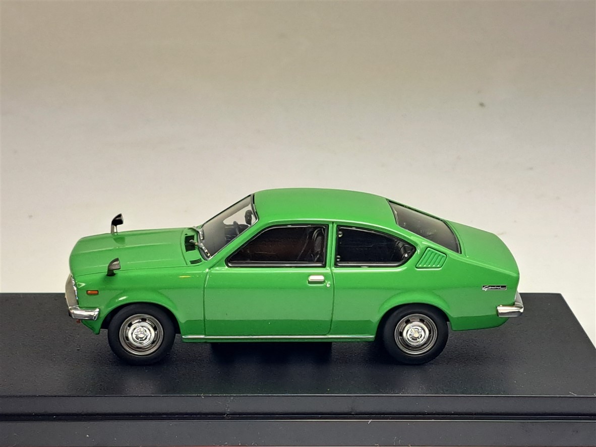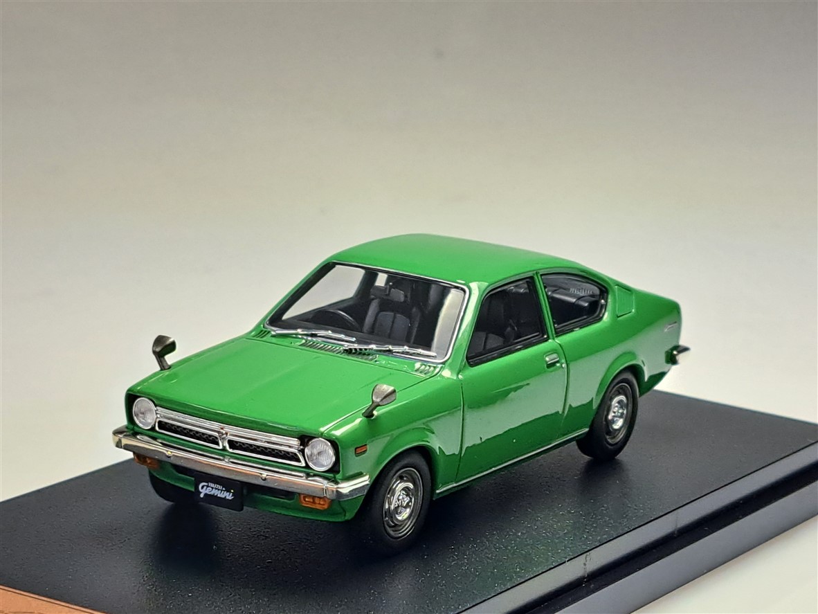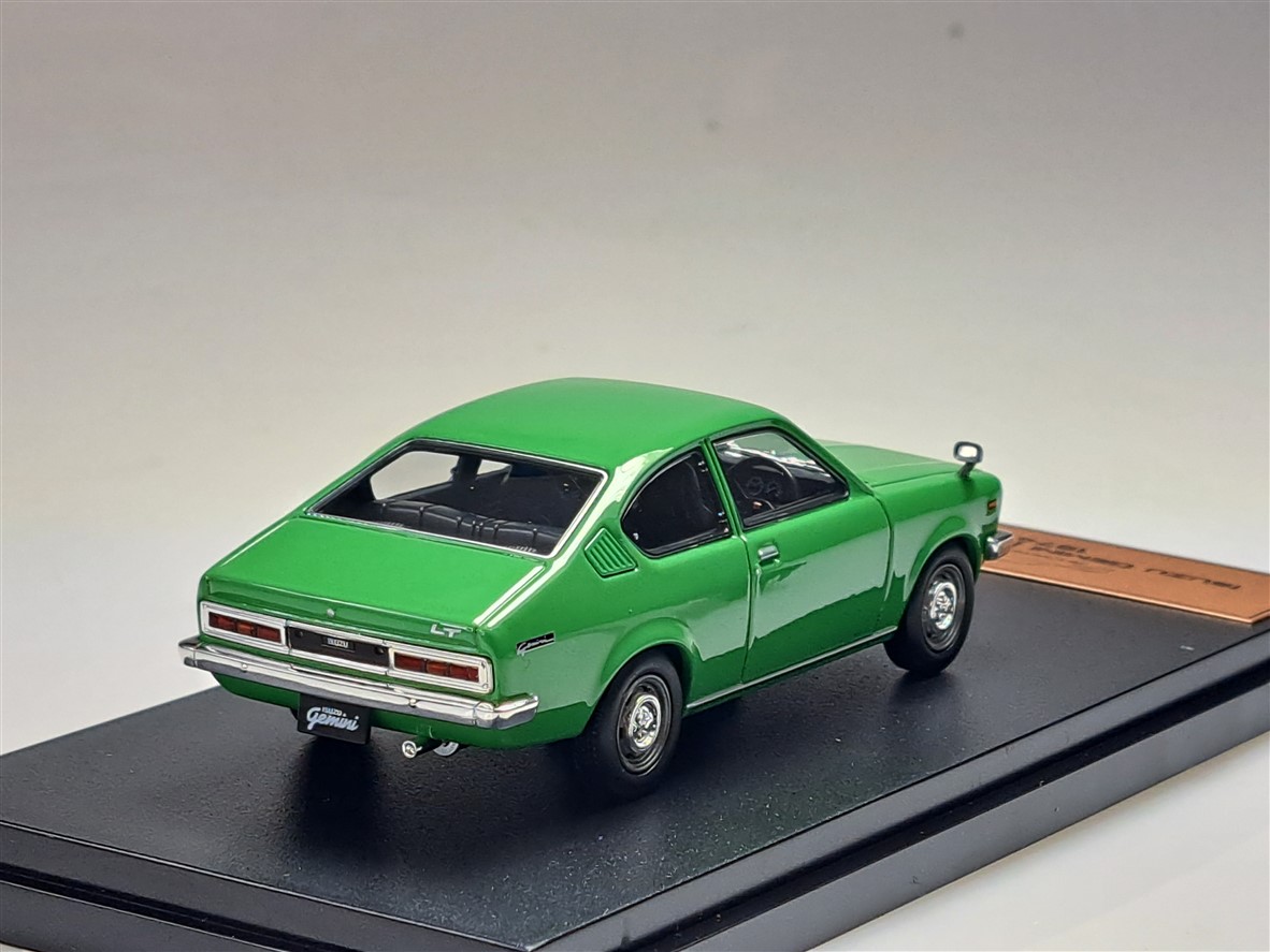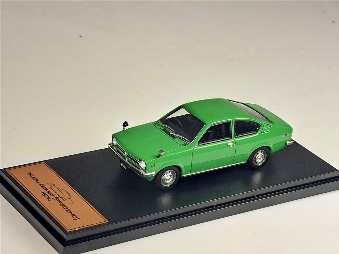 Kolekcjonerski model metalowy z elementami plastikowymi samochodu ISUZU GEMINI z roku 1974 w kolorze Zielonym.Model na podstawce,posiada akrylową gablotkę ekspozycyjną