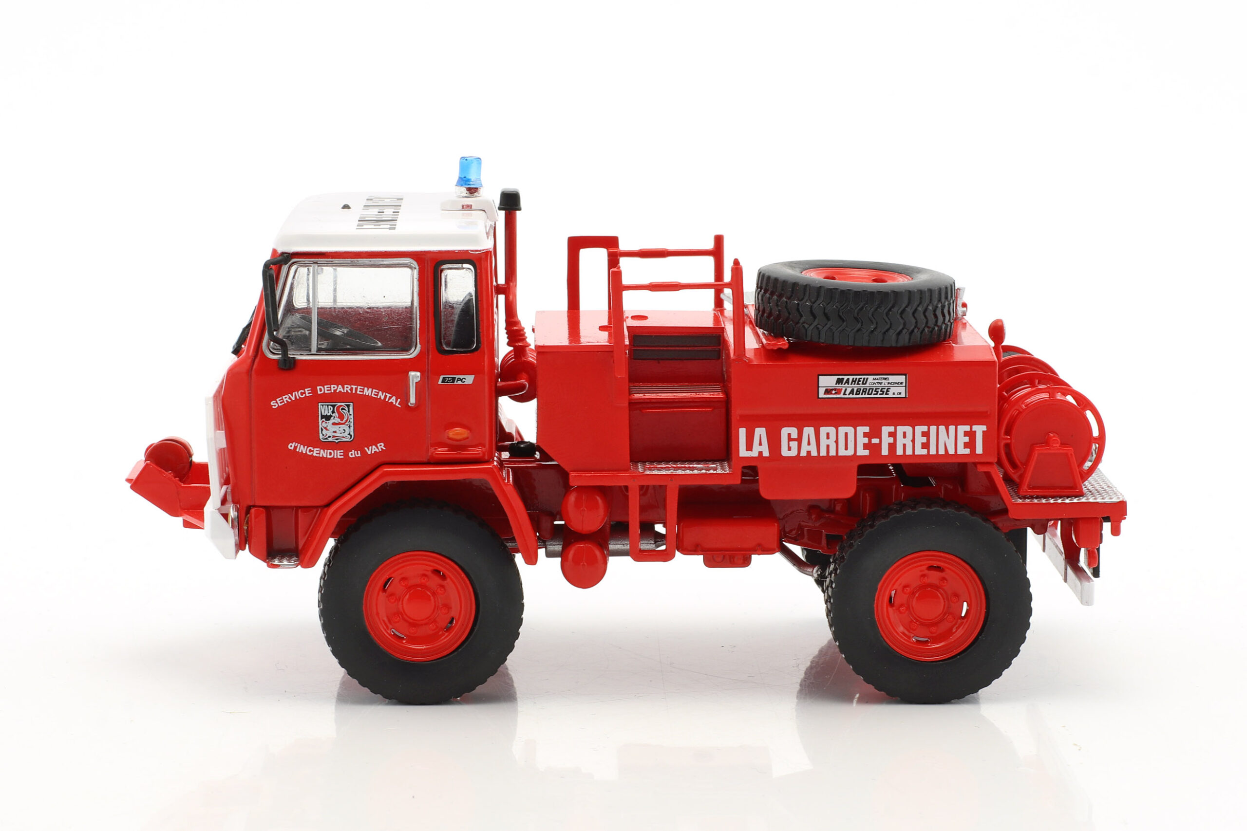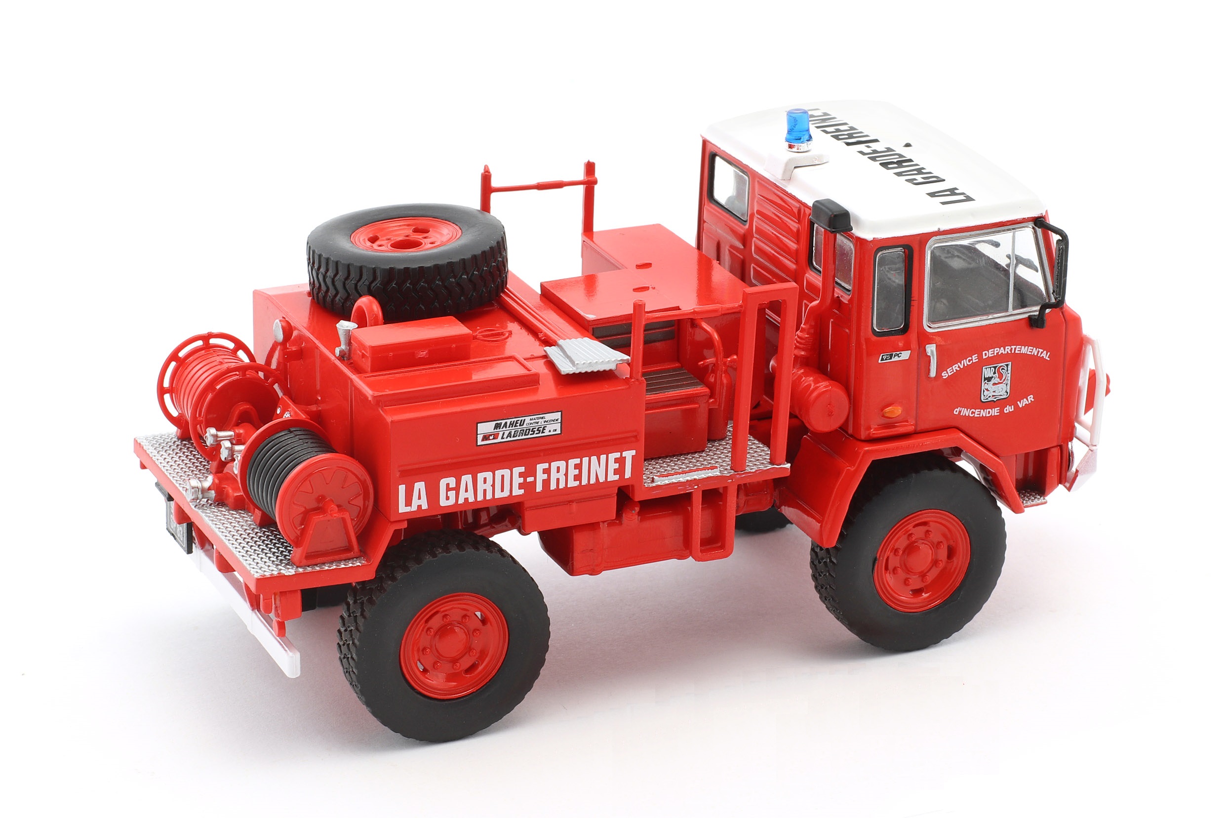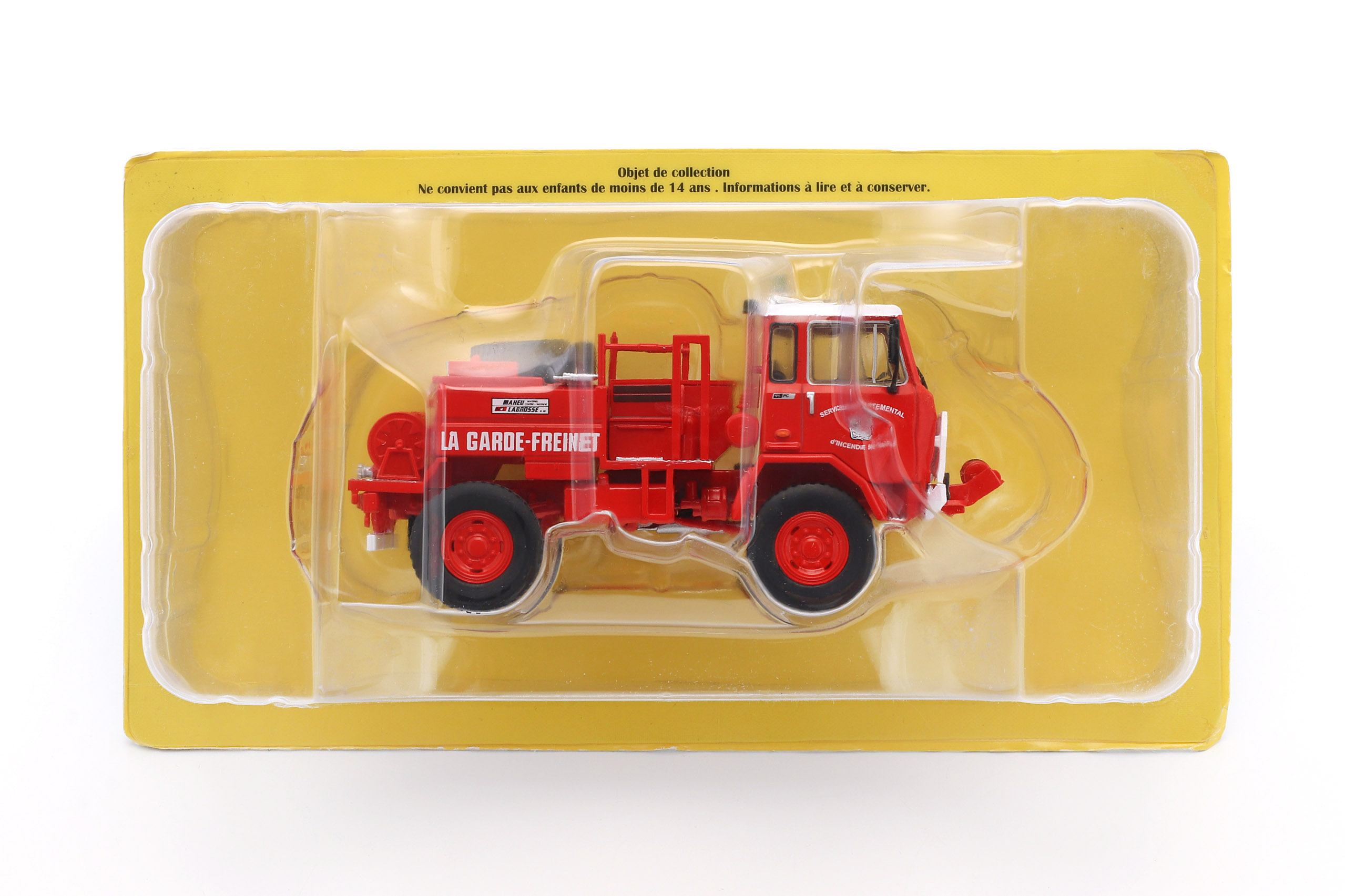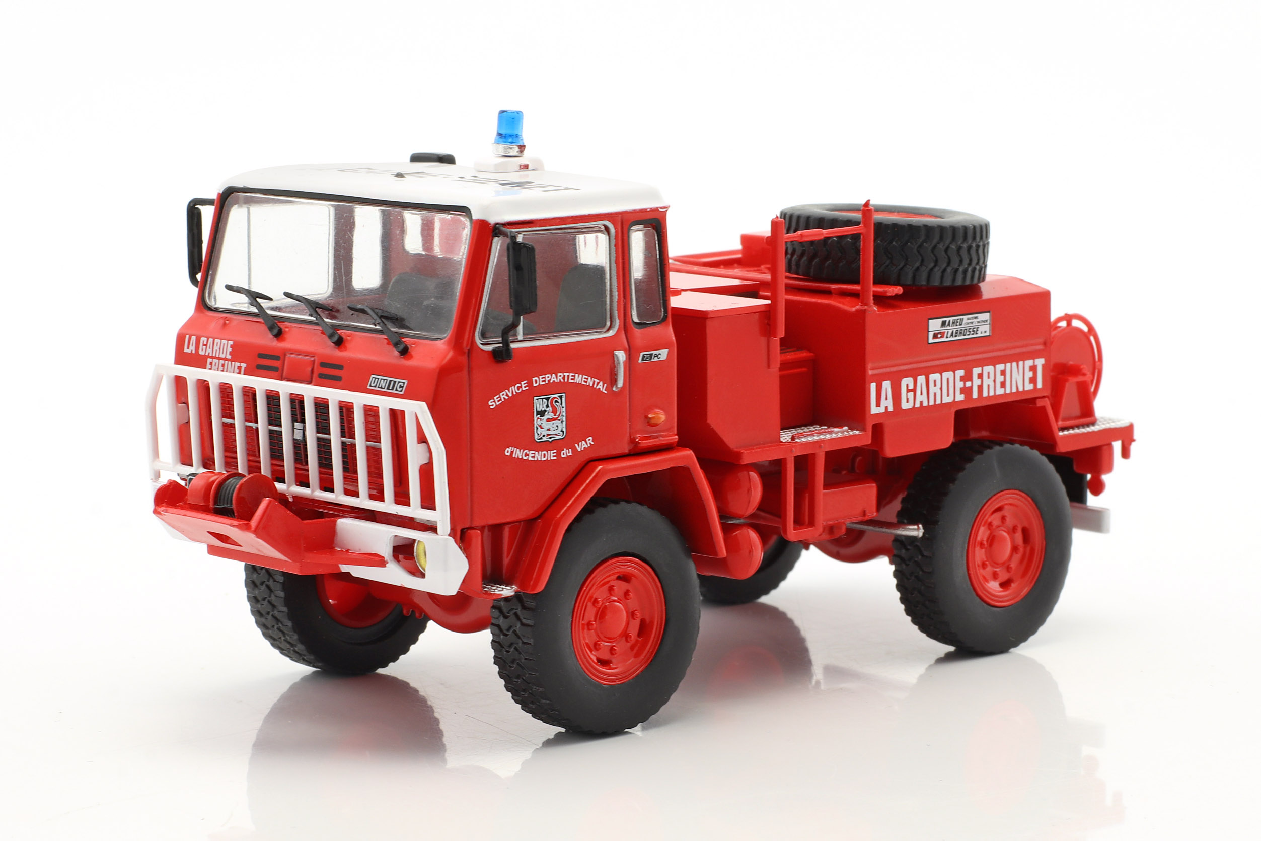 Kolekcjonerski model metalowy z elementami plastikowymi samochodu strażackiego IVECO UNIC 75PC w malowaniu francuskiej Straży pożarnej.Model zapakowany w blister.