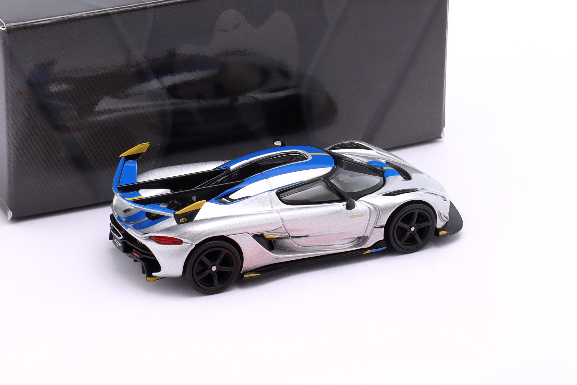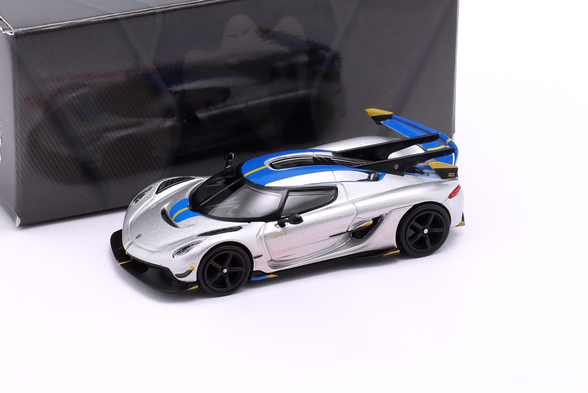 Kolekcjonerski model metalowy z elementami plastikowymi samochodu KOENIGSEGG JESKO ATTACK w kolorze Srebrnym.Model zapakowany w kartonowe pudełko z rysunkiem samochodu.