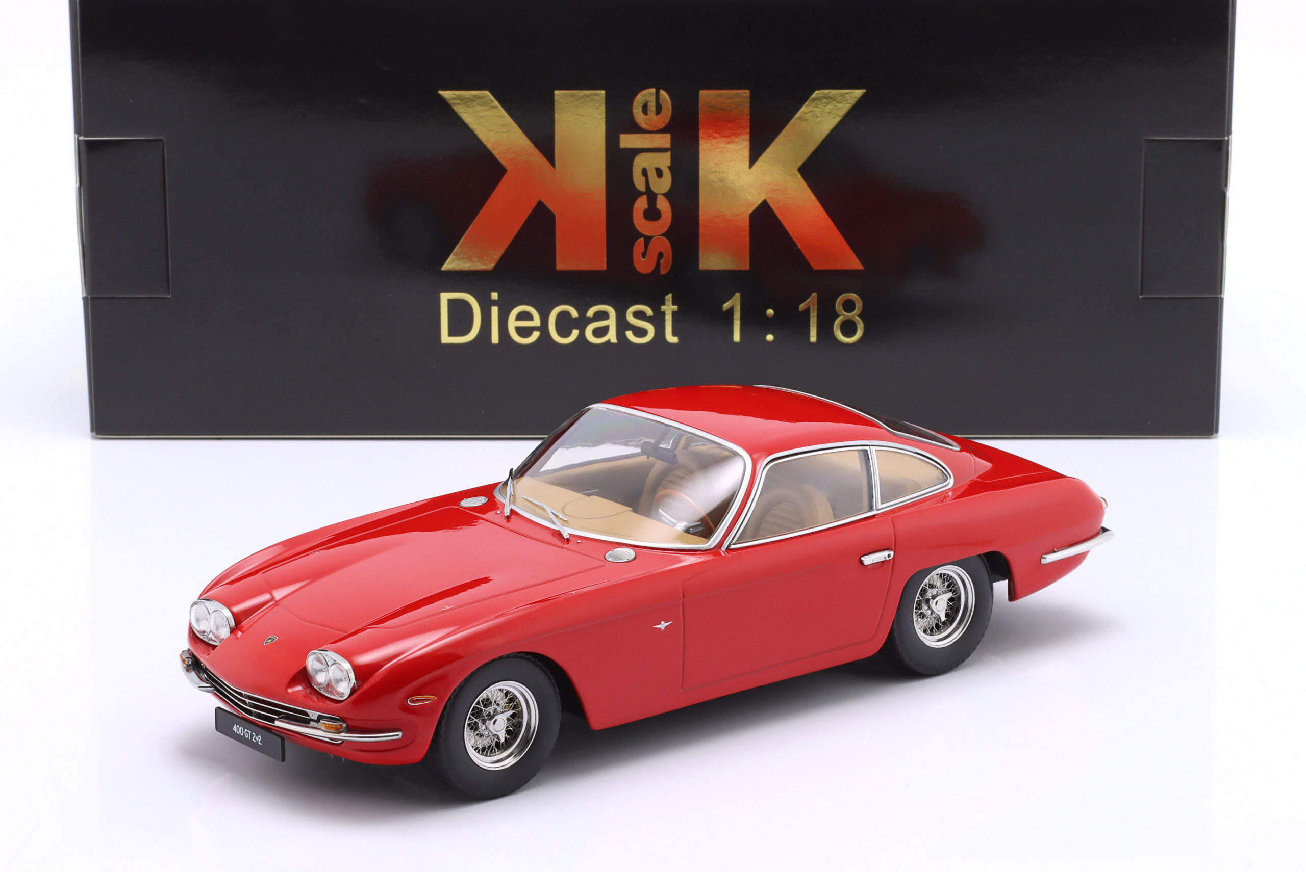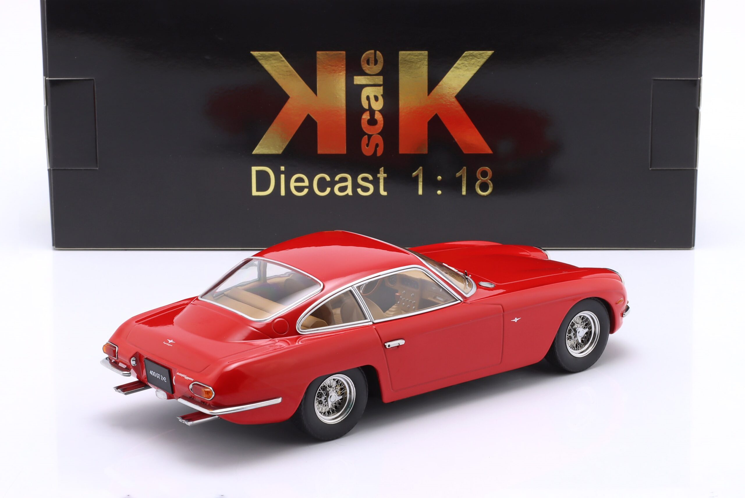 Kolekcjonerski model metalowy z elementami plastikowymi samochodu LAMBORGHINI 400 GT 2+2 z roku 1966 w kolorze Czerwonym. Model nie posiada otwieranych elementów.