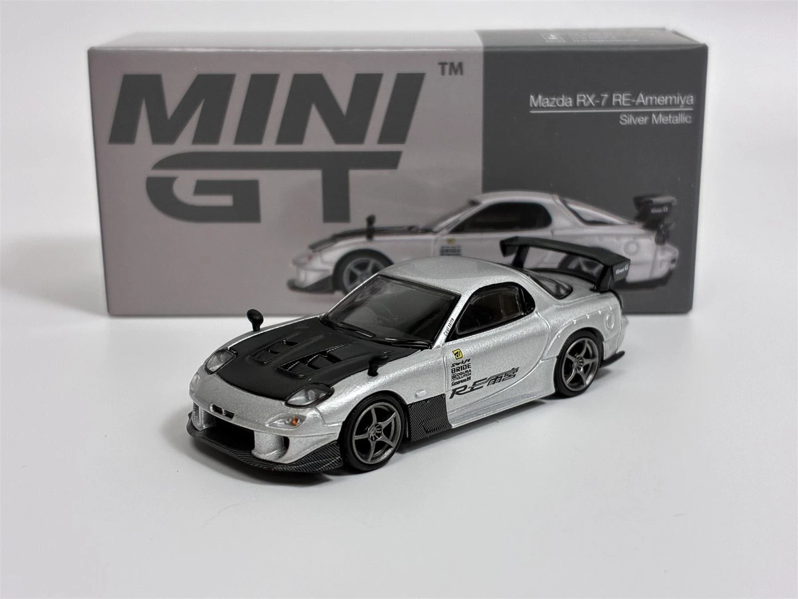 Kolekcjonerski model metalowy z elementami plastikowymi samochodu MAZDA RX-7 RE-Amemiya roku 2004 w kolorze Srebrnym.Model zapakowany w kartonowe pudełko z wizerunkiem samochodu.