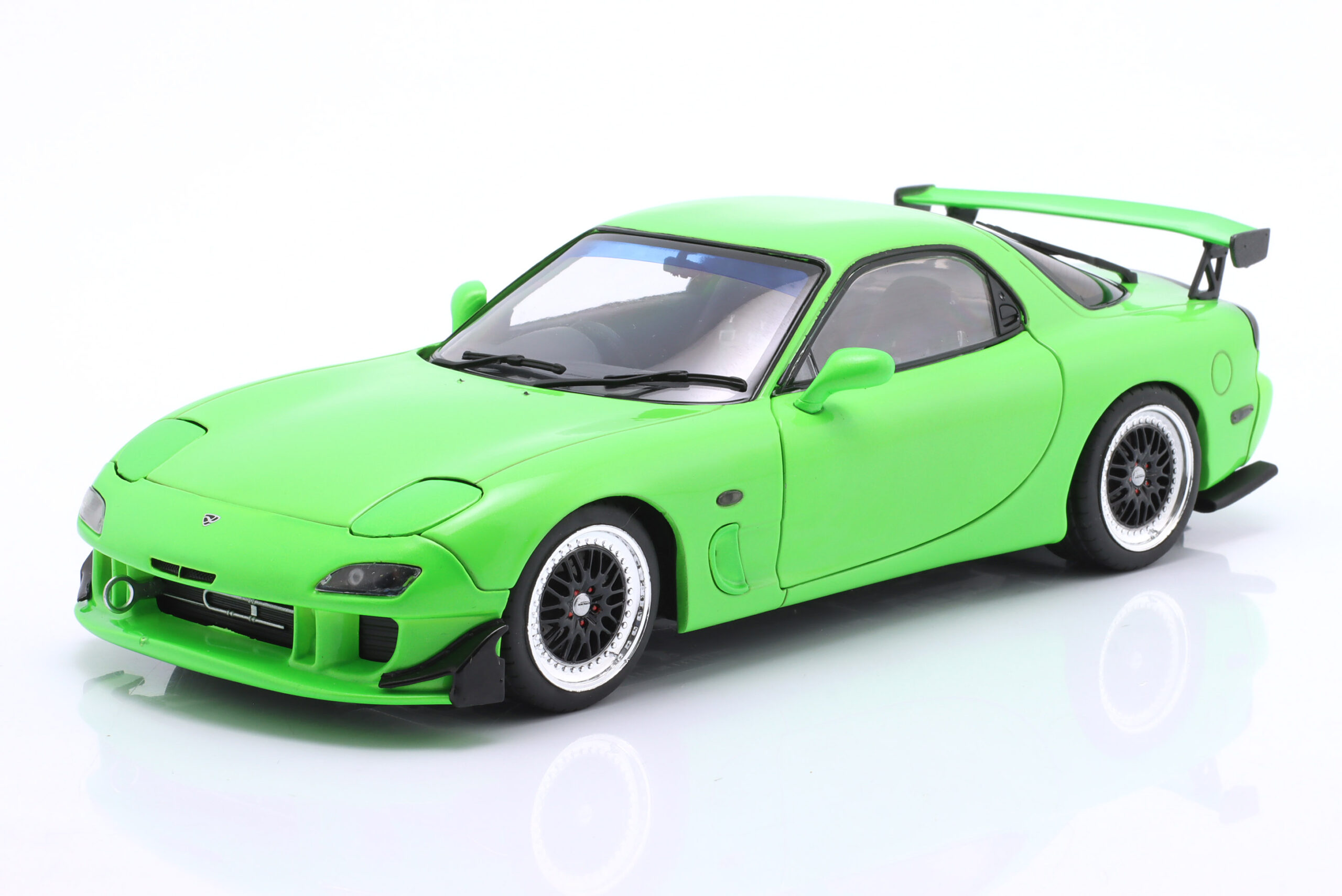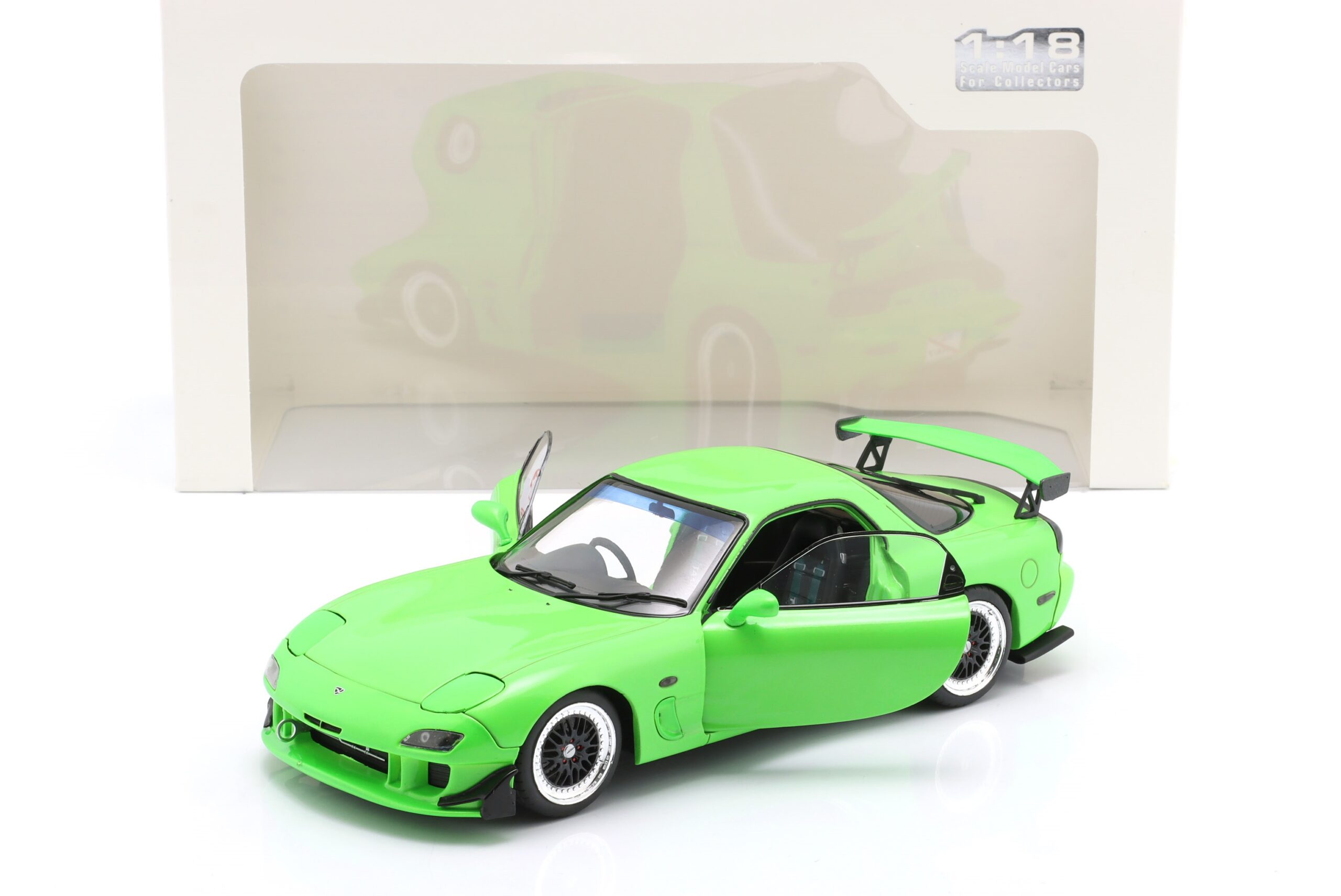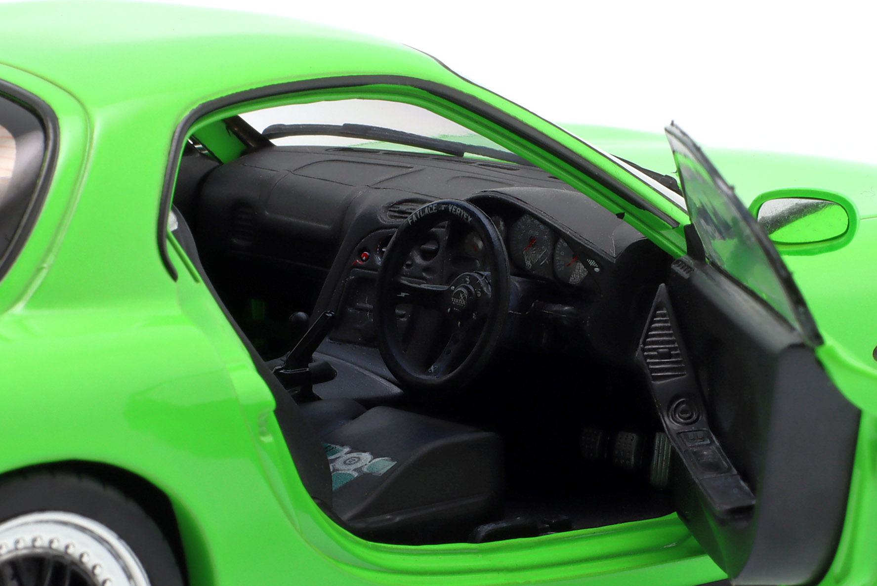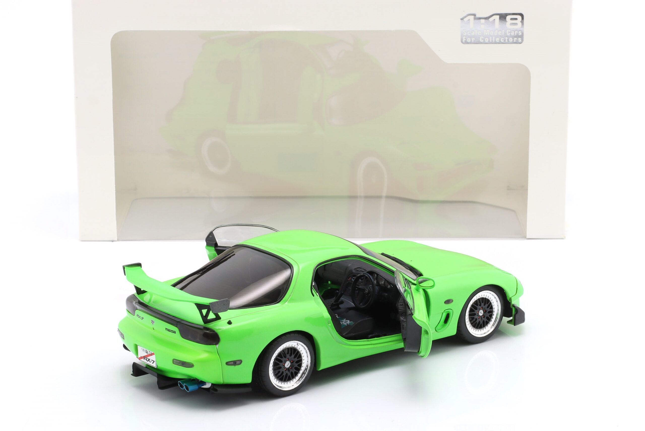 Kolekcjonerski model metalowy z elementami plastikowymi samochodu MAZDA RX-7 Type RS (FD35) z roku 1999 w kolorze Neon green.Model posiada otwierane drzwi.