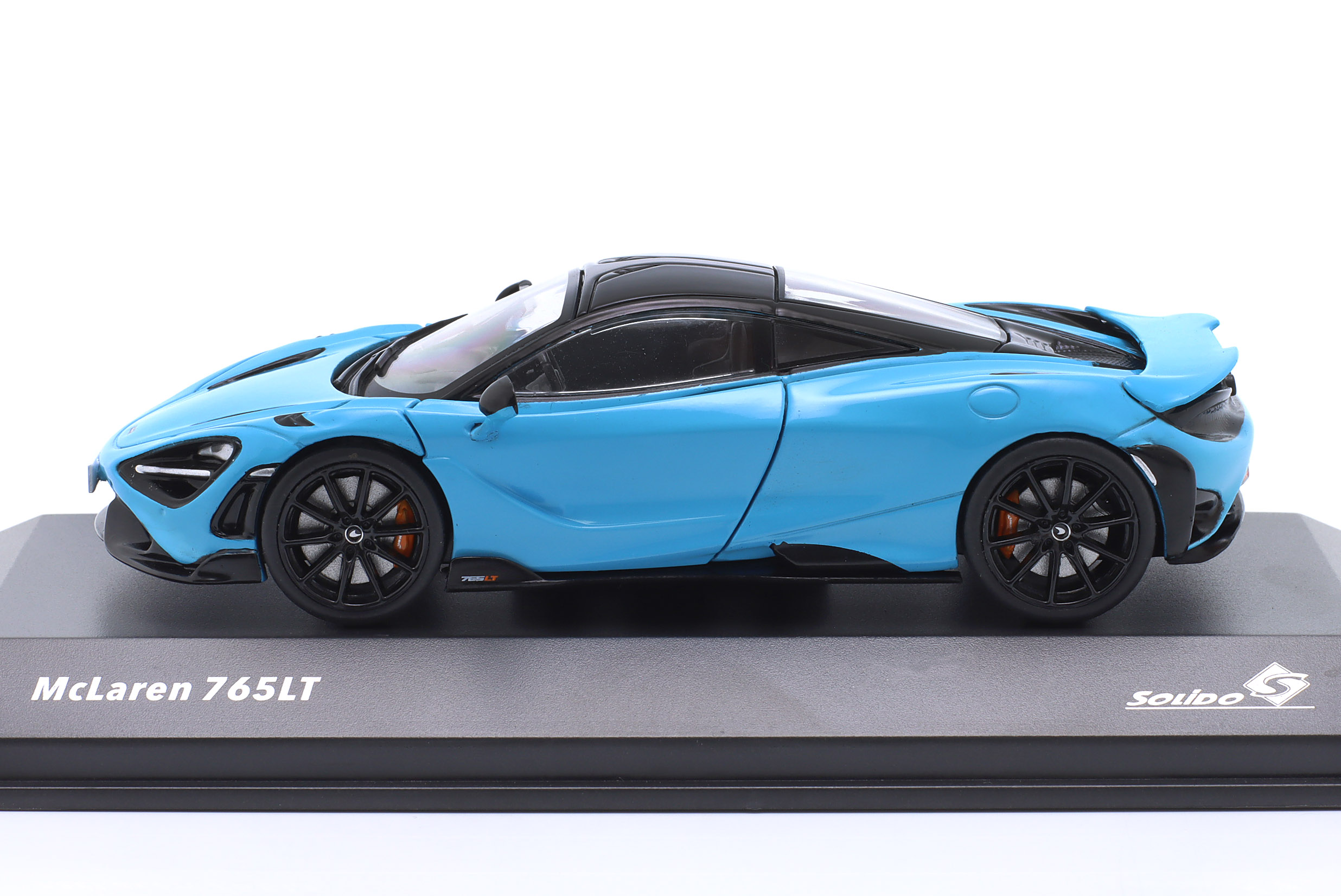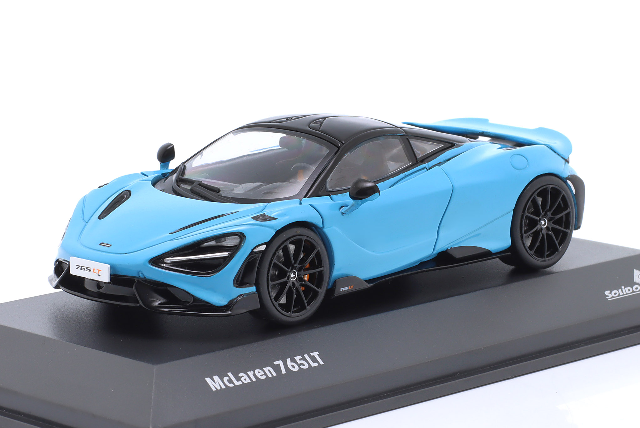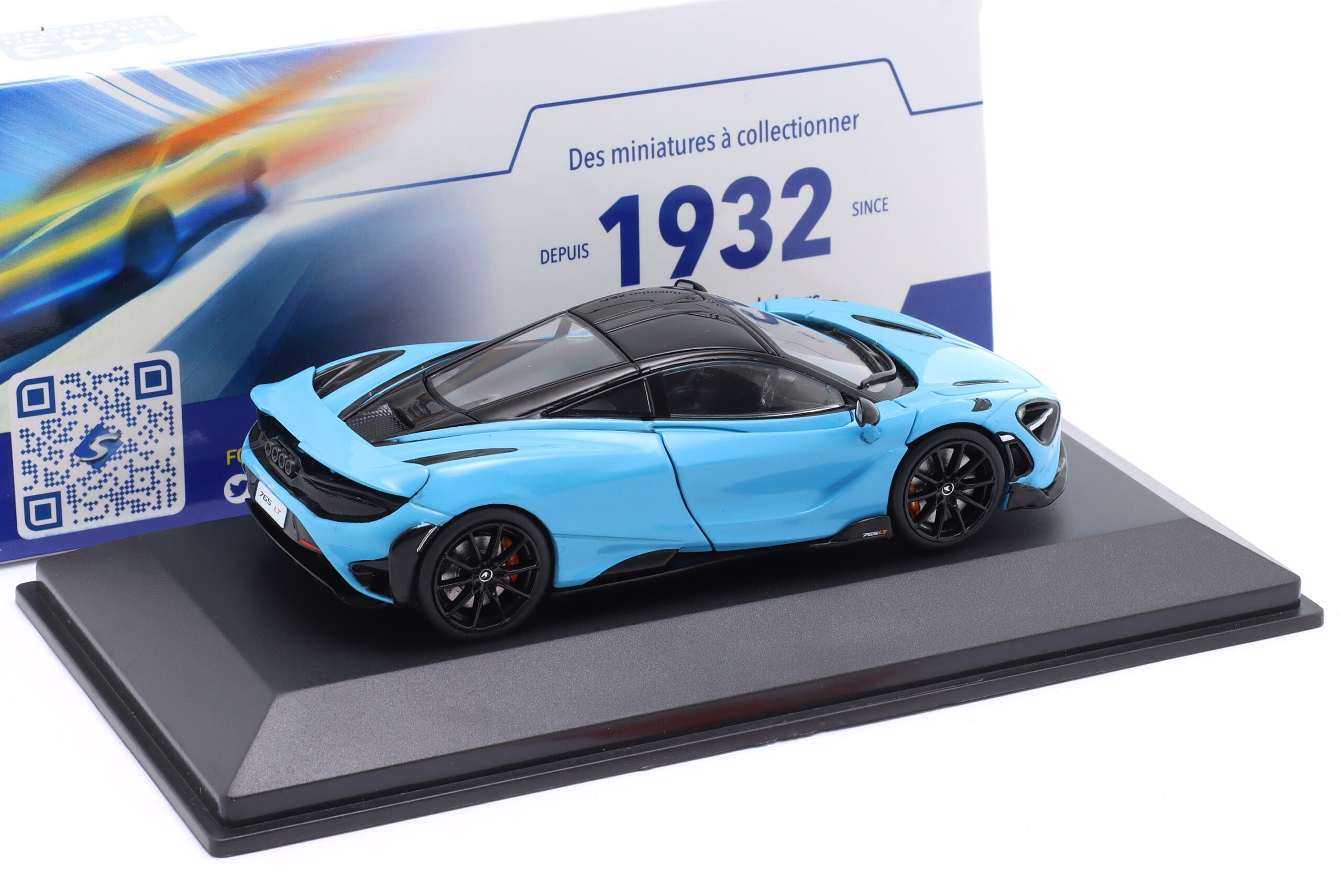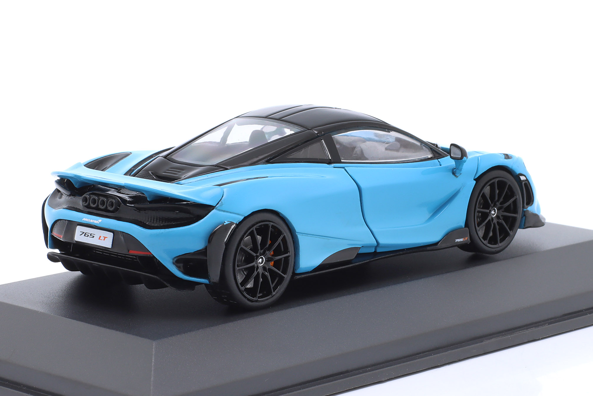 Kolekcjonerski model metalowy z elementami plastikowymi samochodu MCLAREN 765LT z roku 2020 w kolorze Curacao Blue.Model nie ma otwieranych elementów.Model na podstawce,posiada akrylową gablotkę ekspozycyjną.