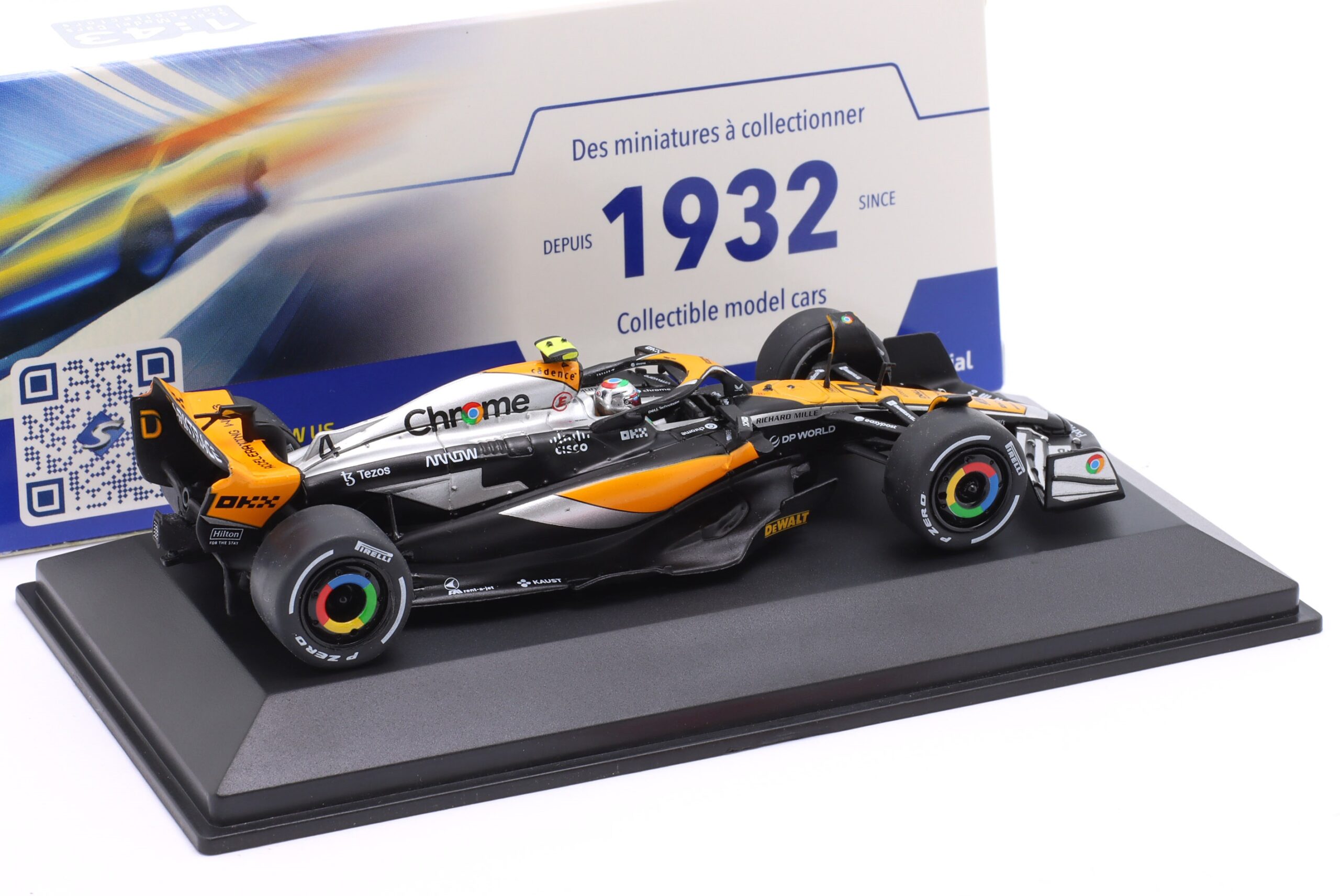 Kolekcjonerski model metalowy z elementami plastikowymi bolidu Formuły 1 McLAREN MCL60 #4 za kierownicą którego Lando Norris zdobył 2-gie miejsce w GP Wielkiej Brytanii w sezonie 2023.Model na podstawce,posiada akrylową gablotkę ekspozycyjną.