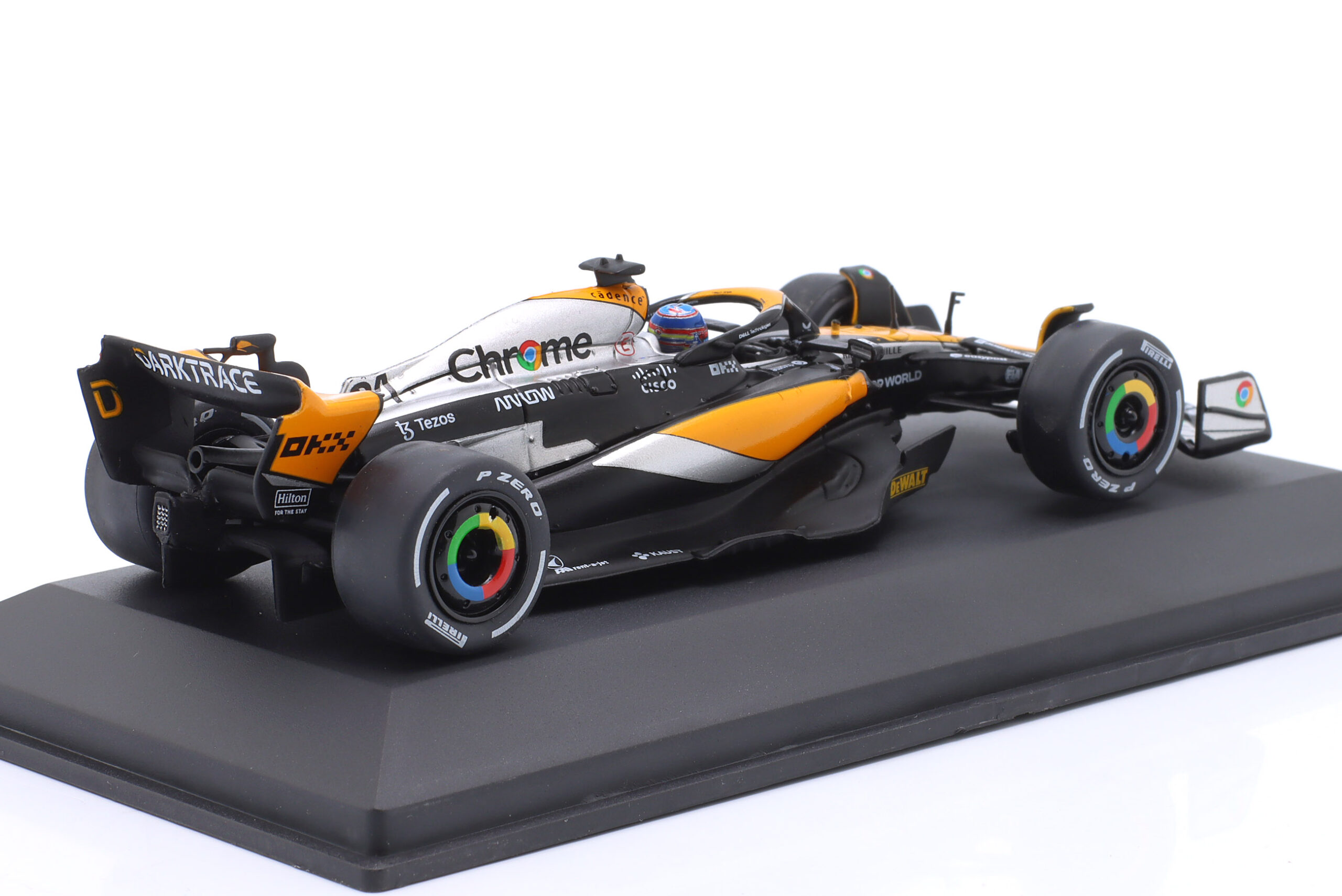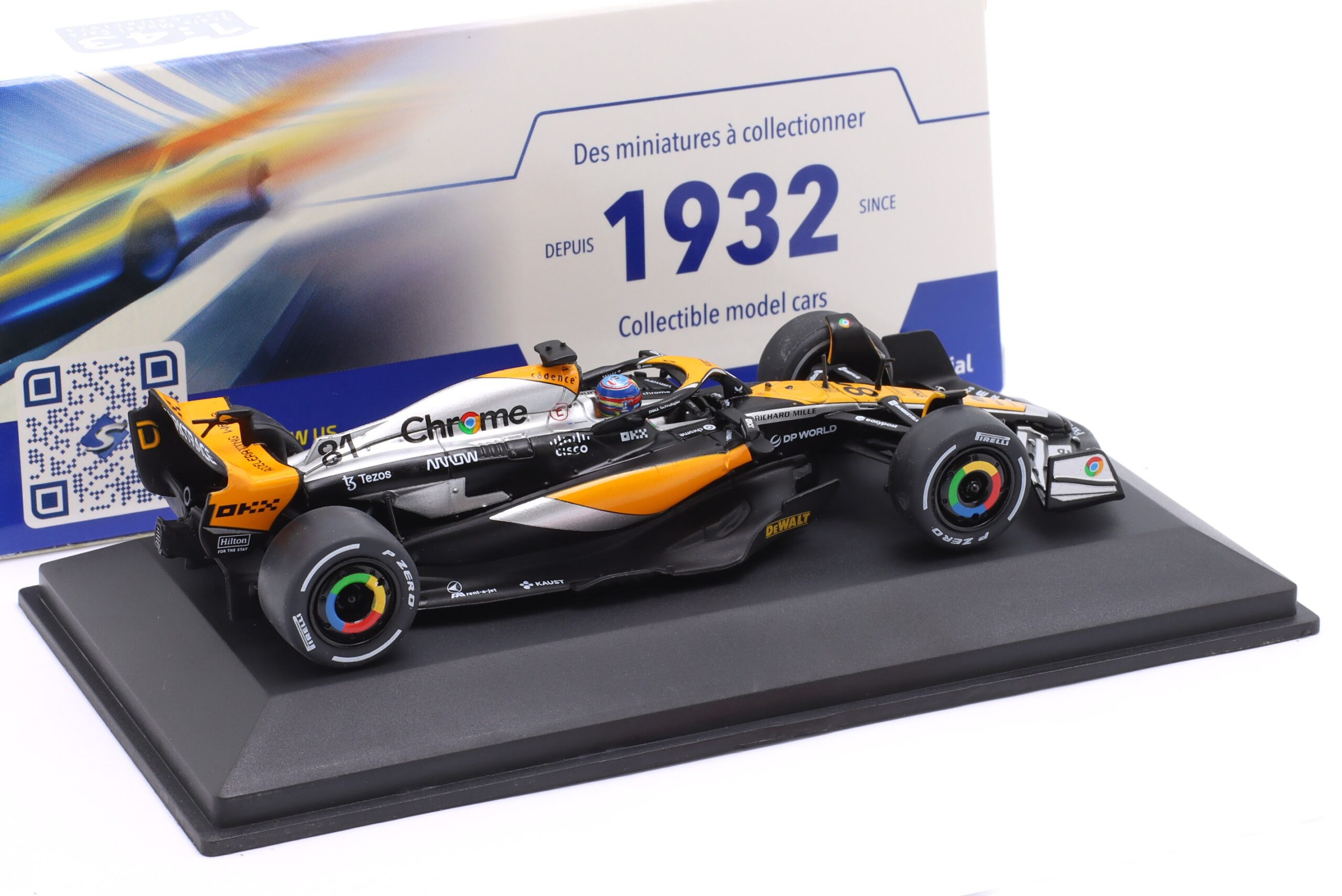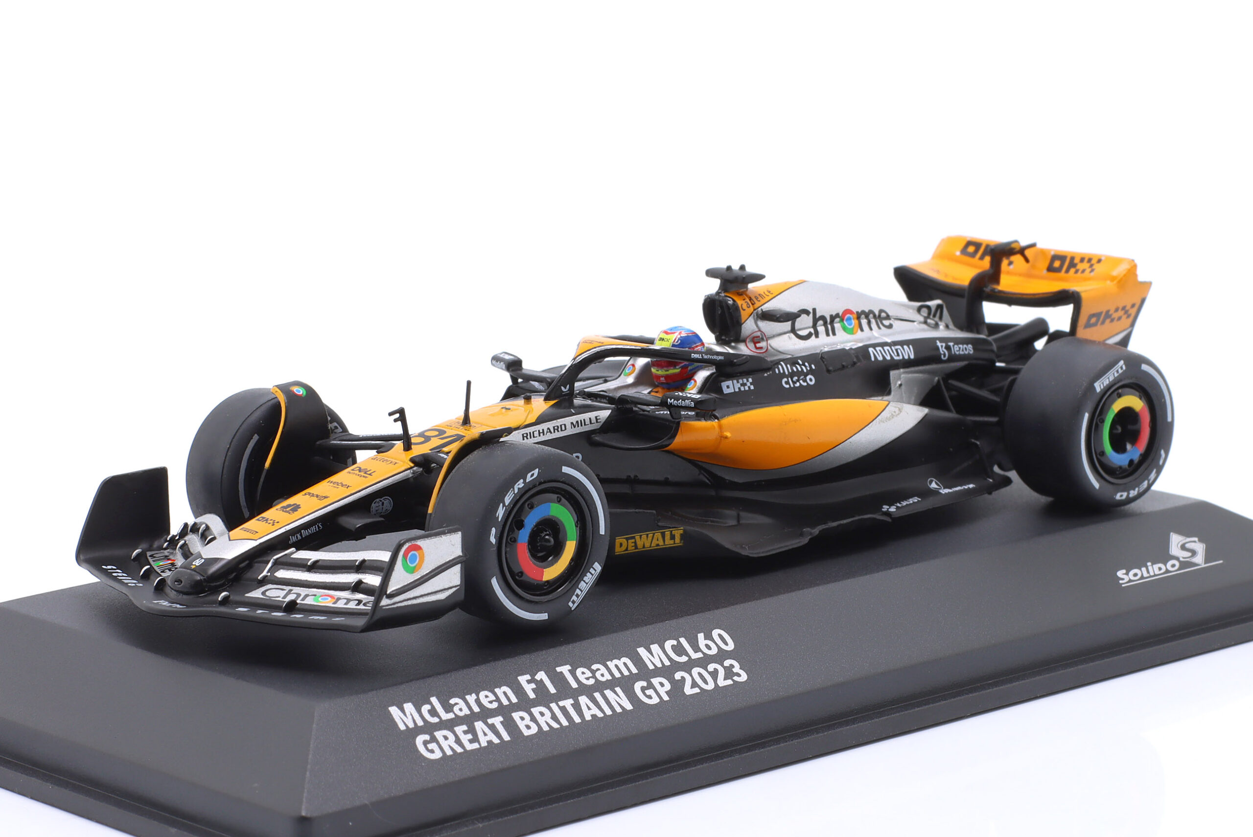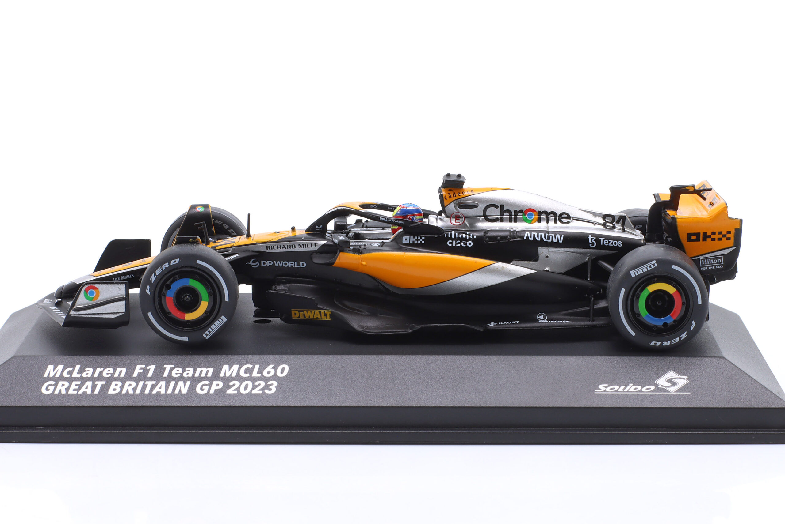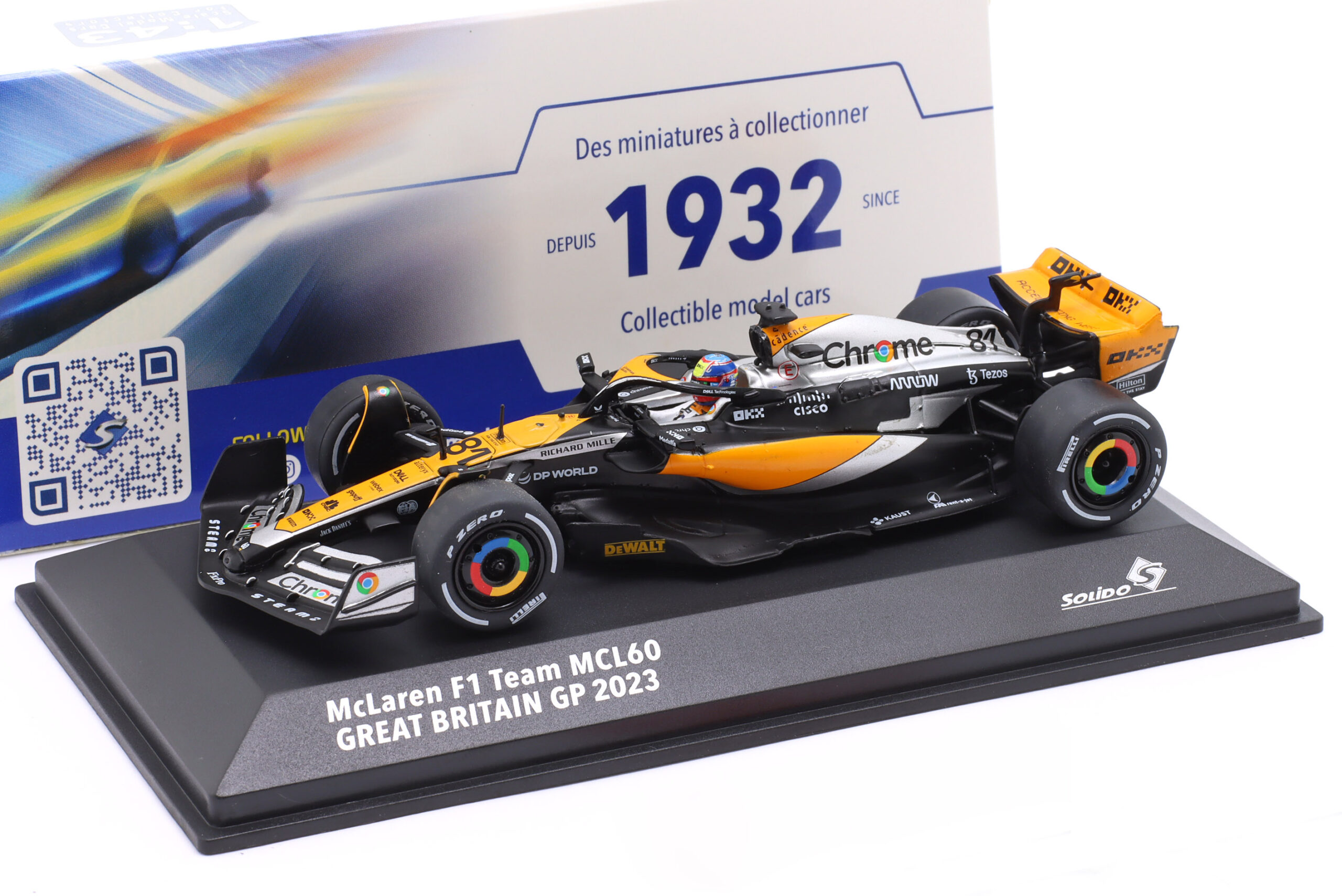 Kolekcjonerski model metalowy z elementami plastikowymi bolidu Formuły 1 McLAREN MCL60 #81 za kierownicą którego Oscar Piastri zdobył 4-te miejsce w GP Wielkiej Brytanii w sezonie 2023.Model na podstawce,posiada akrylową gablotkę ekspozycyjną.