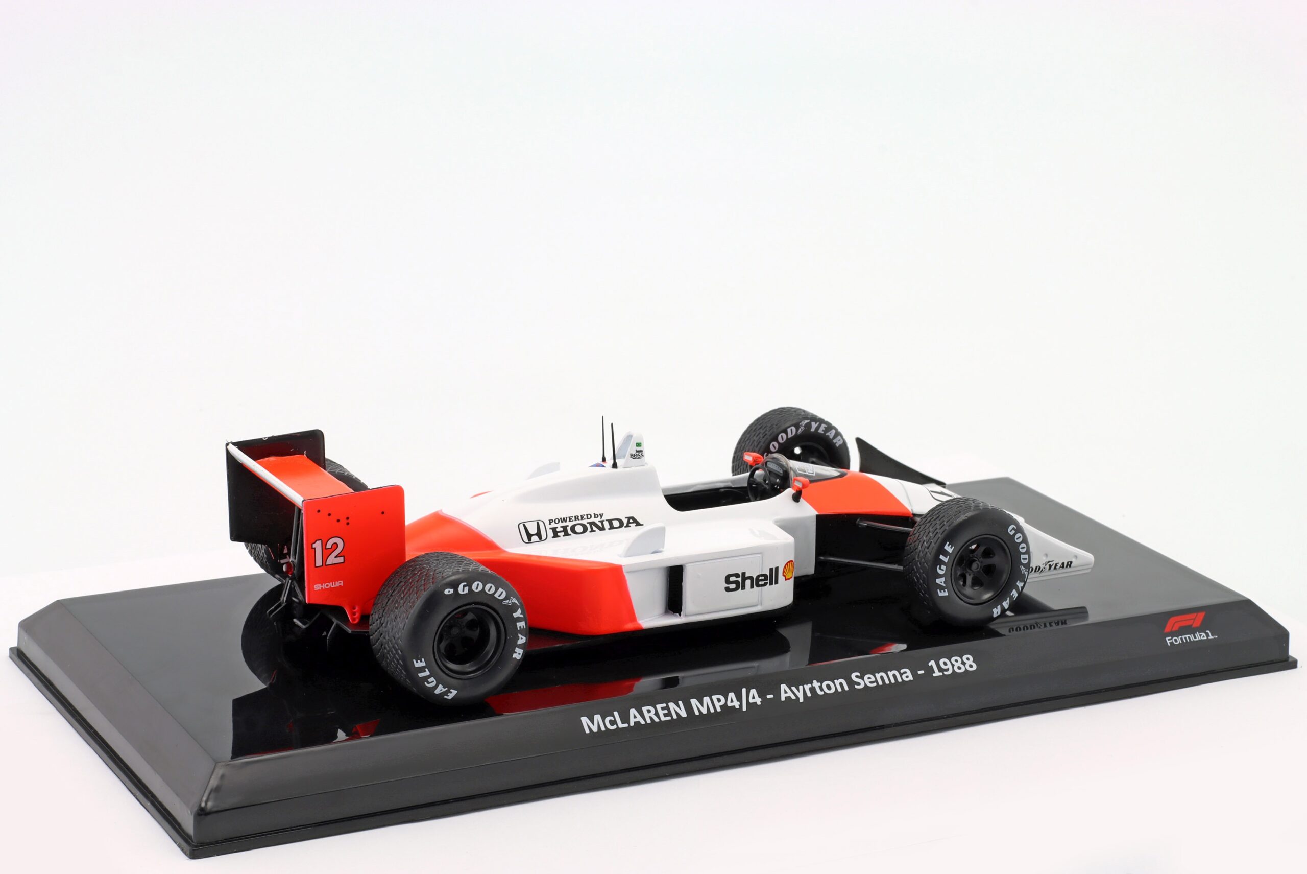 Kolekcjonerski model metalowy z elementami plastikowymi bolidu Formuły 1 McLaren MP4/4 #12 w którym Ayrton Senna startował w sezonie 1988 zdobywając Tytuł Mistrza Świata.Model na podstawce,zapakowany w blister.