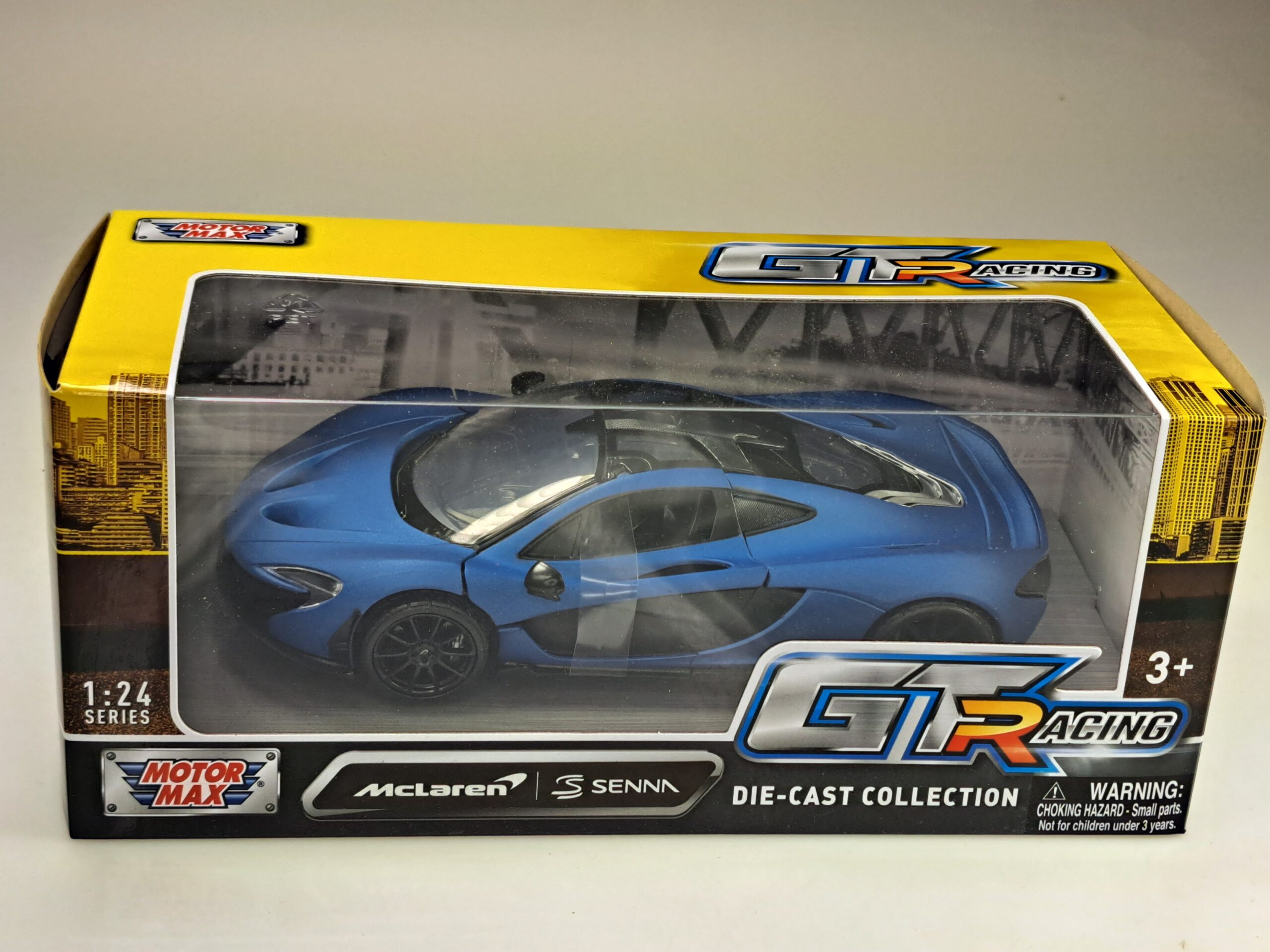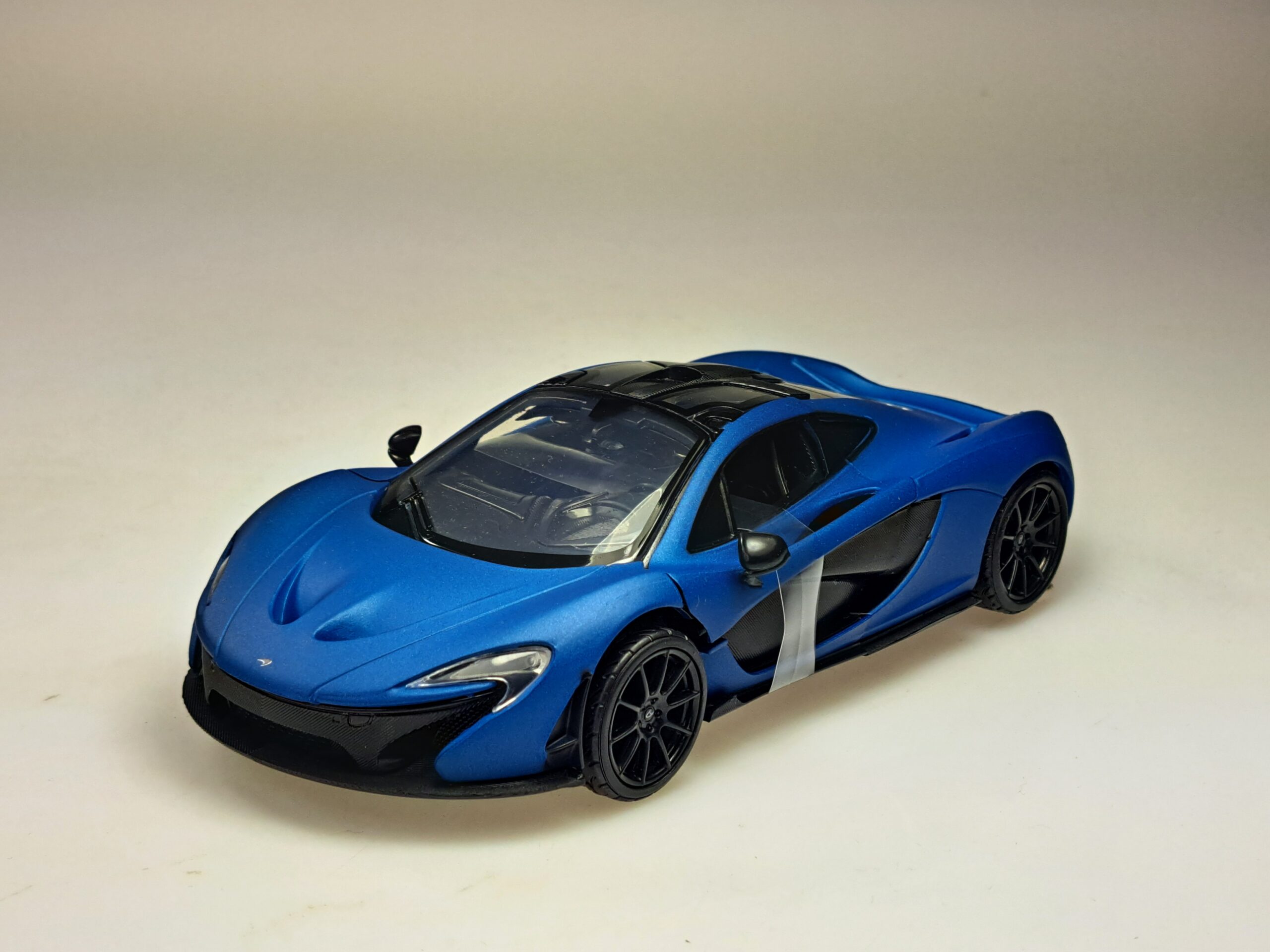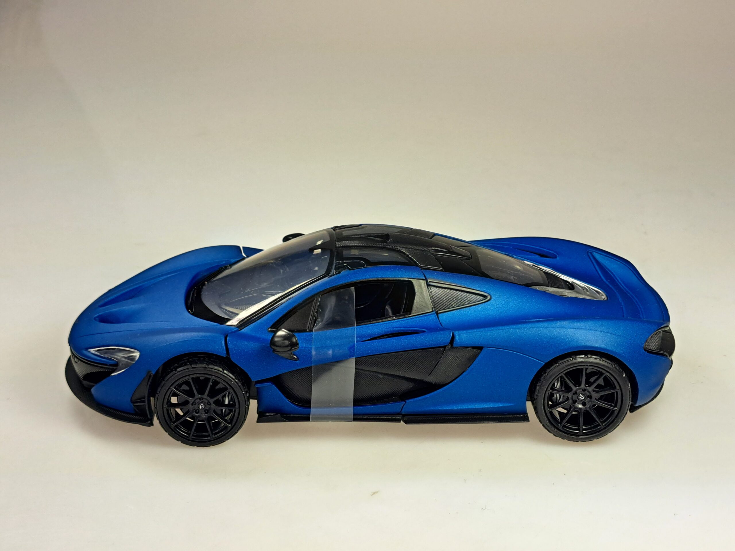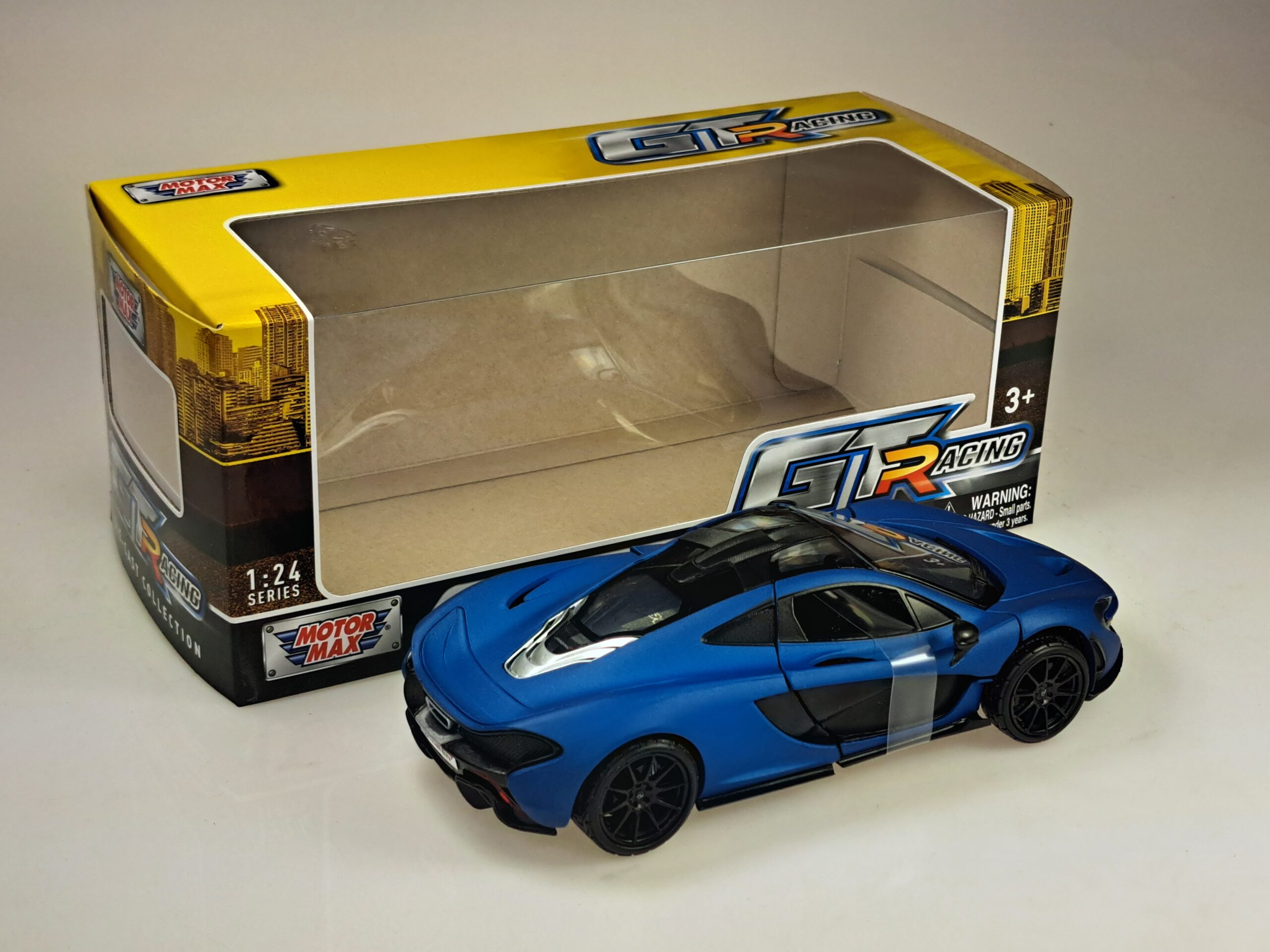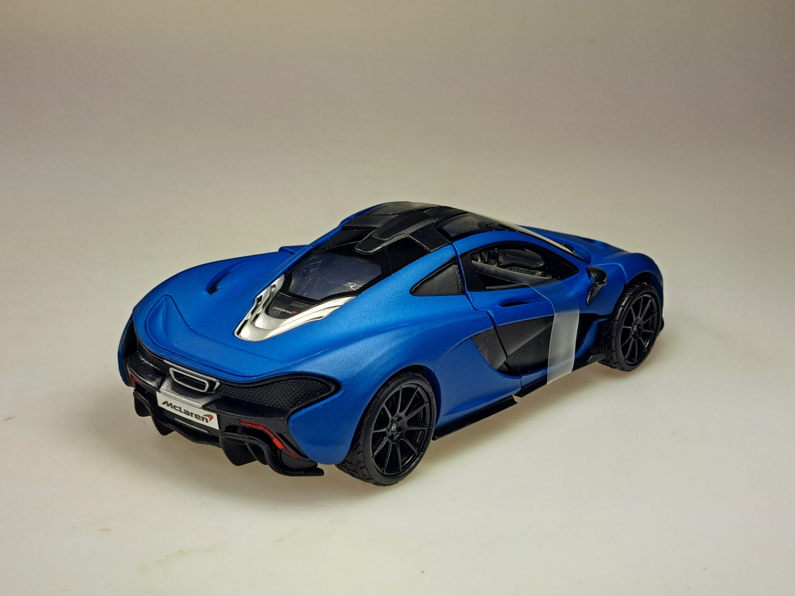 Kolekcjonerski model metalowy z elementami plastikowymi samochodu McLAREN P1 z roku 2015 w kolorze Satynowy niebieski.Posiada otwierane drzwi.Model zapakowany w kartonowe pudełko witrynką.