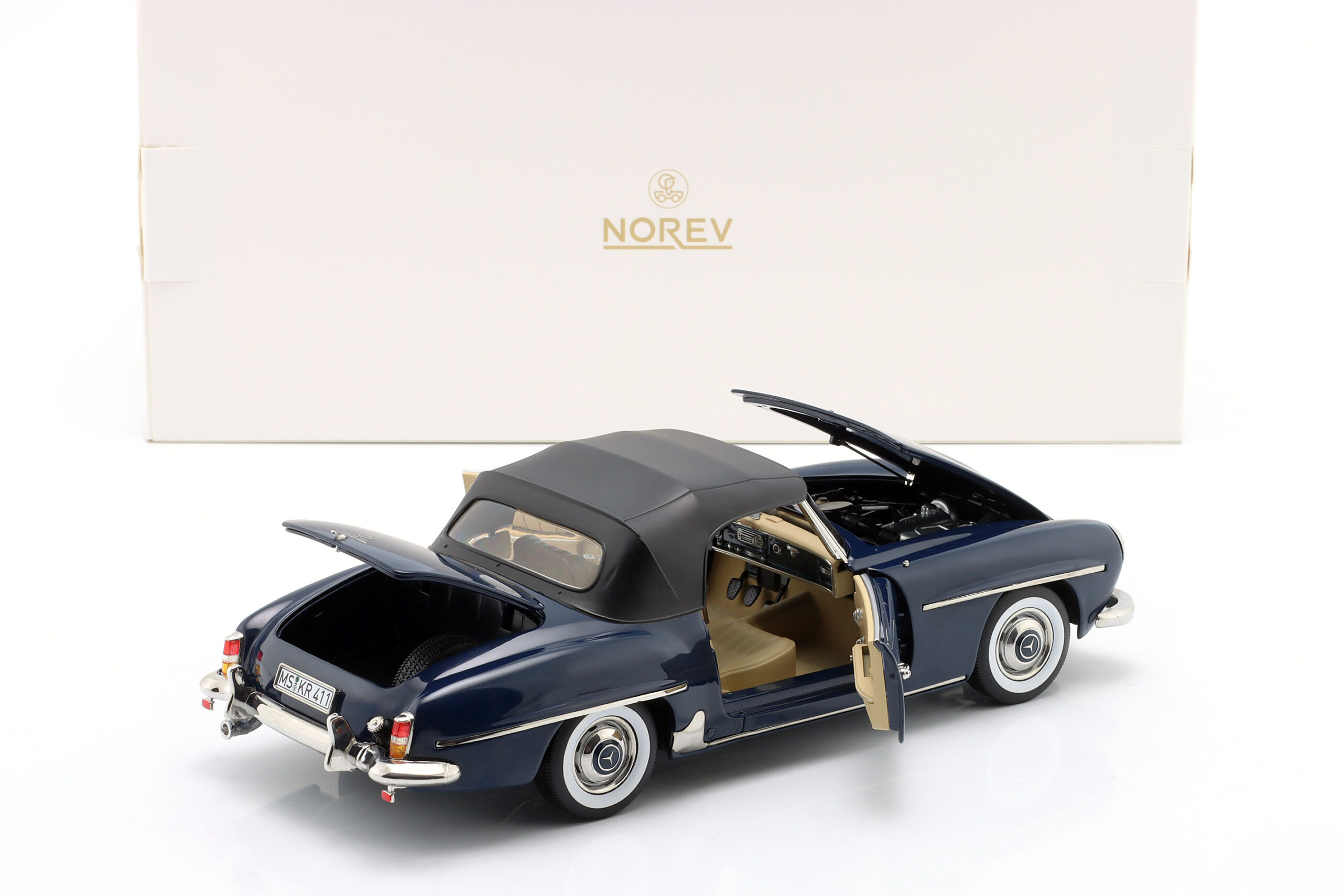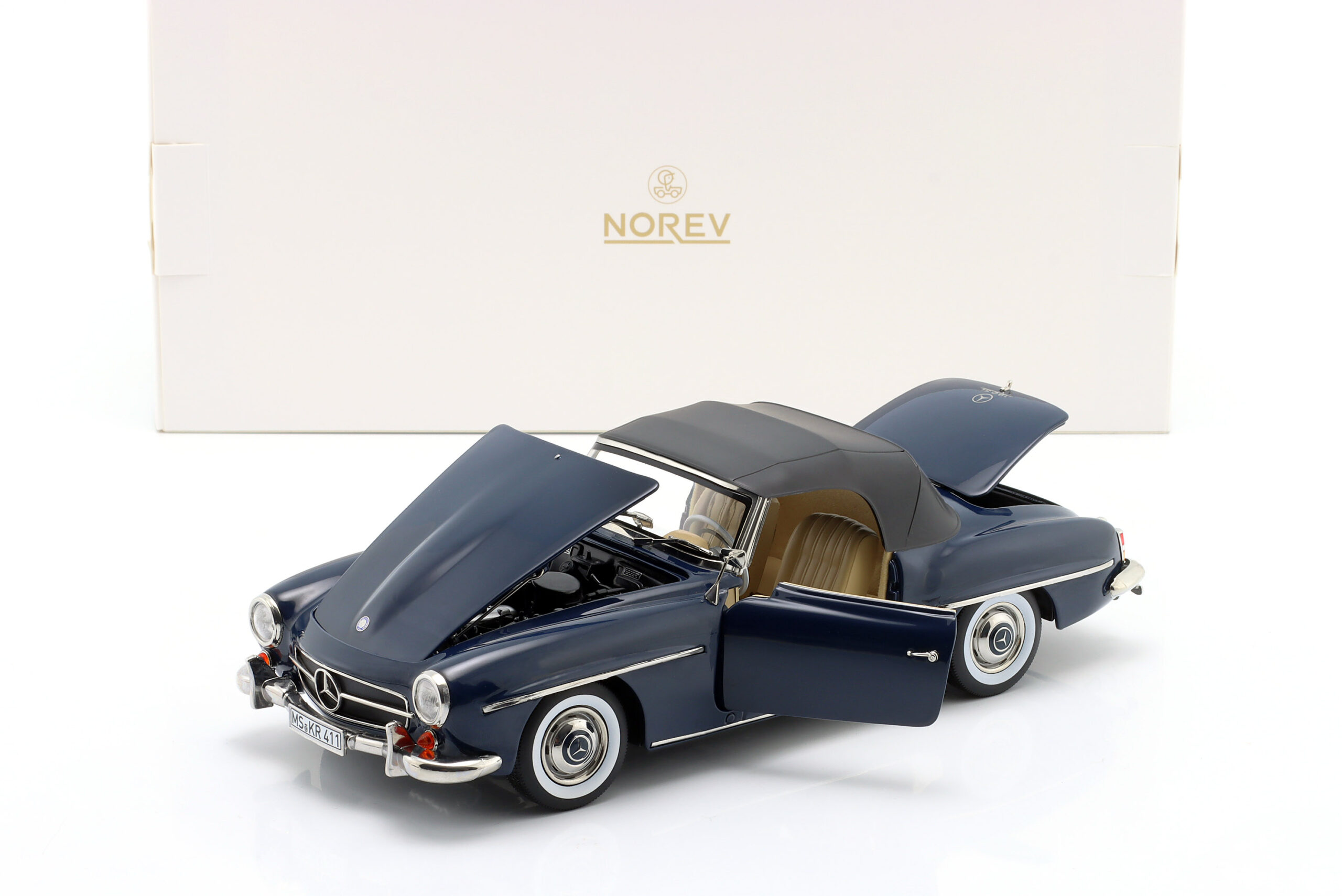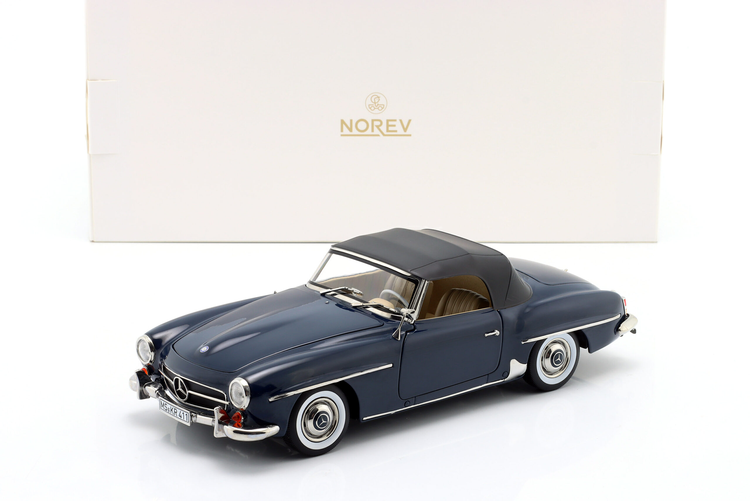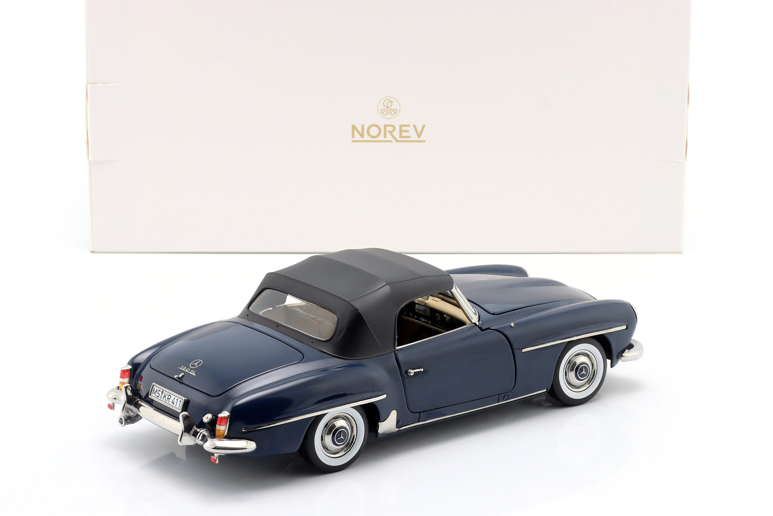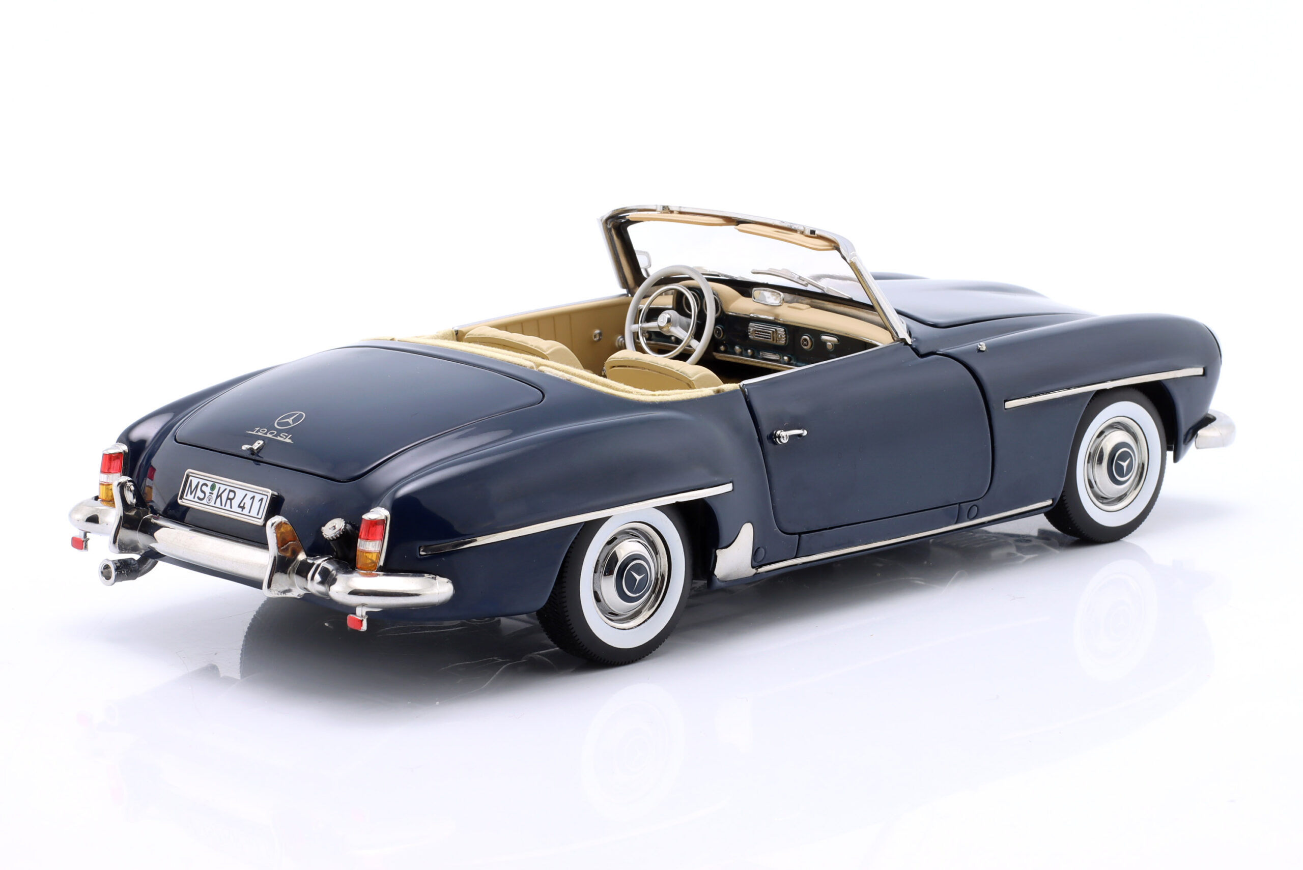 Kolekcjonerski model metalowy z elementami plastikowymi samochodu MERCEDES-BENZ 190 SL z roku 1957 w kolorze Ciemnoniebieskim.