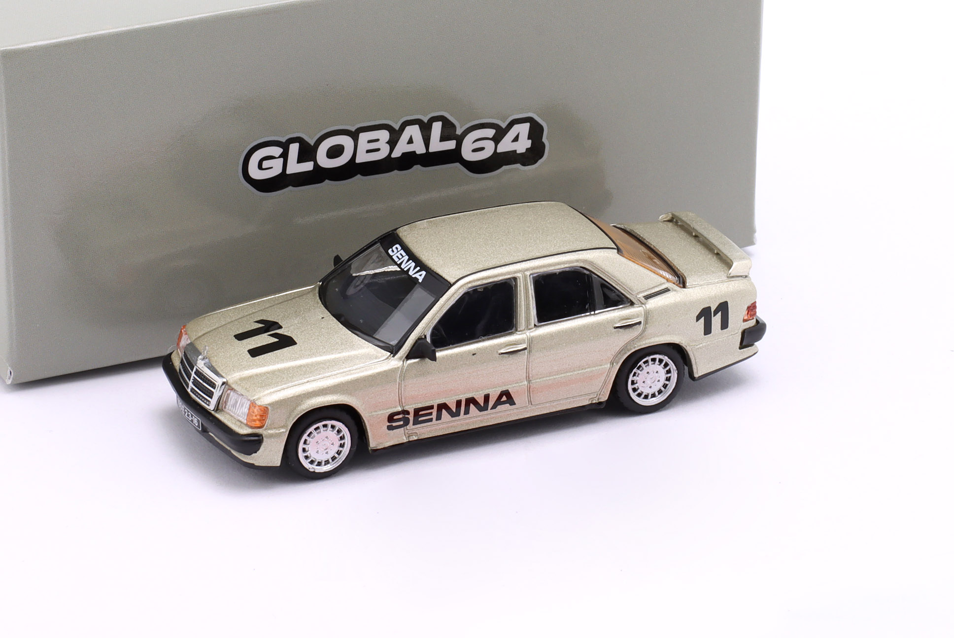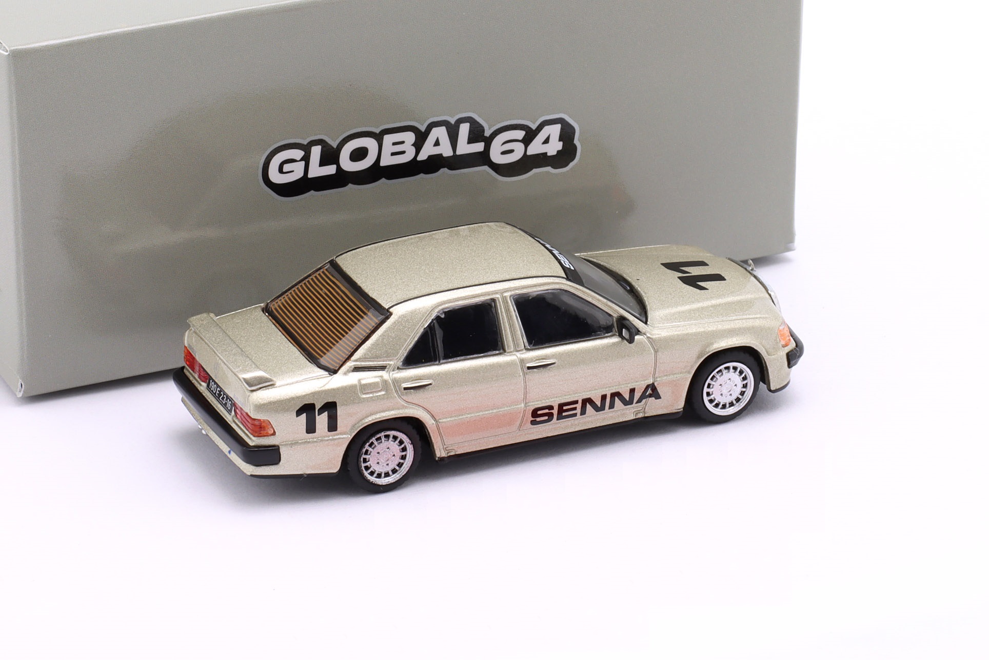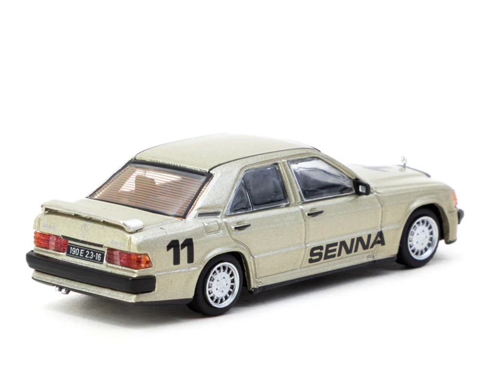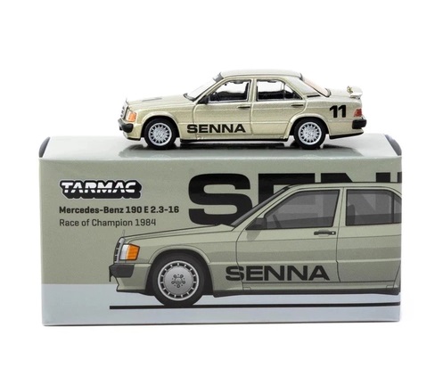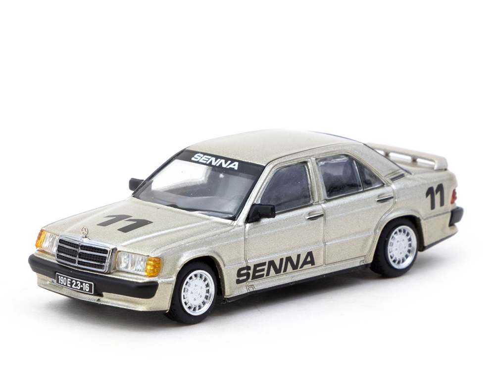 Kolekcjonerski model metalowy z elementami plastikowymi samochodu MERCEDES-BENZ 190E 2.3-16 (W201) #5 Ayrton Senna w kolorze Beżowy metallic.Model zapakowany w kartonowe pudełko z obrazkiem samochodu..