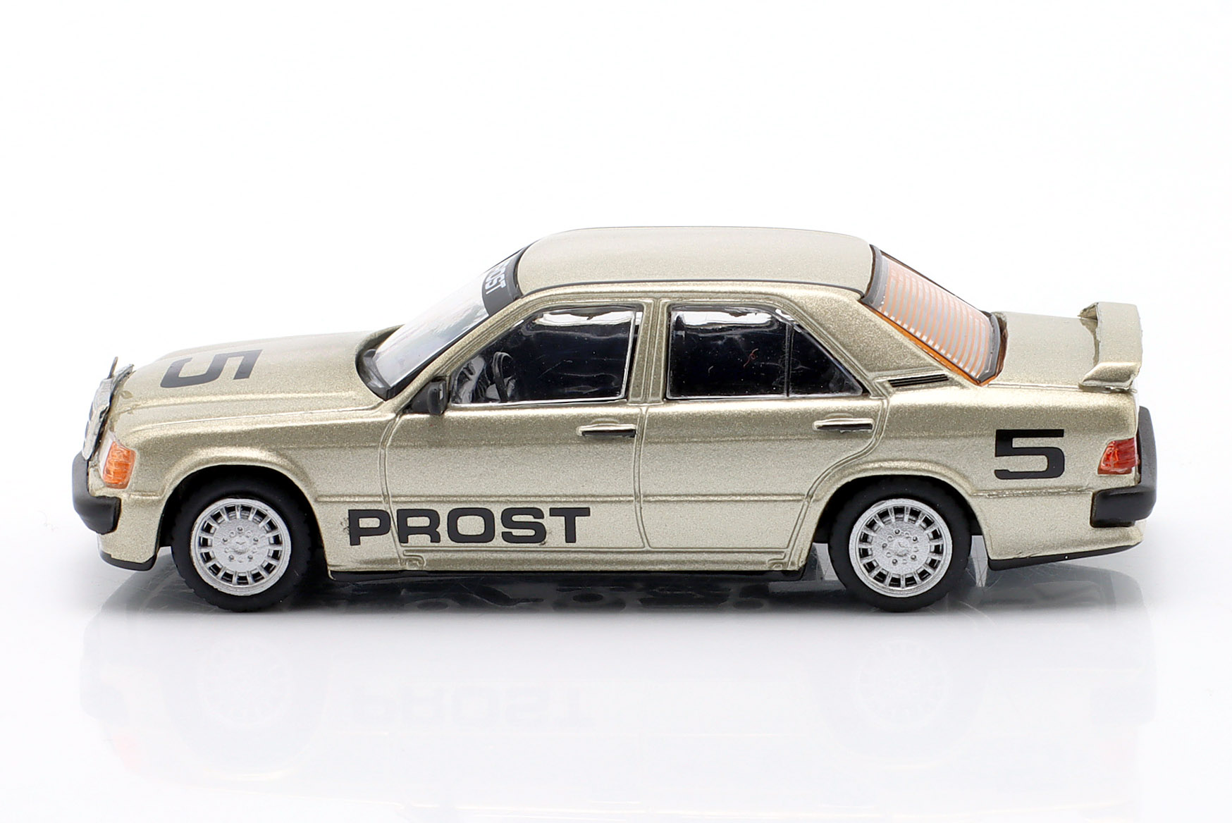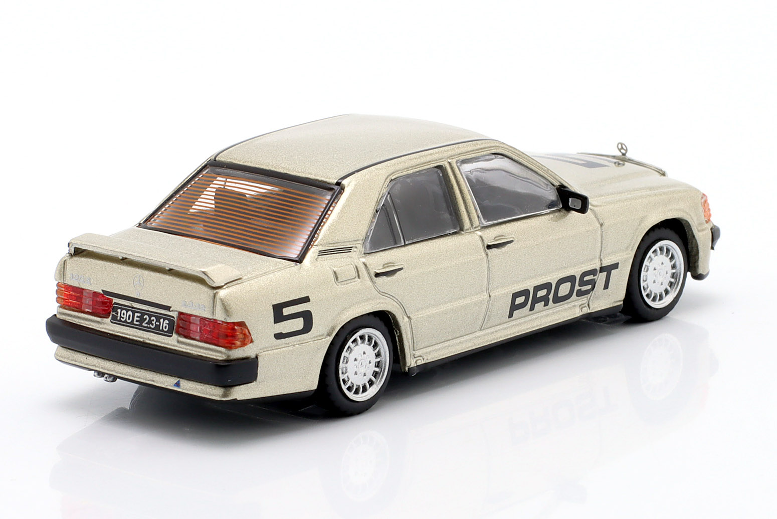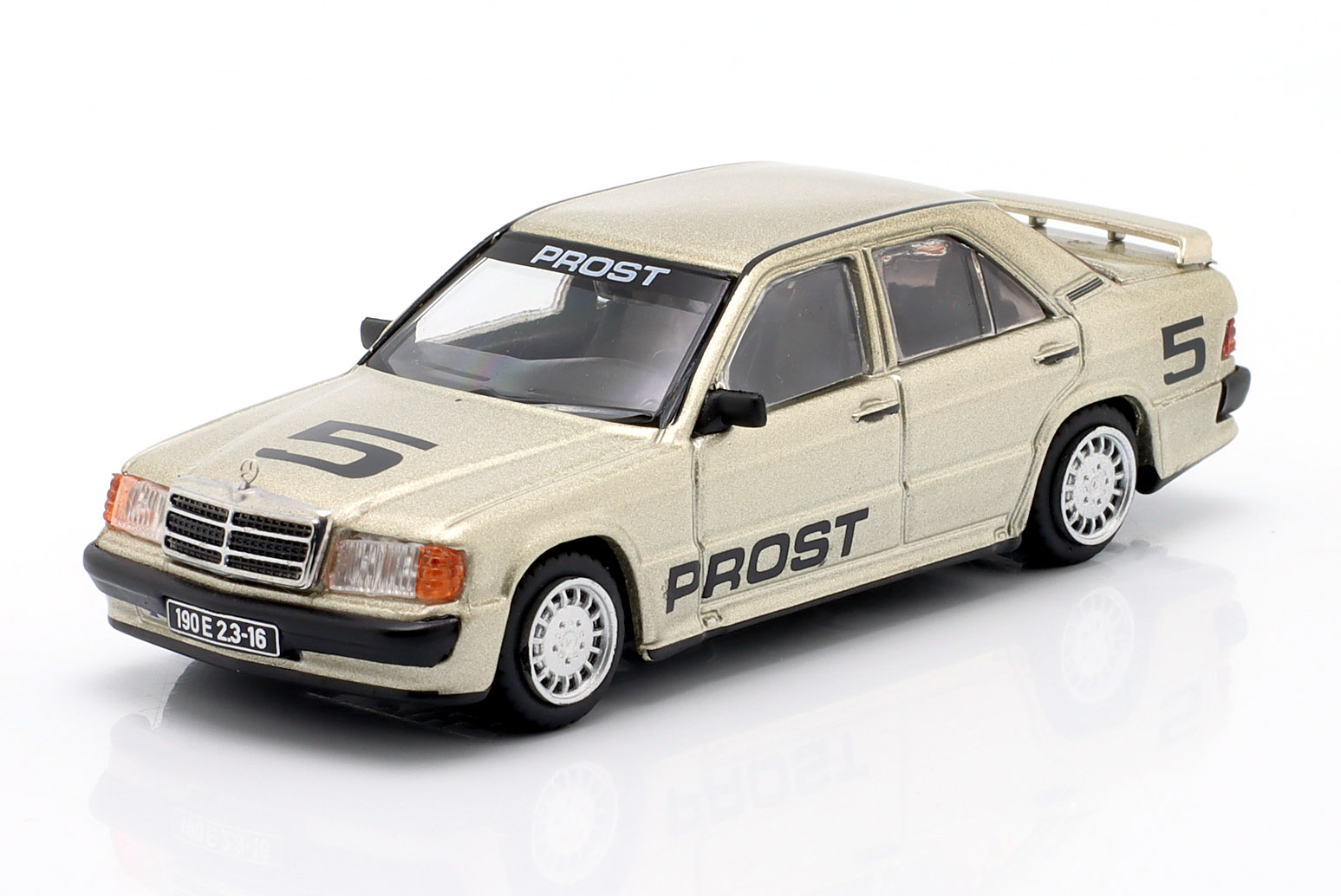 Kolekcjonerski model metalowy z elementami plastikowymi samochodu MERCEDES-BENZ 190E 2.3-16 (W201) #5 Alain Prost w kolorze Beżowy metallic.Model zapakowany w kartonowe pudełko z obrazkiem samochodu..