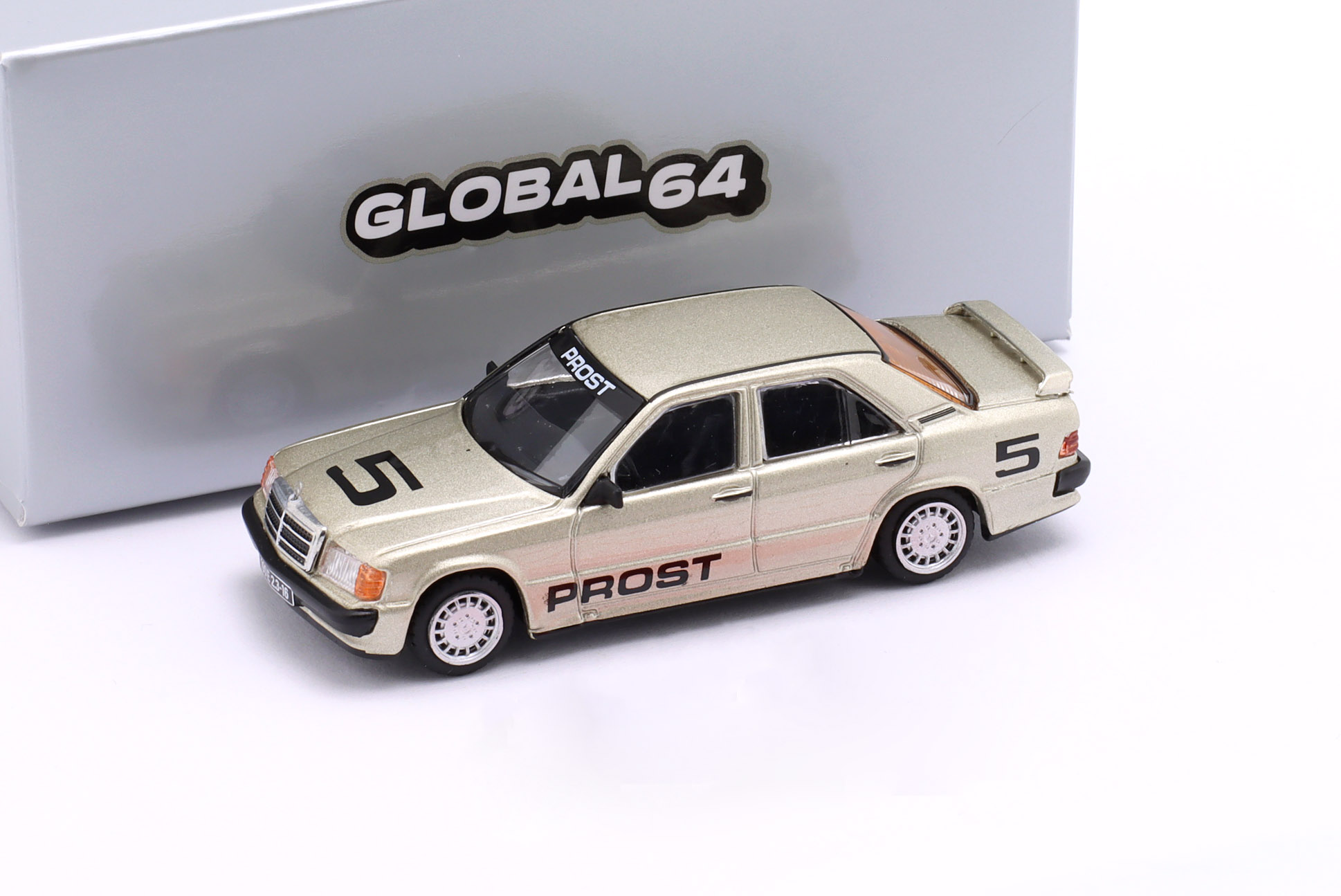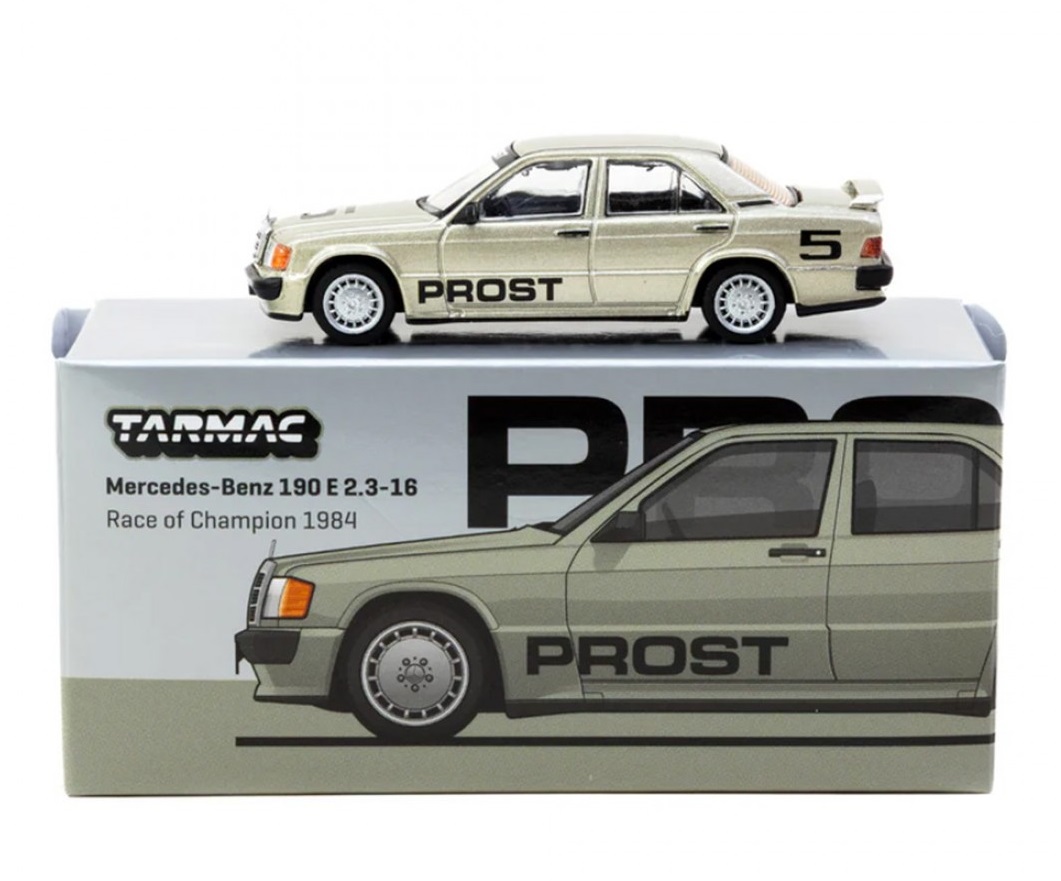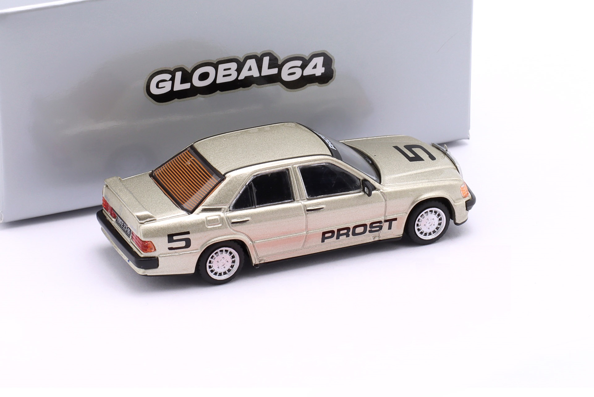 Kolekcjonerski model metalowy z elementami plastikowymi samochodu MERCEDES-BENZ 190E 2.3-16 (W201) #5 Alain Prost w kolorze Beżowy metallic.Model zapakowany w kartonowe pudełko z obrazkiem samochodu..
