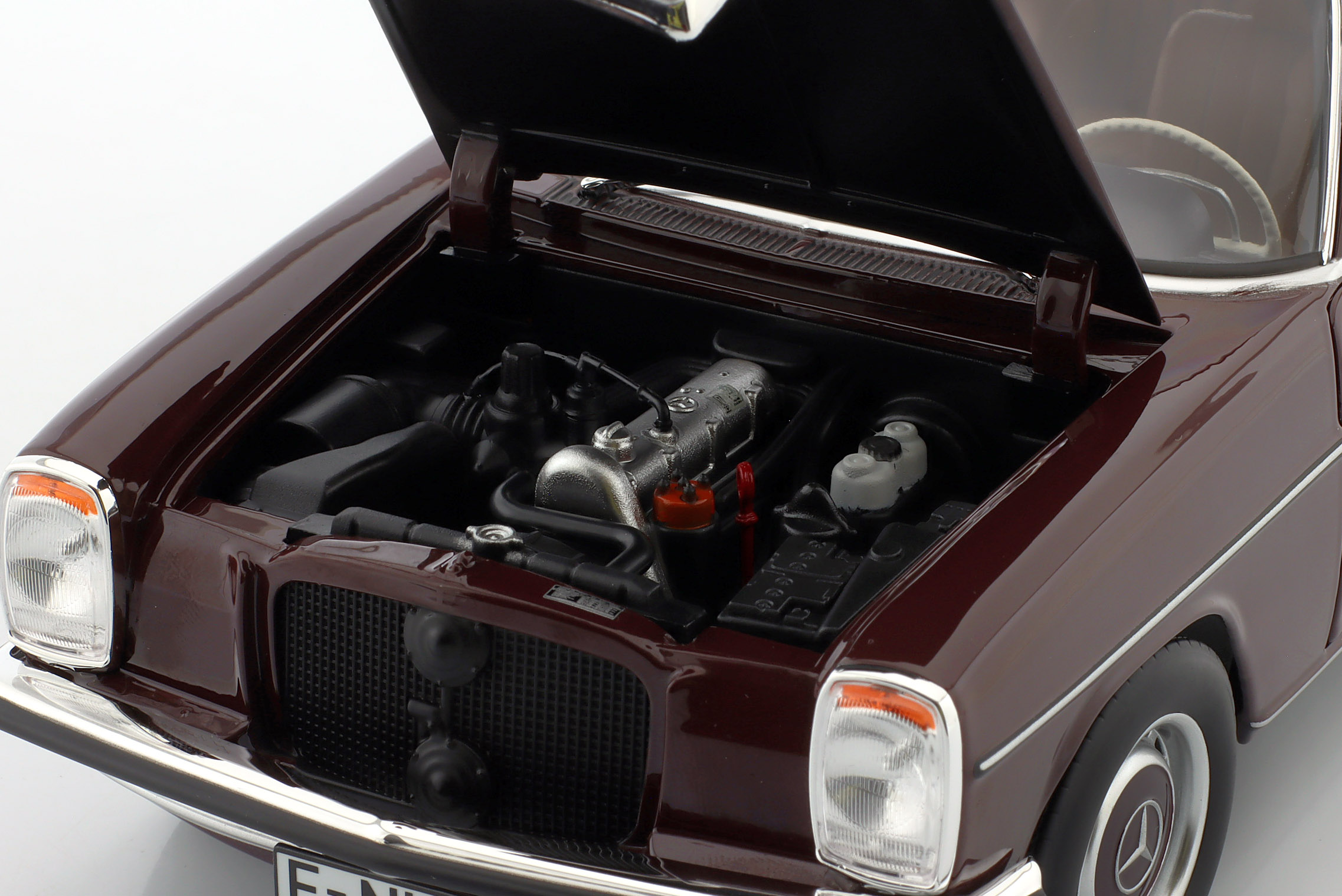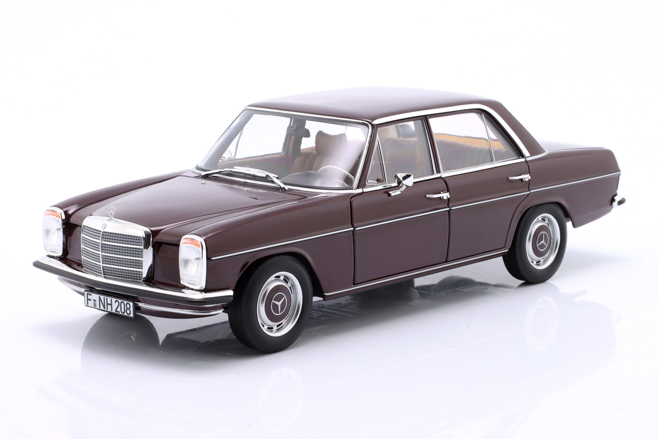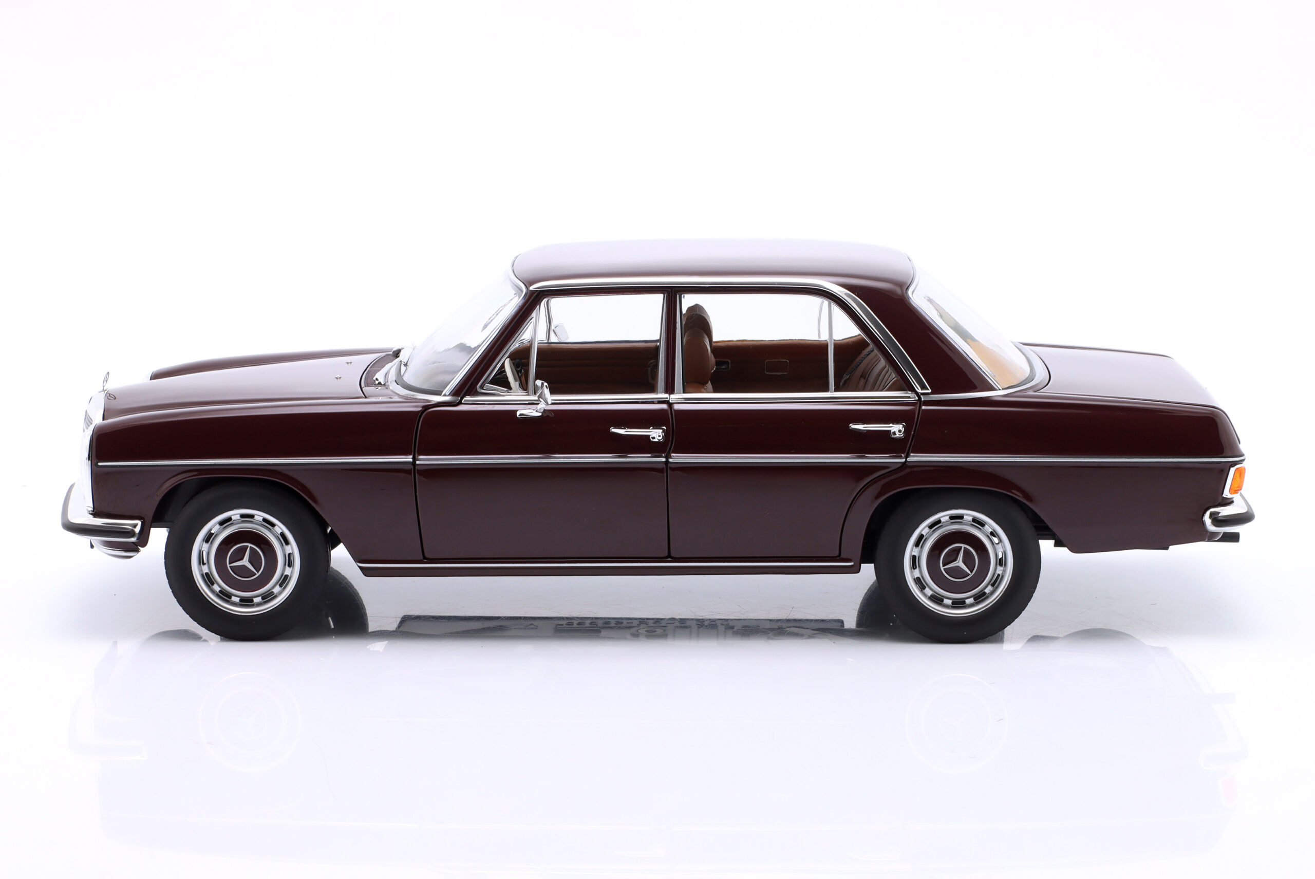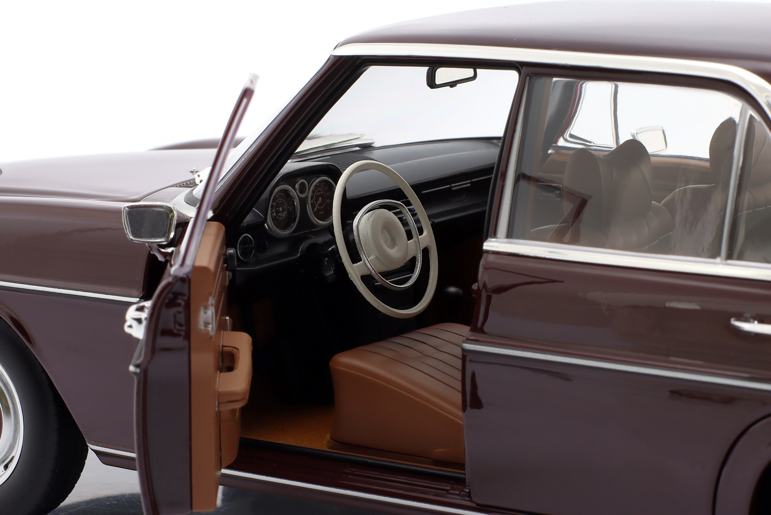 Kolekcjonerski model metalowy z elementami plastikowymi samochodu MERCEDES-BENZ 200 (W115) z roku 1969 w kolorze Ciemnoczerwonym.Model posiada otwierane drzwi,pokrywę silnika oraz bagażnika.