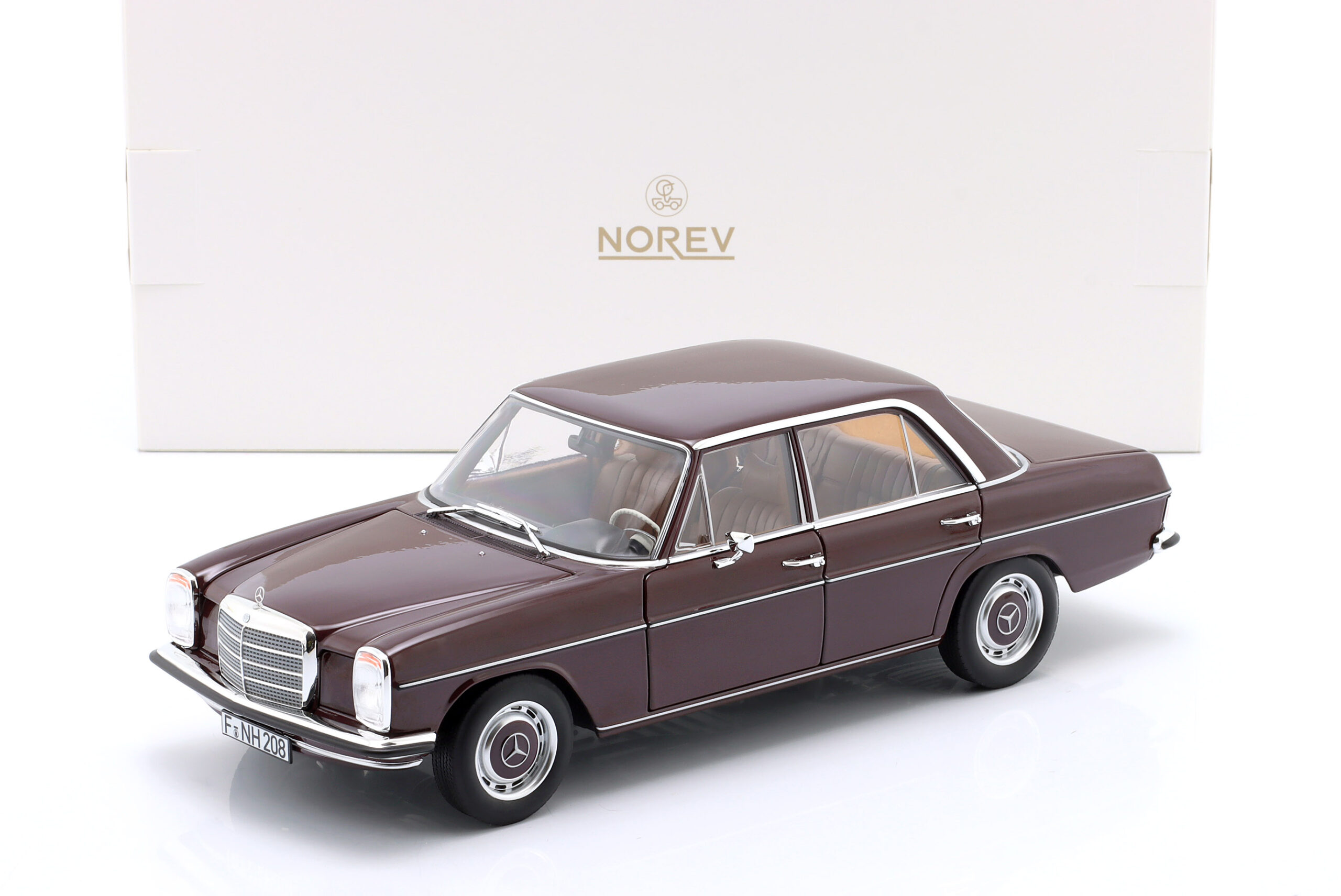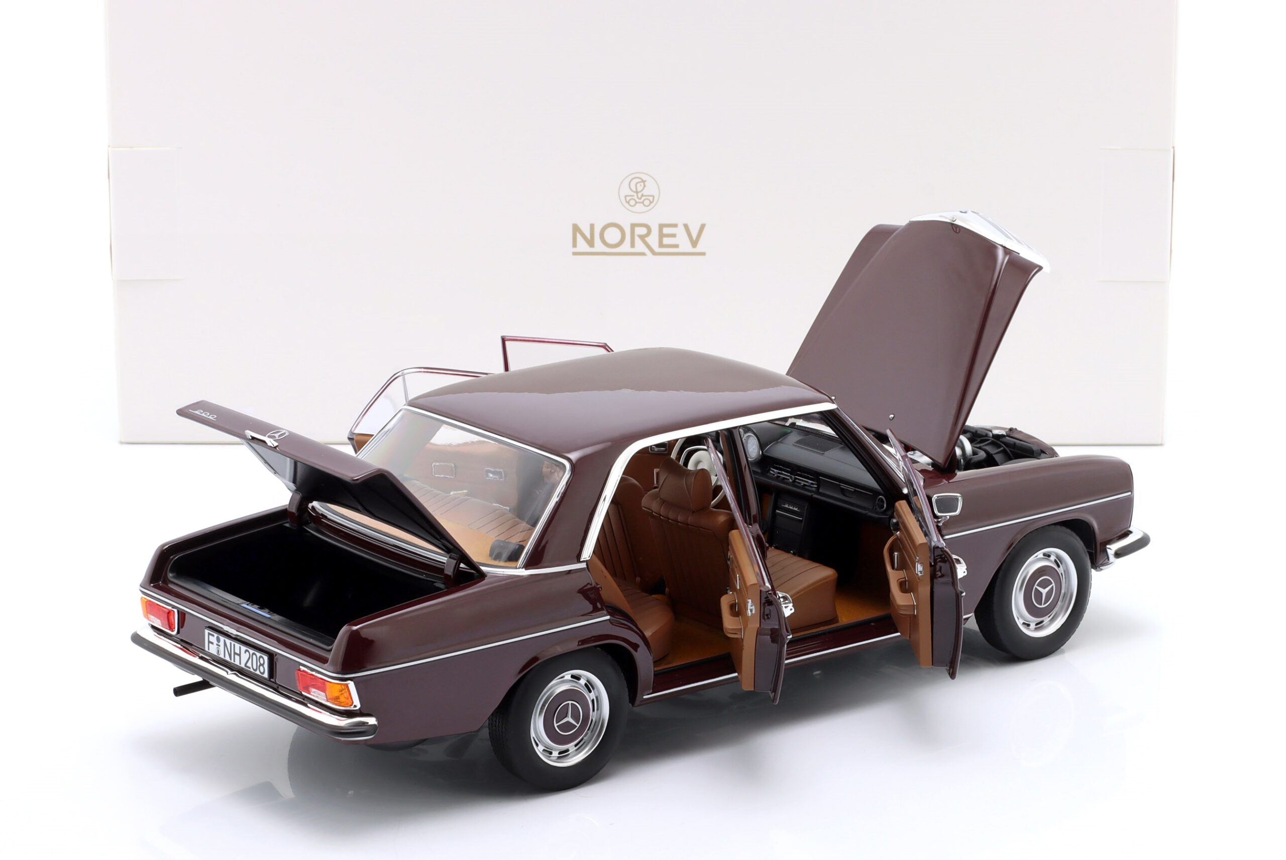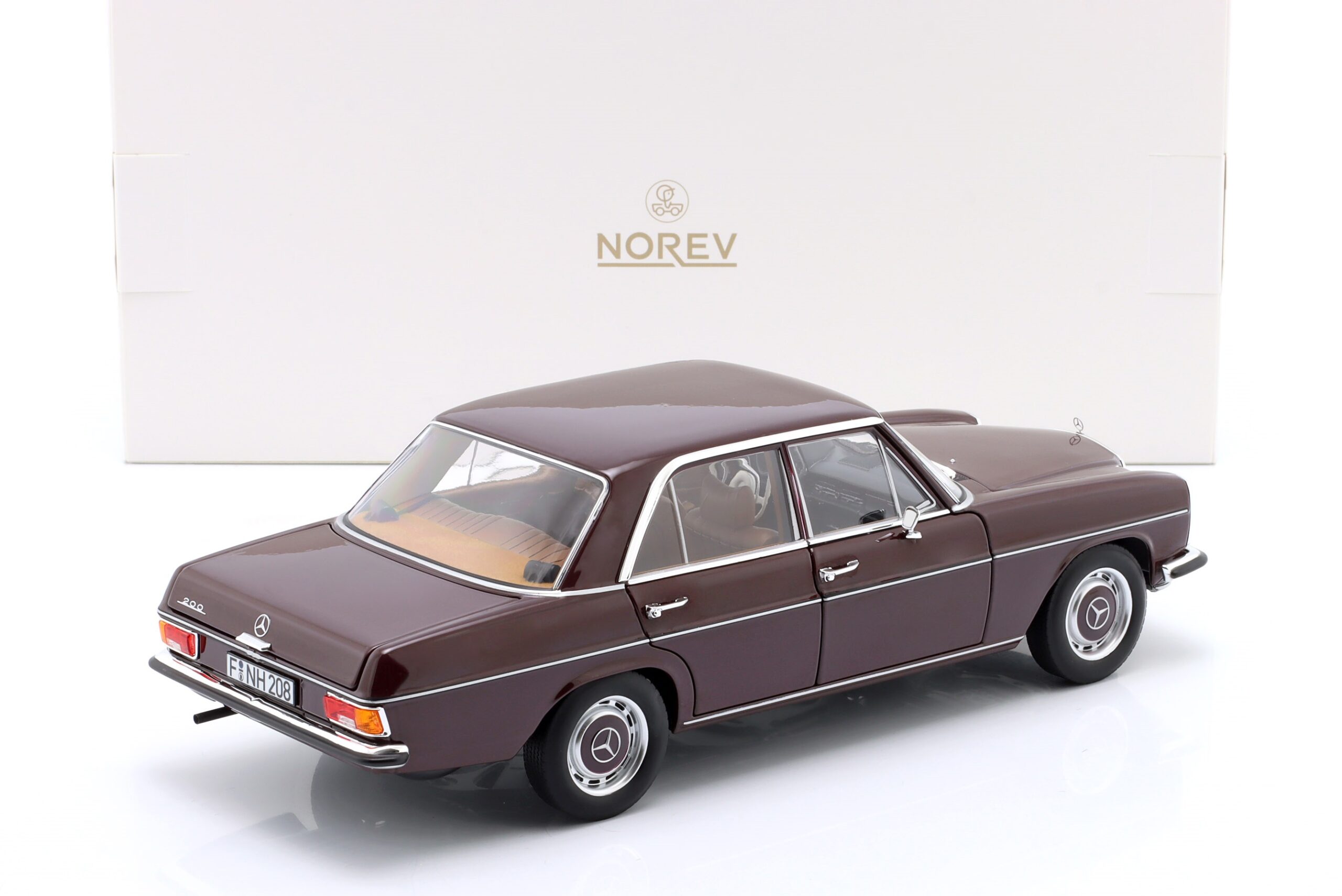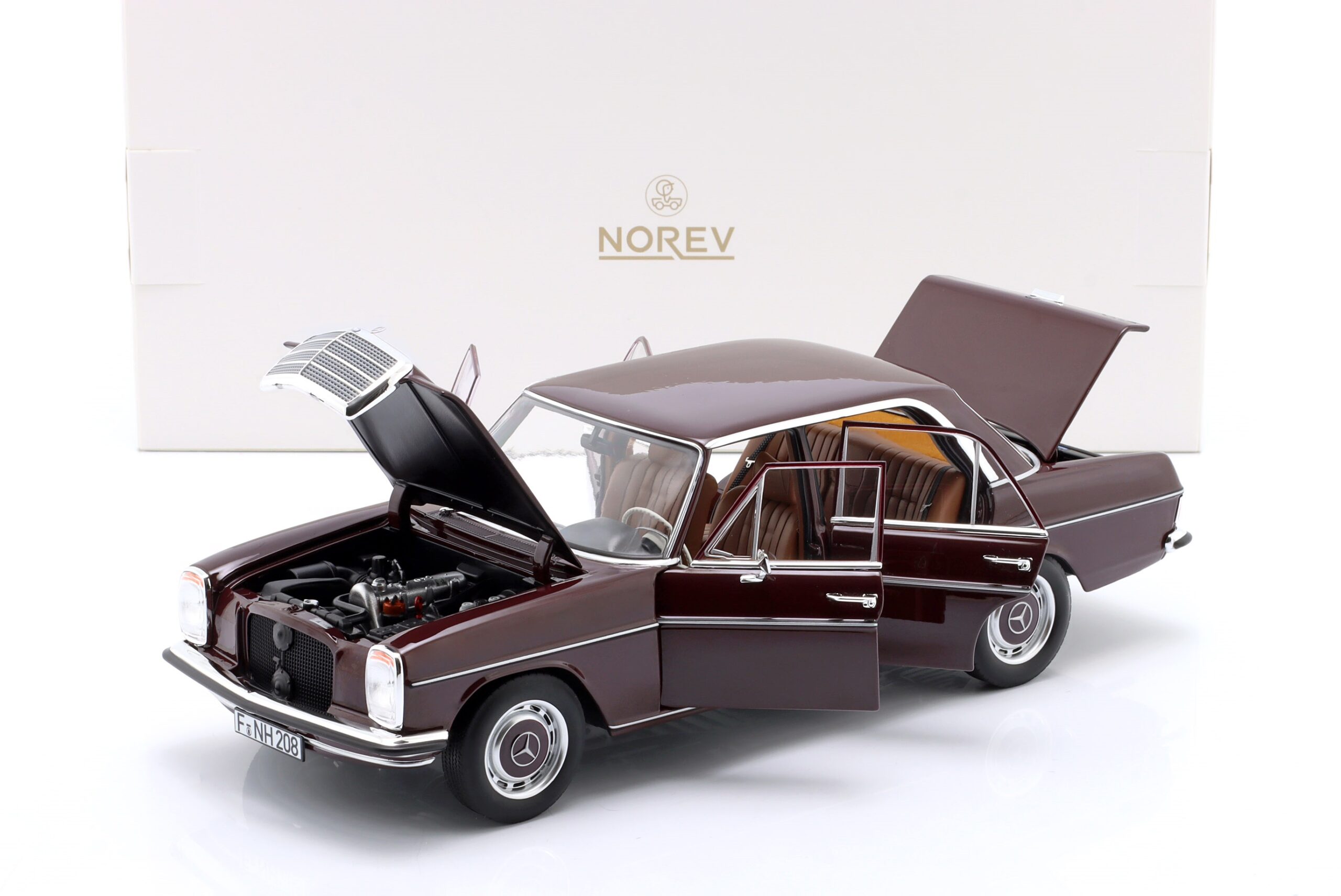 Kolekcjonerski model metalowy z elementami plastikowymi samochodu MERCEDES-BENZ 200 (W115) z roku 1969 w kolorze Ciemnoczerwonym.Model posiada otwierane drzwi,pokrywę silnika oraz bagażnika.