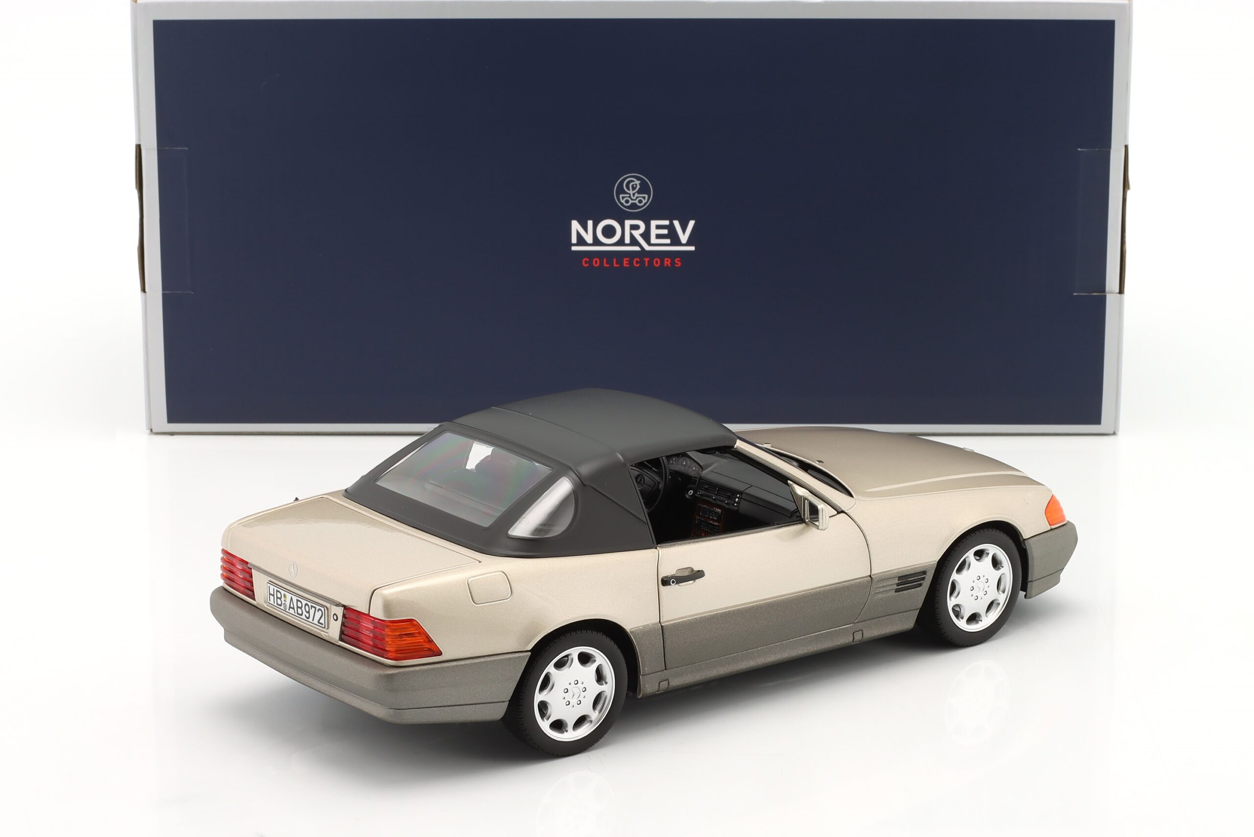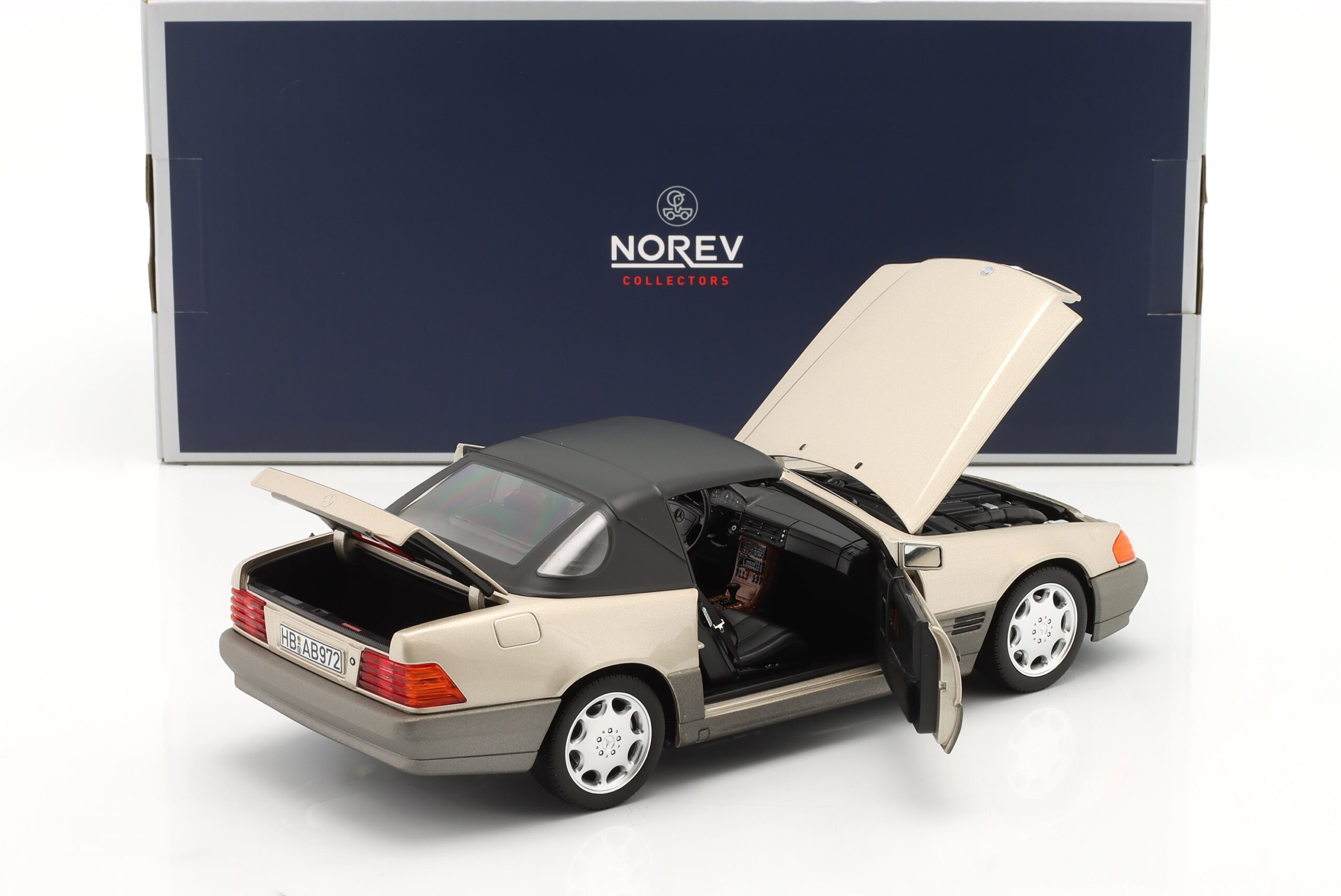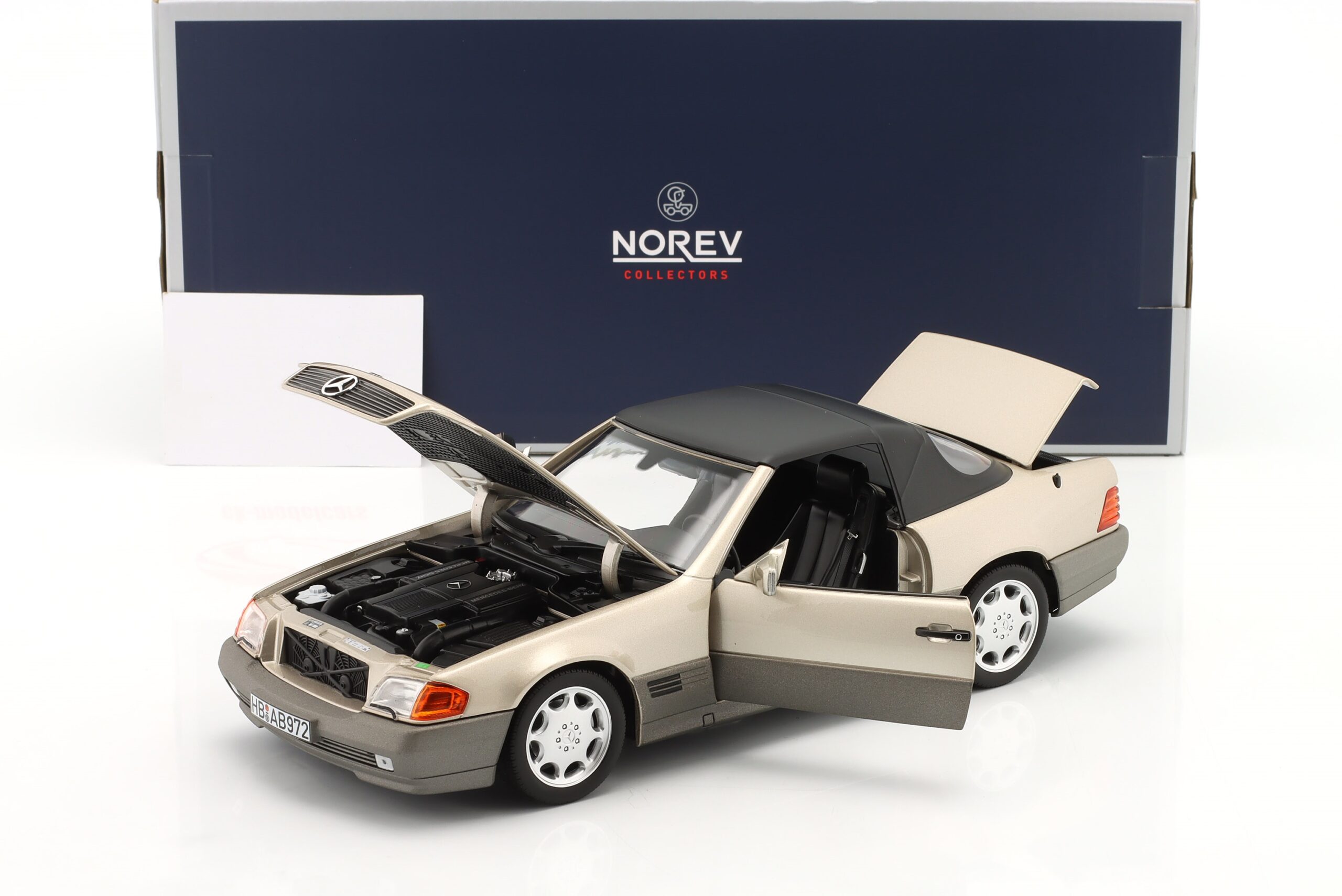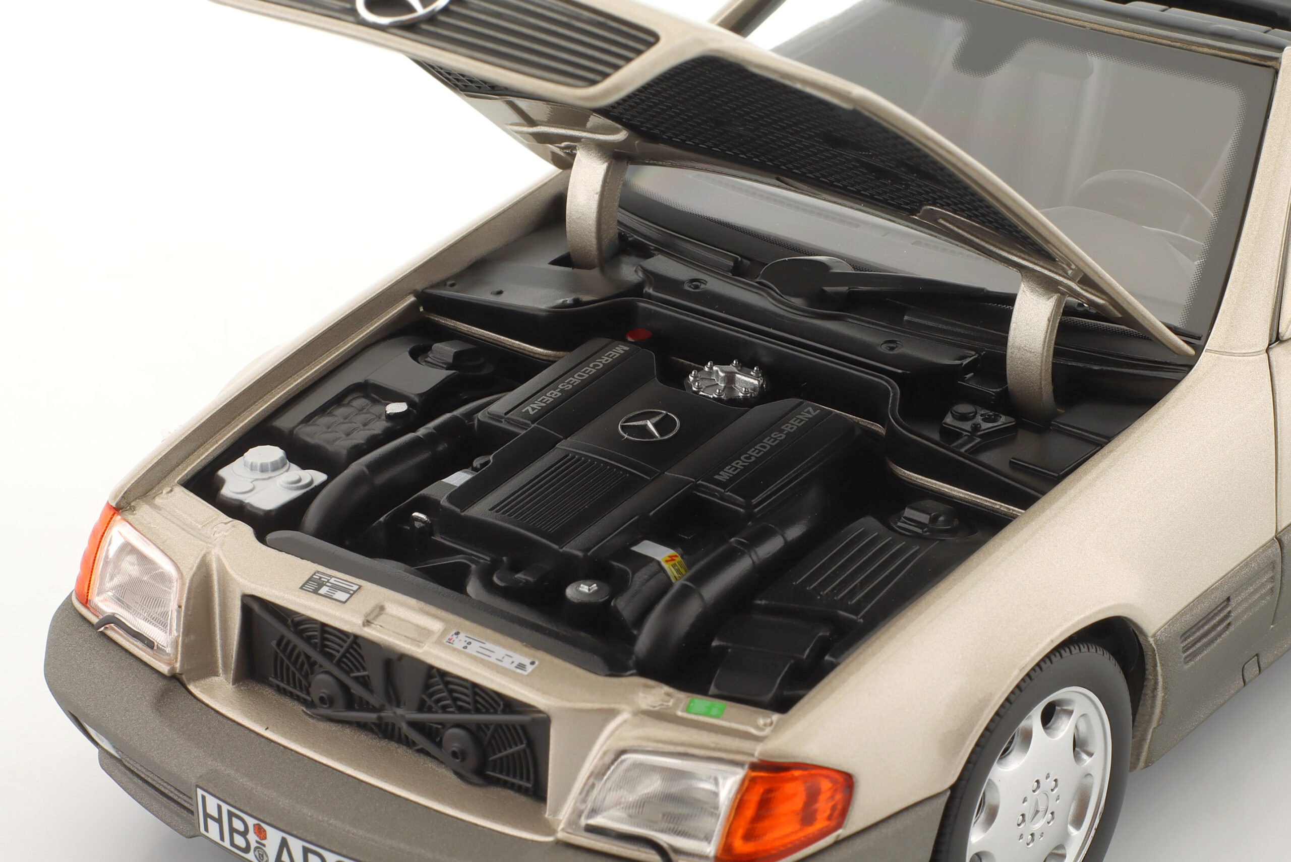Kolekcjonerski model metalowy z elementami plastikowymi samochodu MERCEDES-BENZ 500SL (R129) z roku 1989 (wersja przedliftowa) w kolorze Smoke Silver metallic.Model posiada otwierane drzwi,pokrywę silnika i bagażnika.