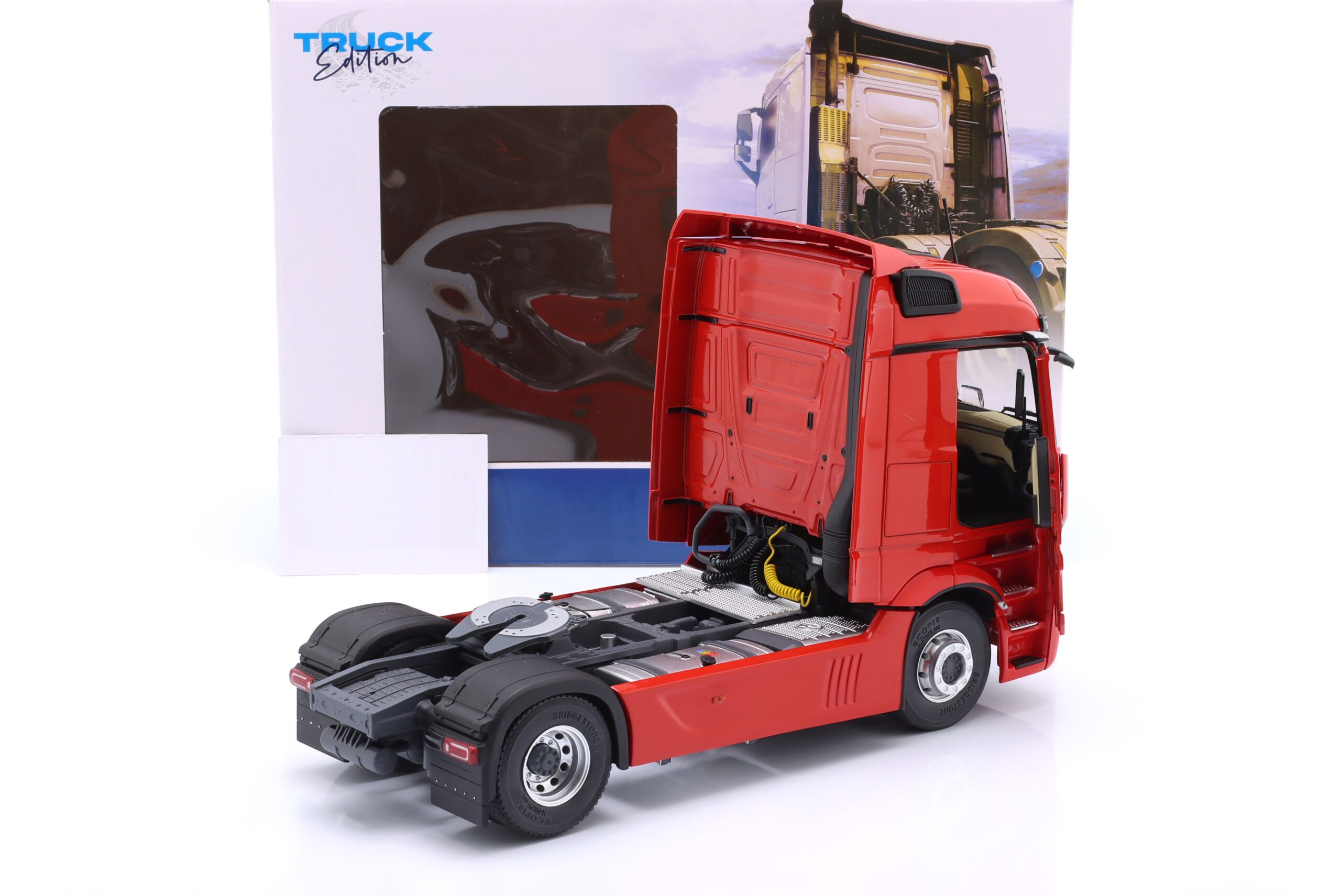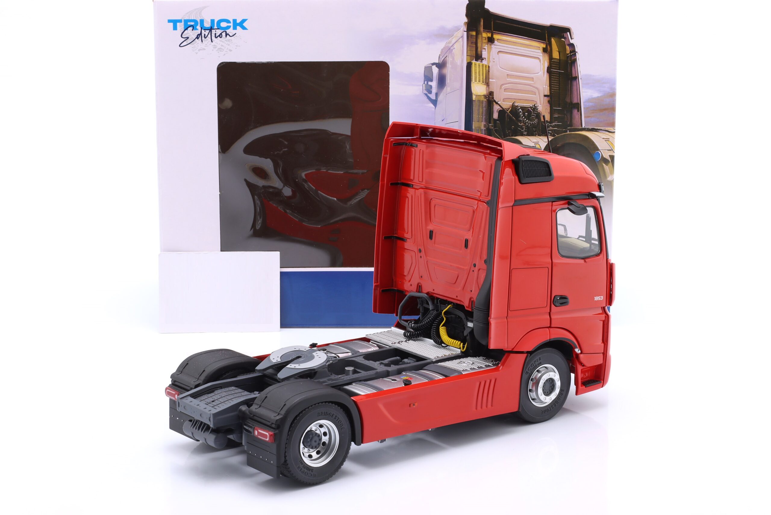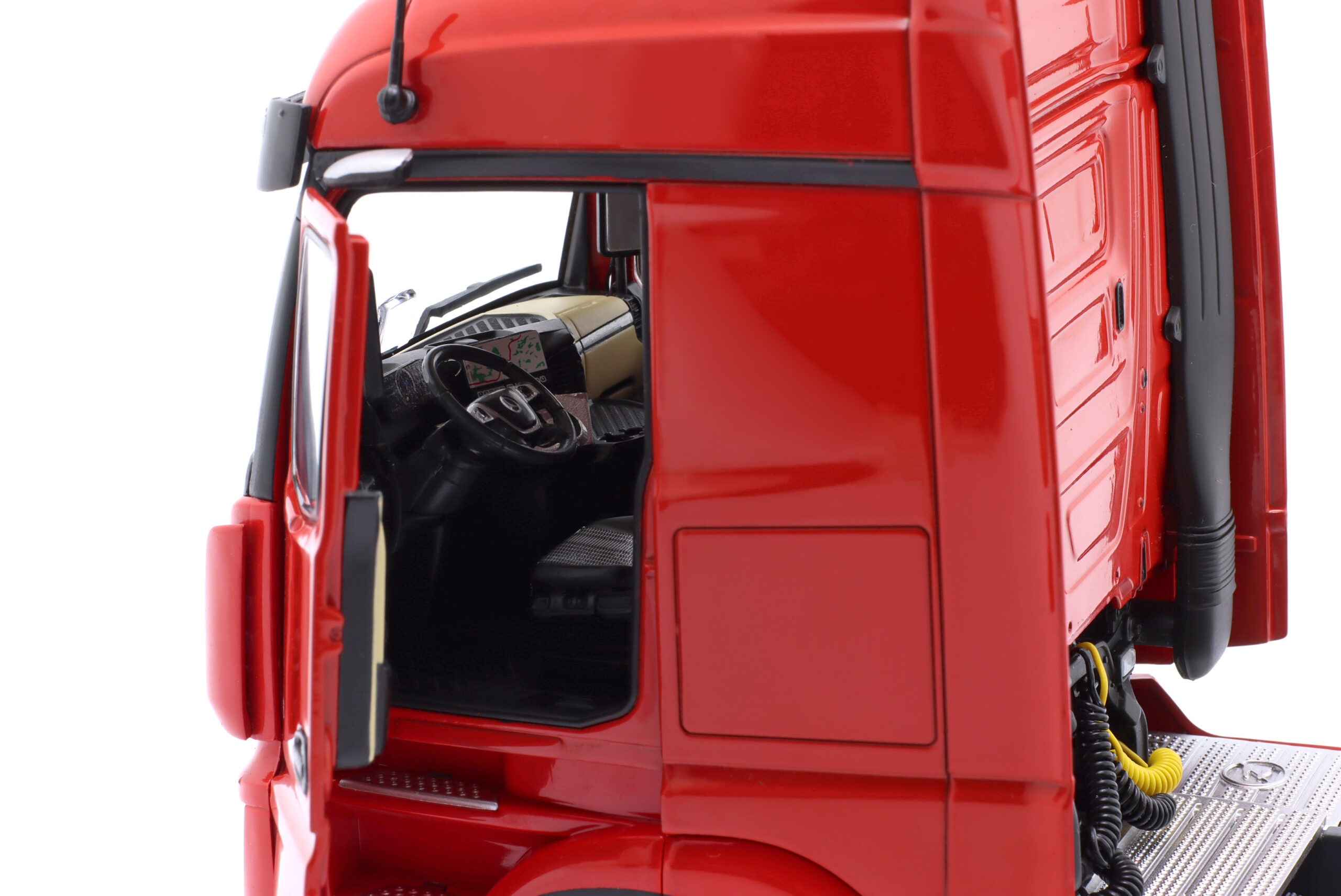 Kolekcjonerski model metalowy z elementami plastikowymi ciągnika siodłowego MERCEDES-BENZ ACTROS SZM z roku 2019 w kolorze Lava Red.