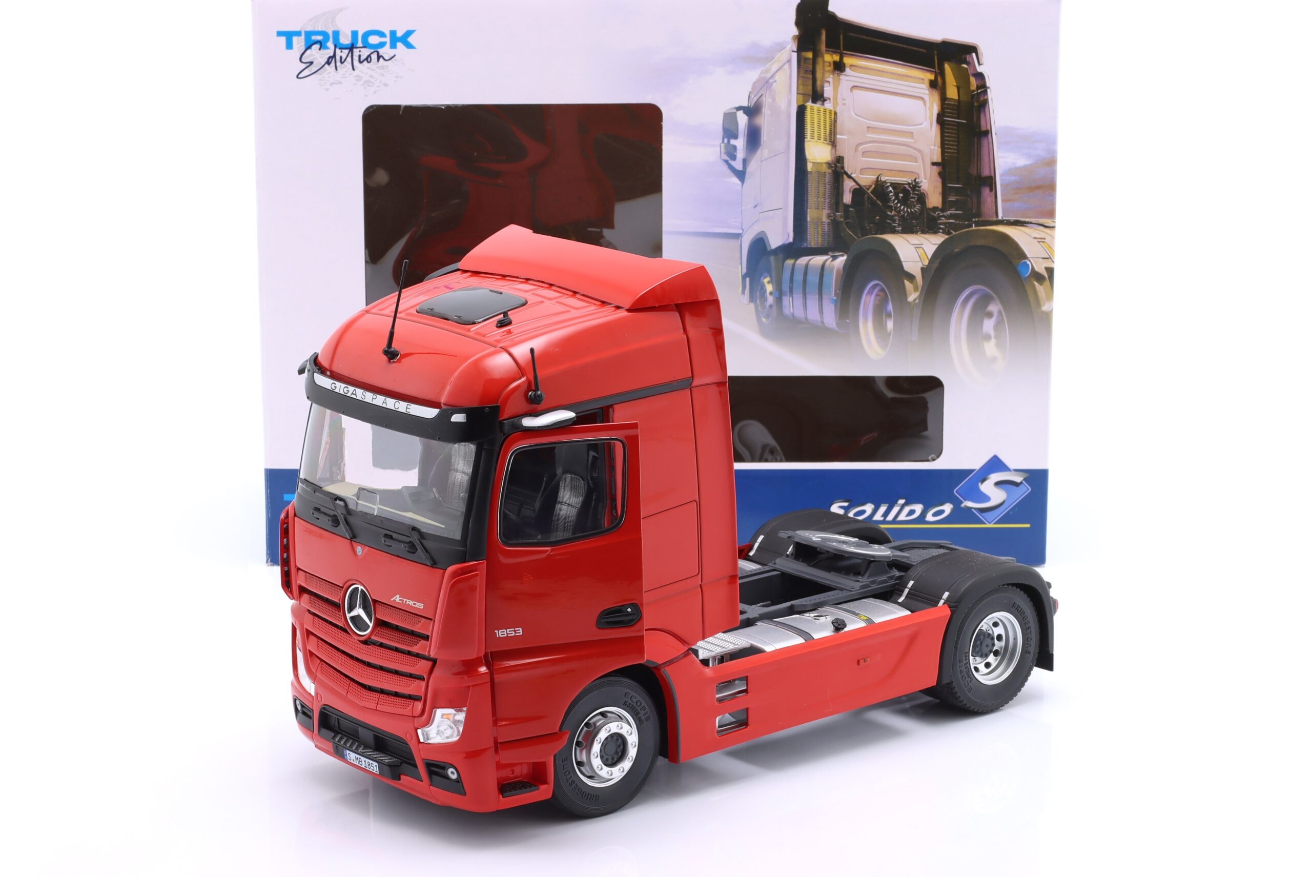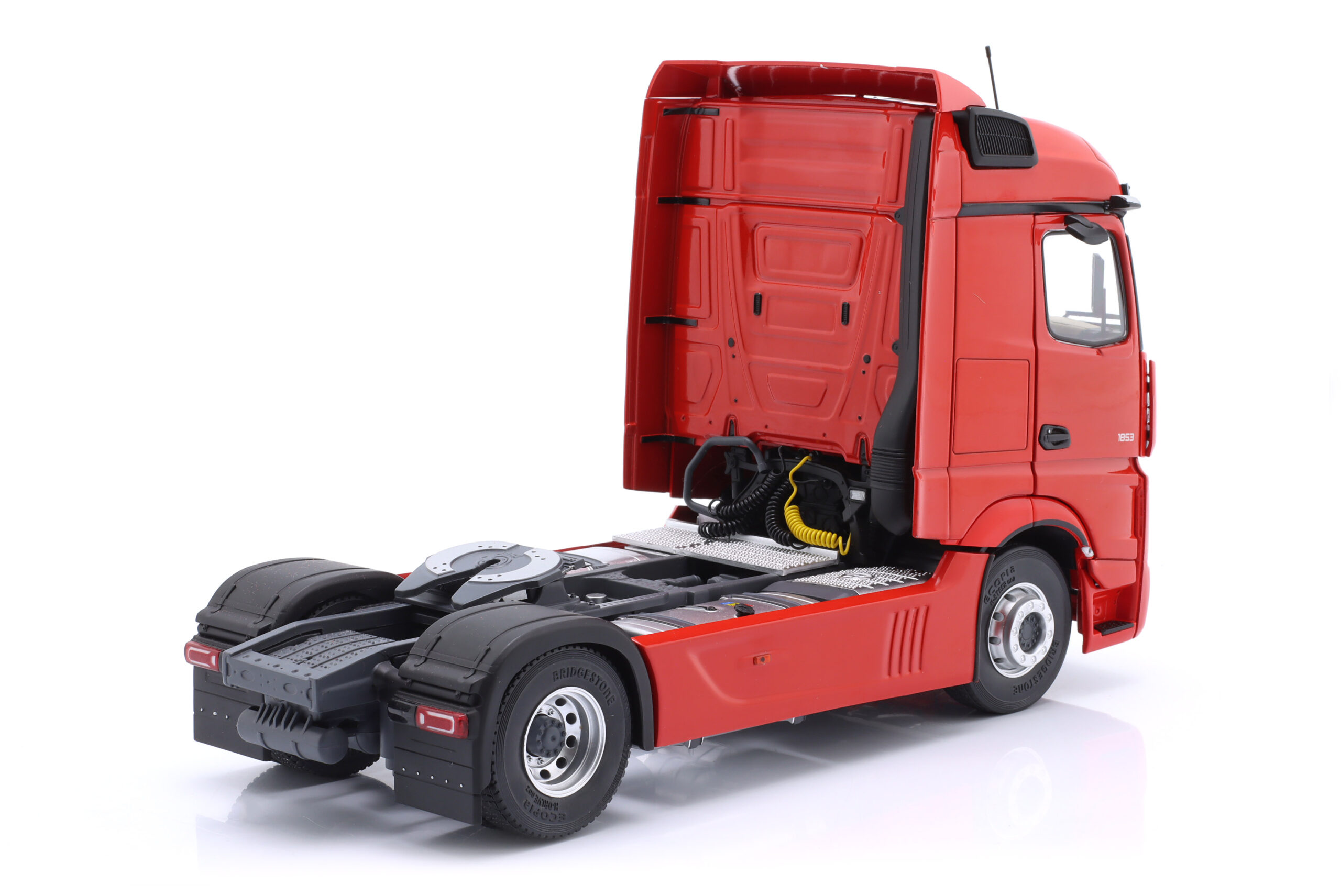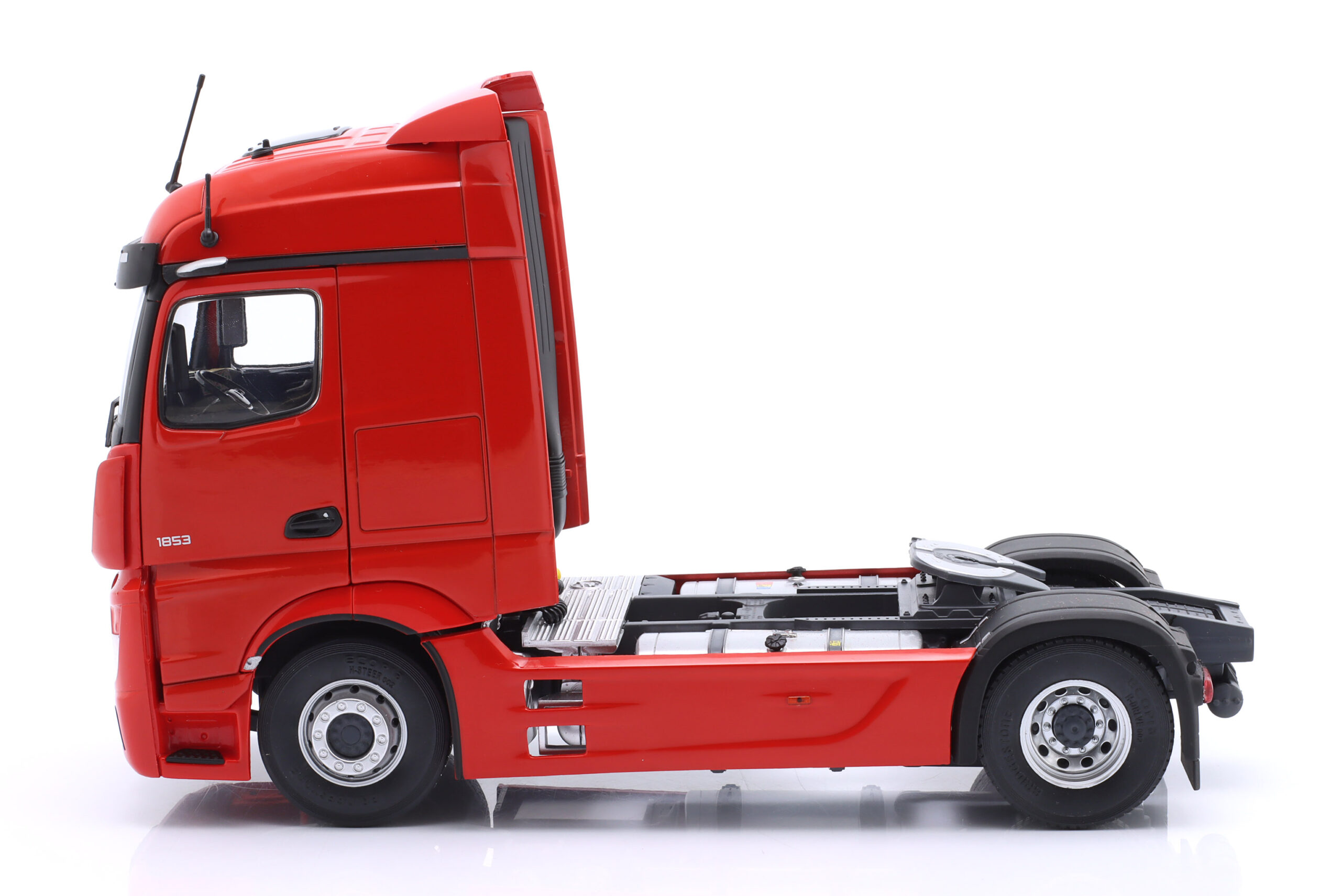 Kolekcjonerski model metalowy z elementami plastikowymi ciągnika siodłowego MERCEDES-BENZ ACTROS SZM z roku 2019 w kolorze Lava Red.
