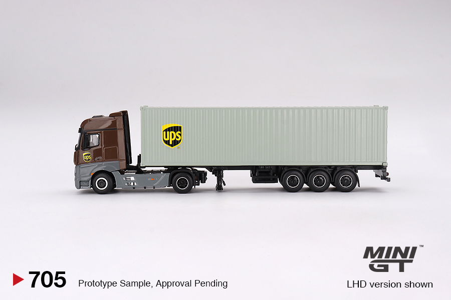 Kolekcjonerski model metalowy z elementami plastikowymi ciągnika siodłowego MERCEDES-BENZ ACTROS z naczepą kontenerem w malowaniu UPS Europe.Model zapakowany w kartonowe pudełko z rysunkiem samochodu.
