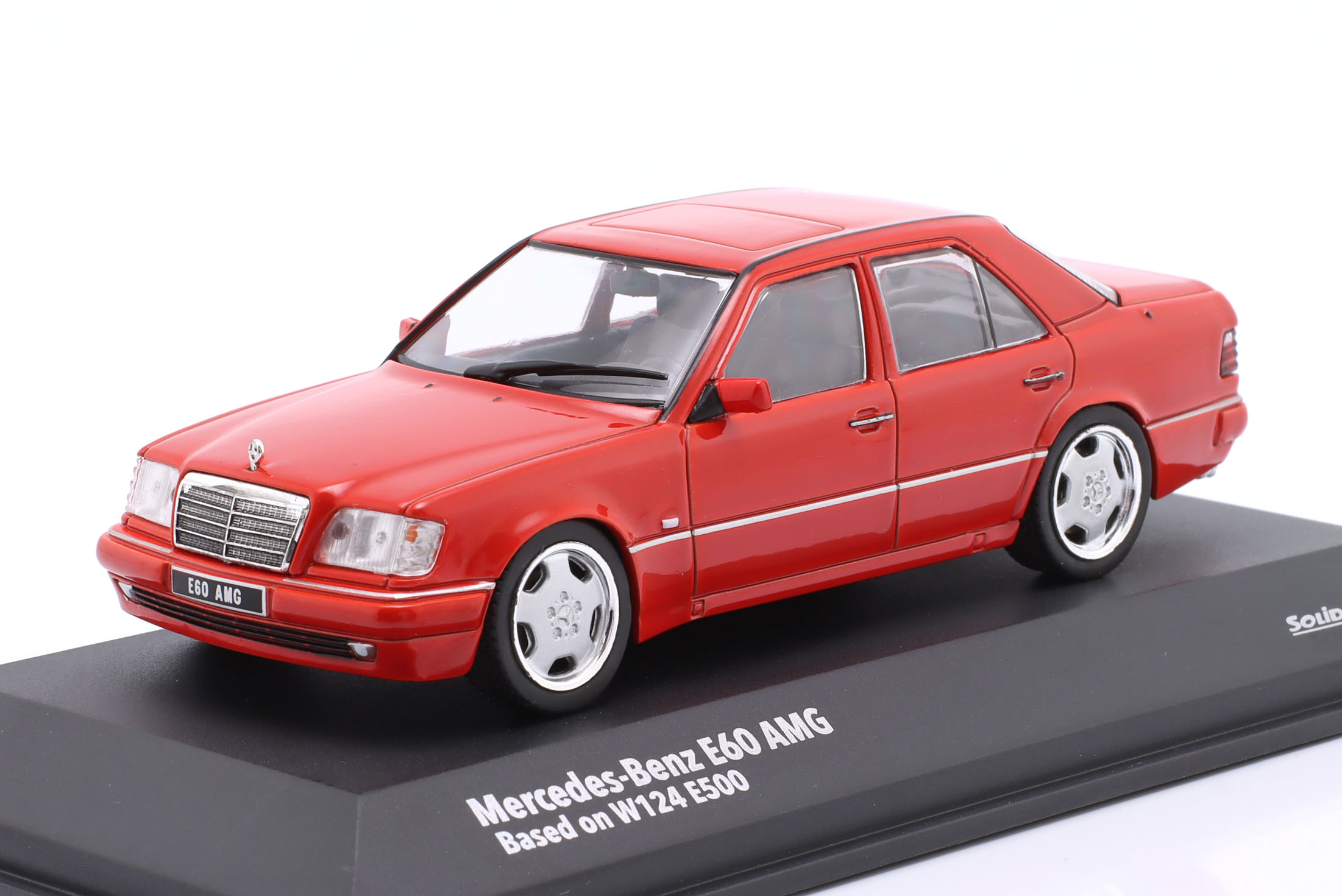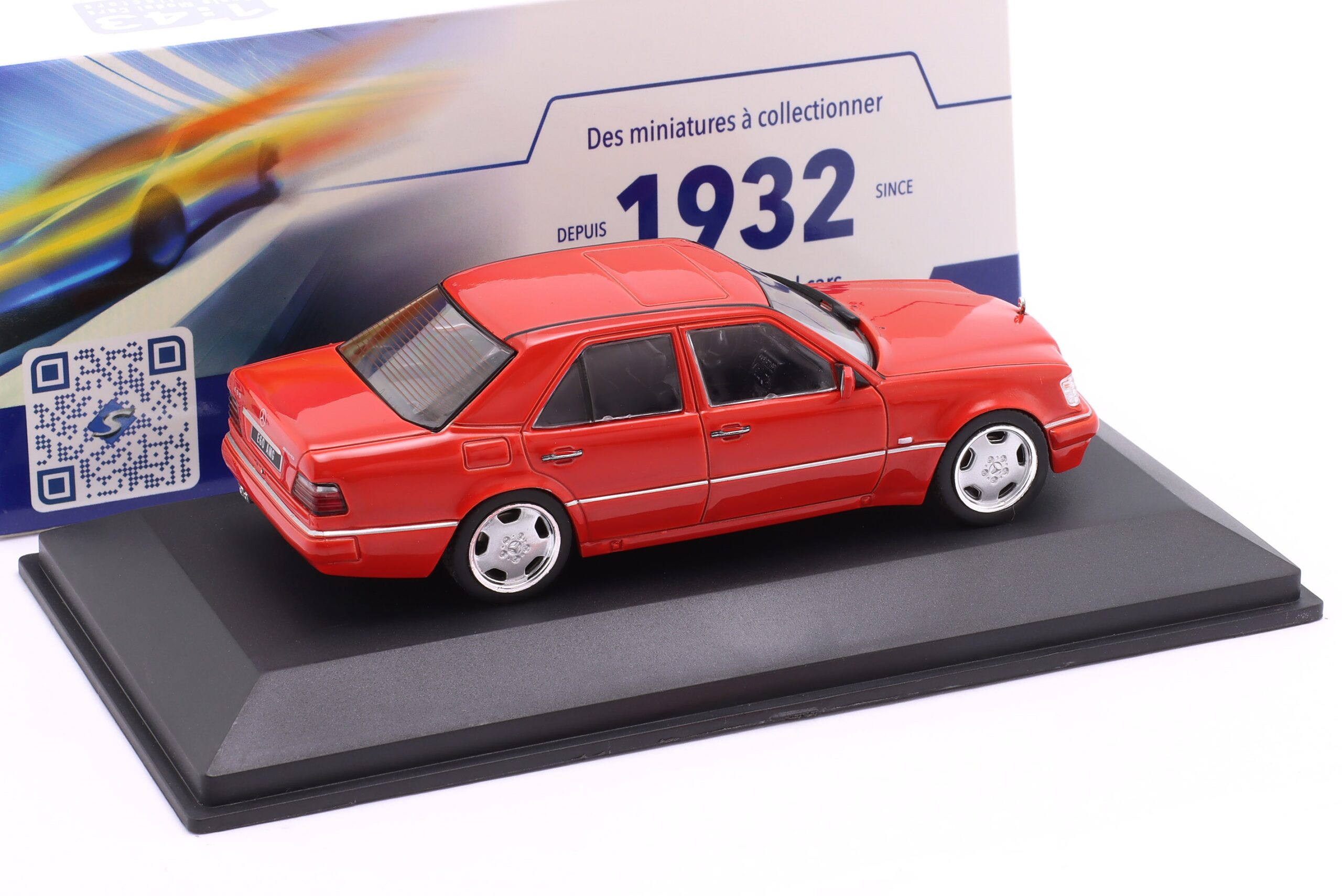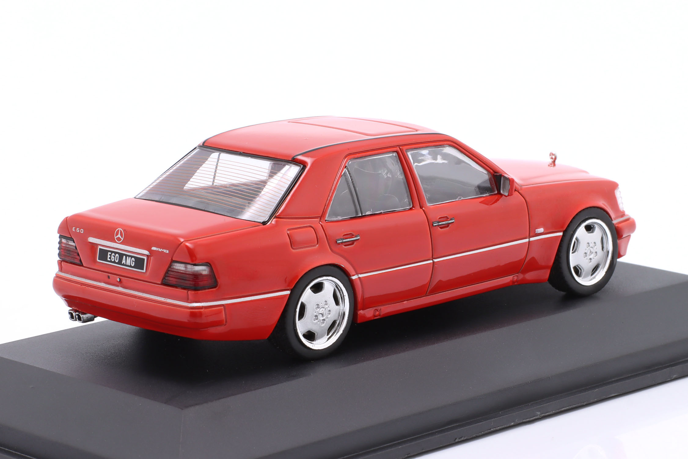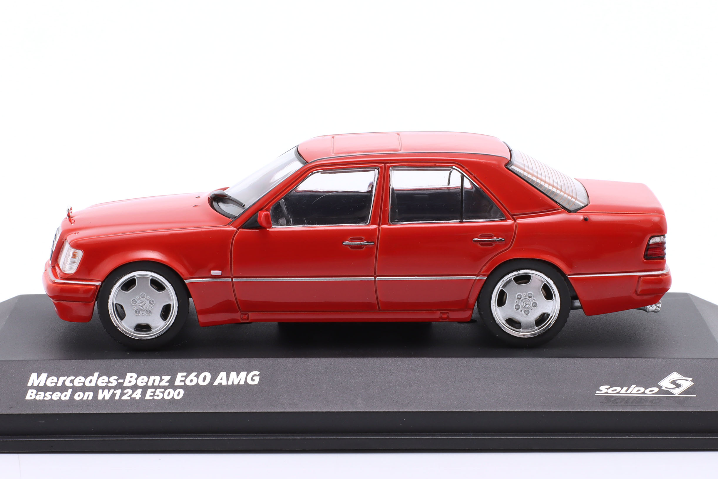Kolekcjonerski model metalowy z elementami plastikowymi samochodu MERCEDES-BENZ E60 AMG E500 (W124) z roku 1994 w kolorze Signal Red.Model na podstawce,posiada akrylową gablotkę ekspozycyjną.