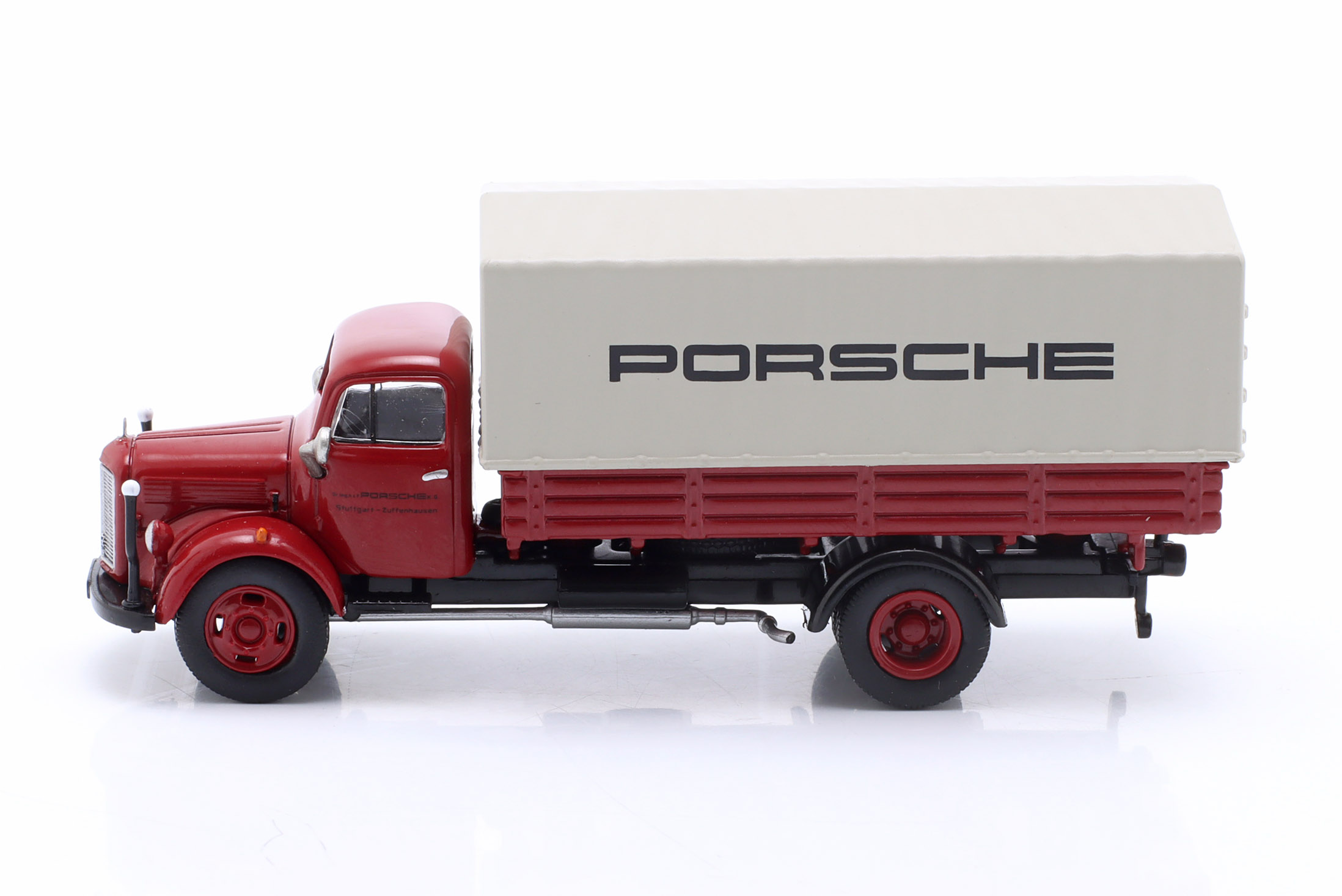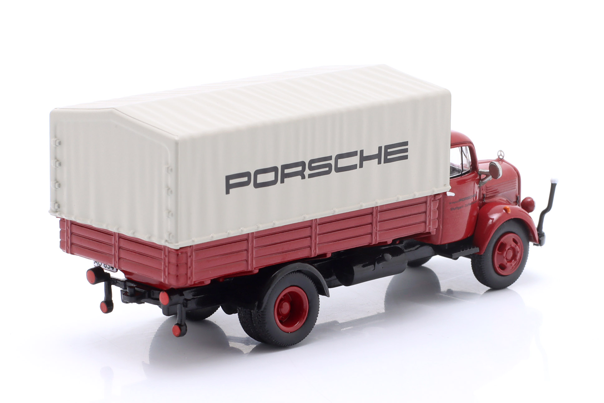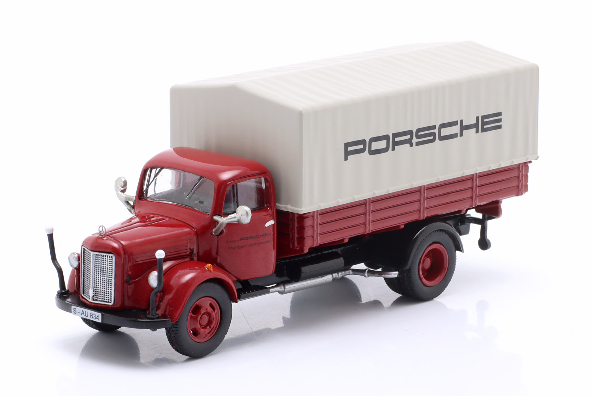 Kolekcjonerski model wmetalowy z elementami plastikowymi samochodu ciężarowego MERCEDES-BENZ L3500 z plandeką z roku 1950 w malowaniu „PORSCHE”