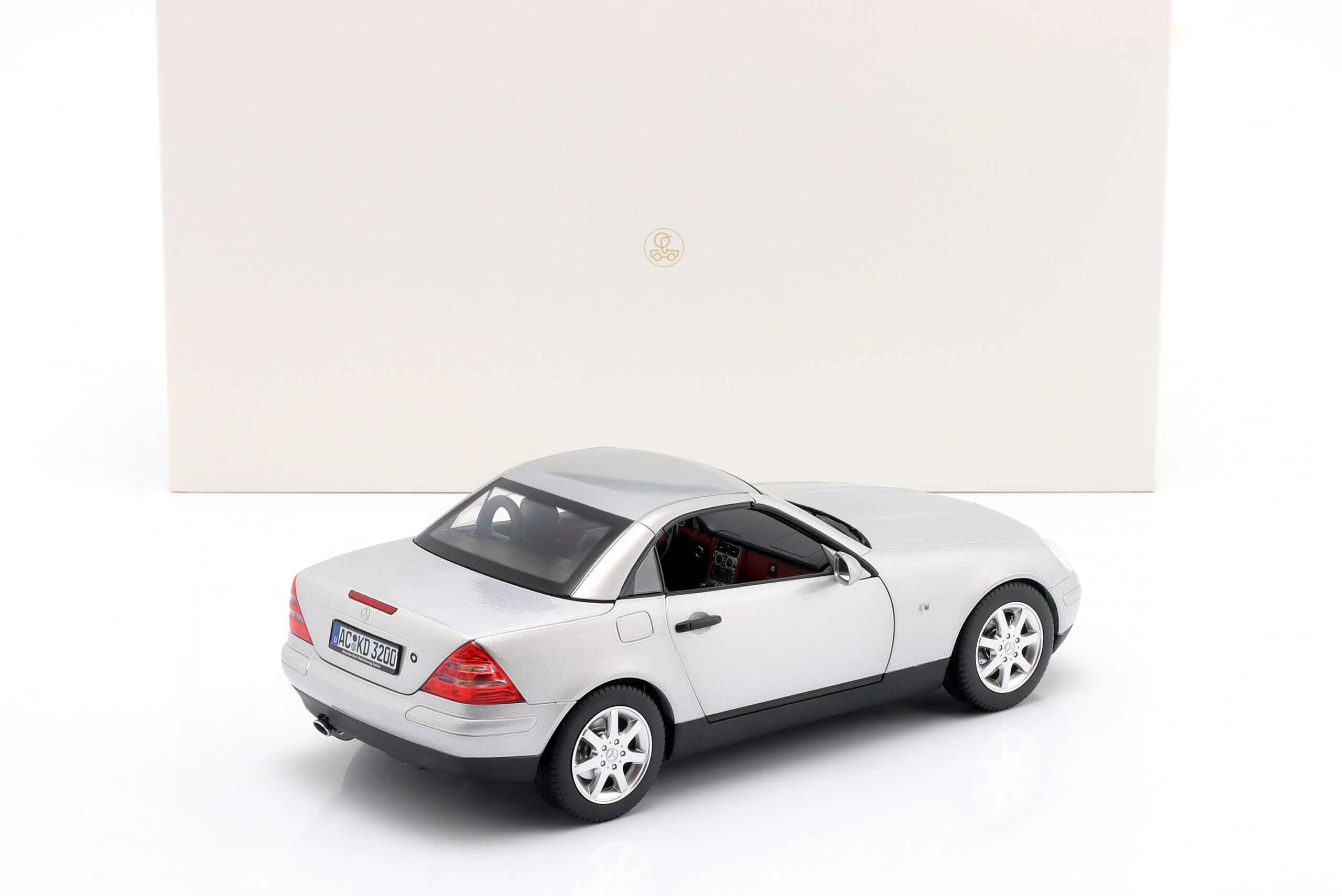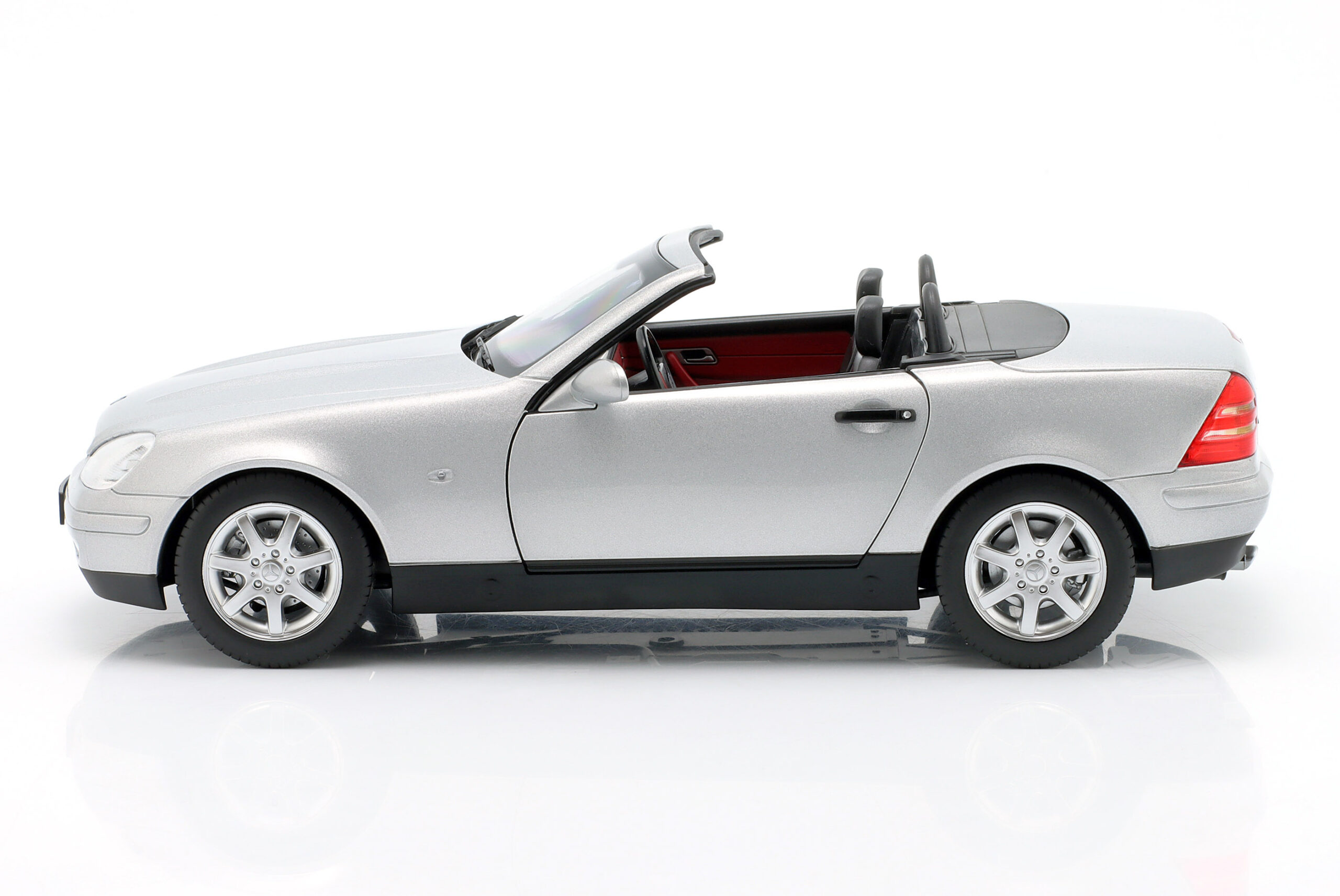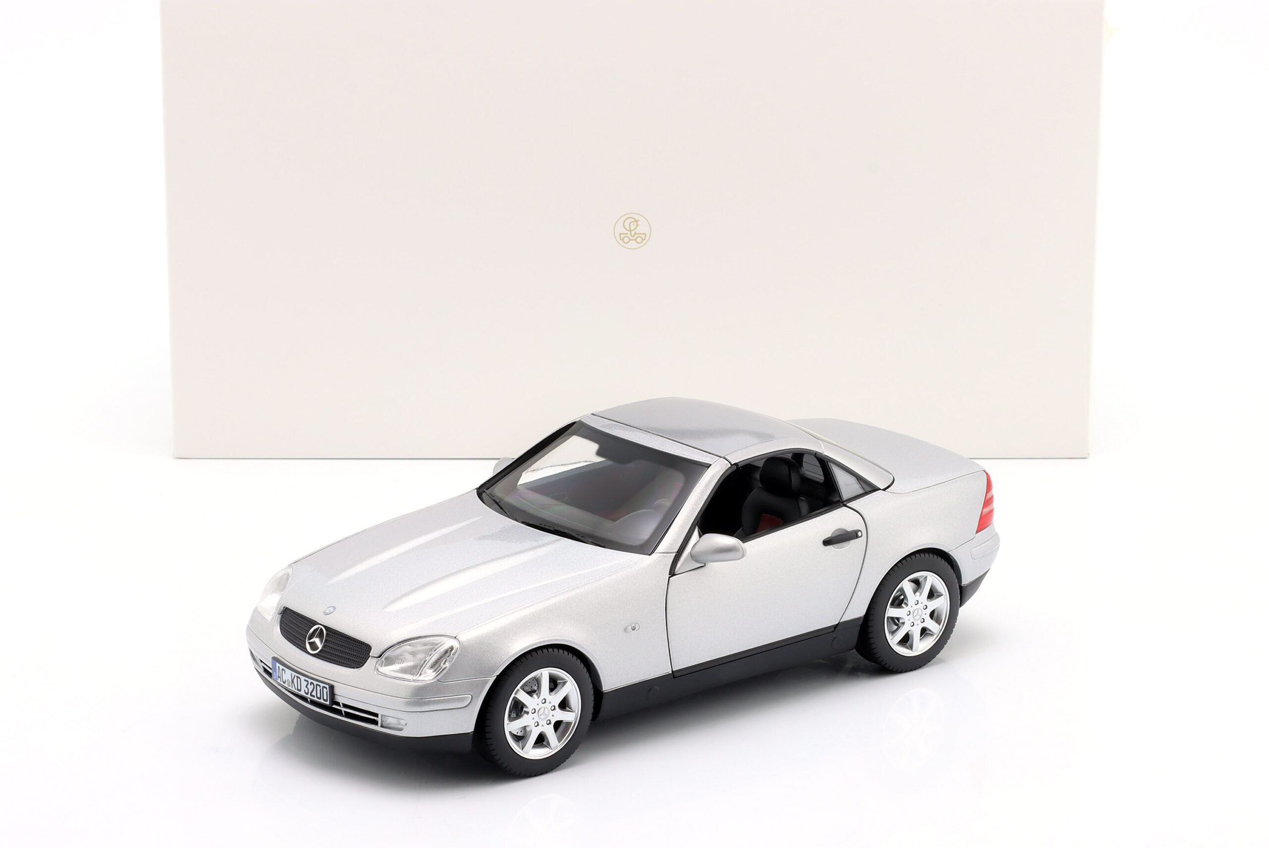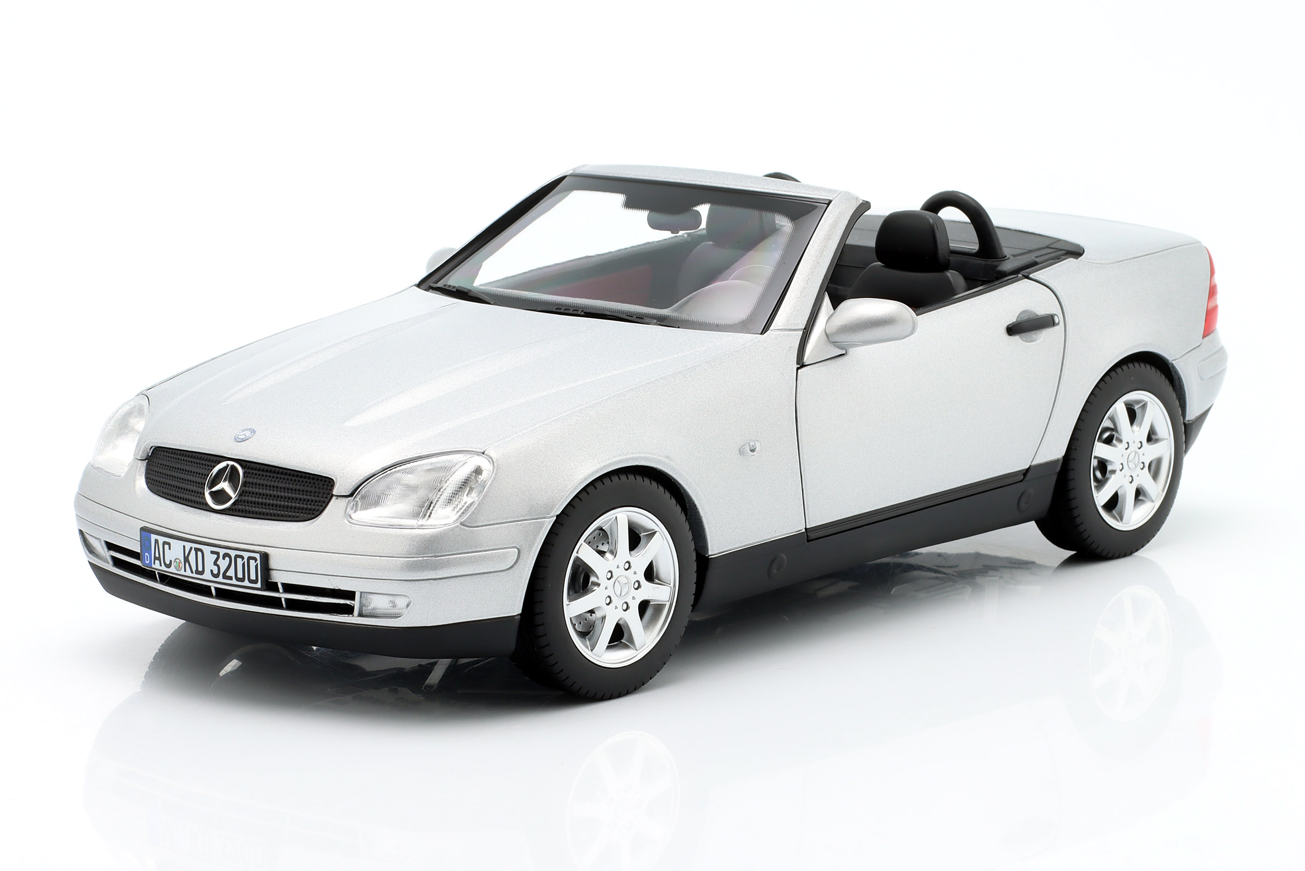 Kolekcjonerski model metalowy z elementami plastikowymi samochodu MERCEDES-BENZ SLK z roku 1996 w kolorze Brilliant silver.