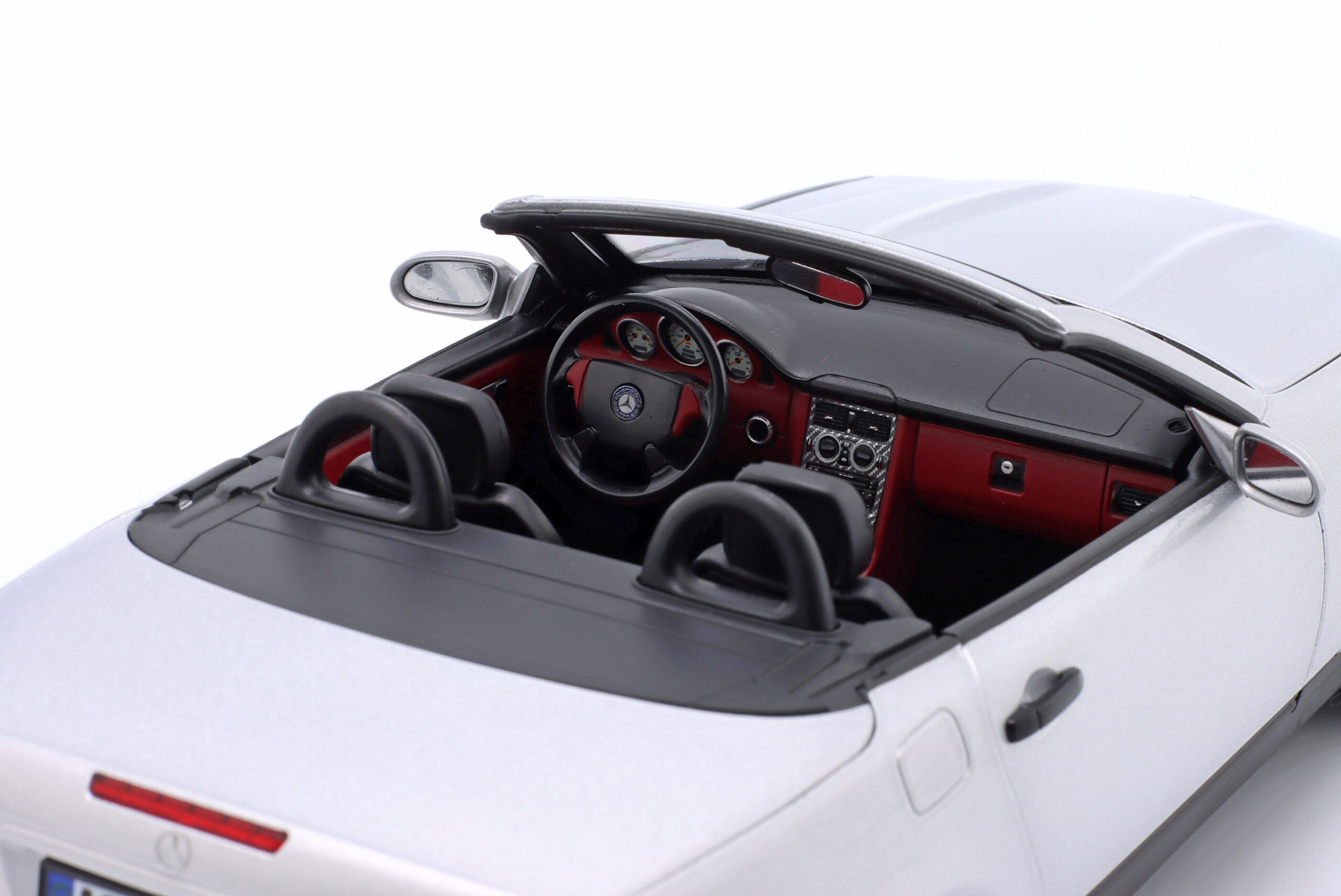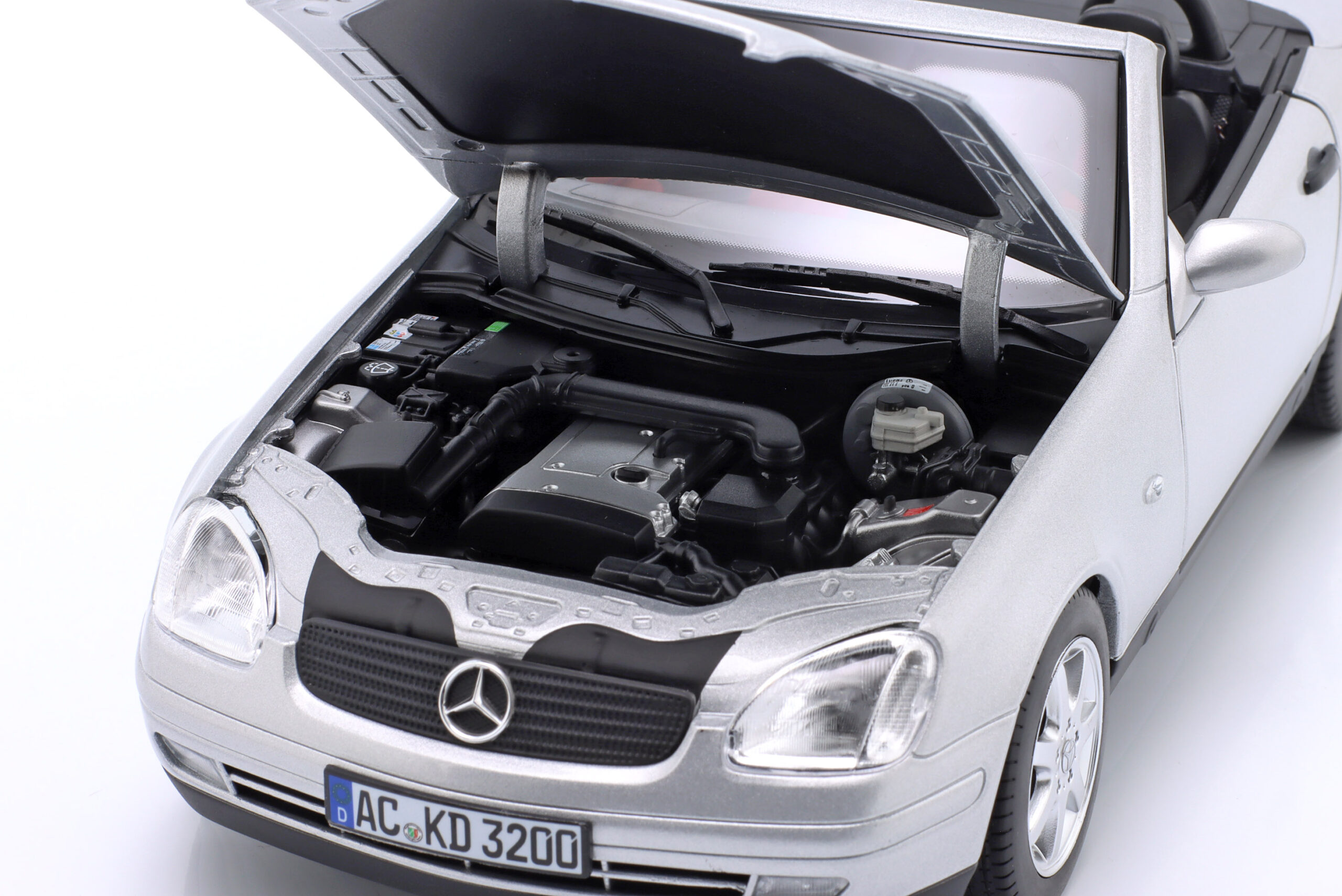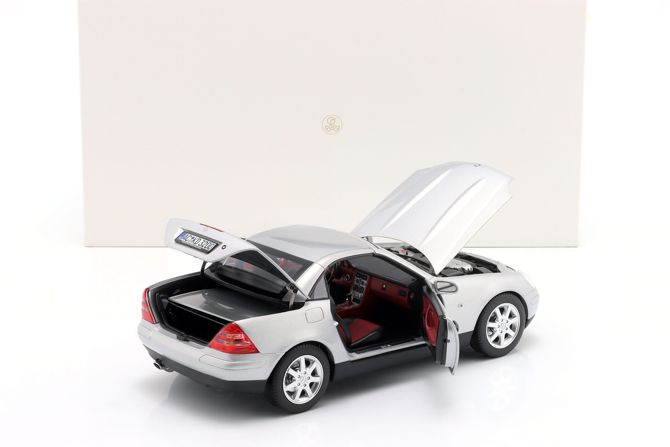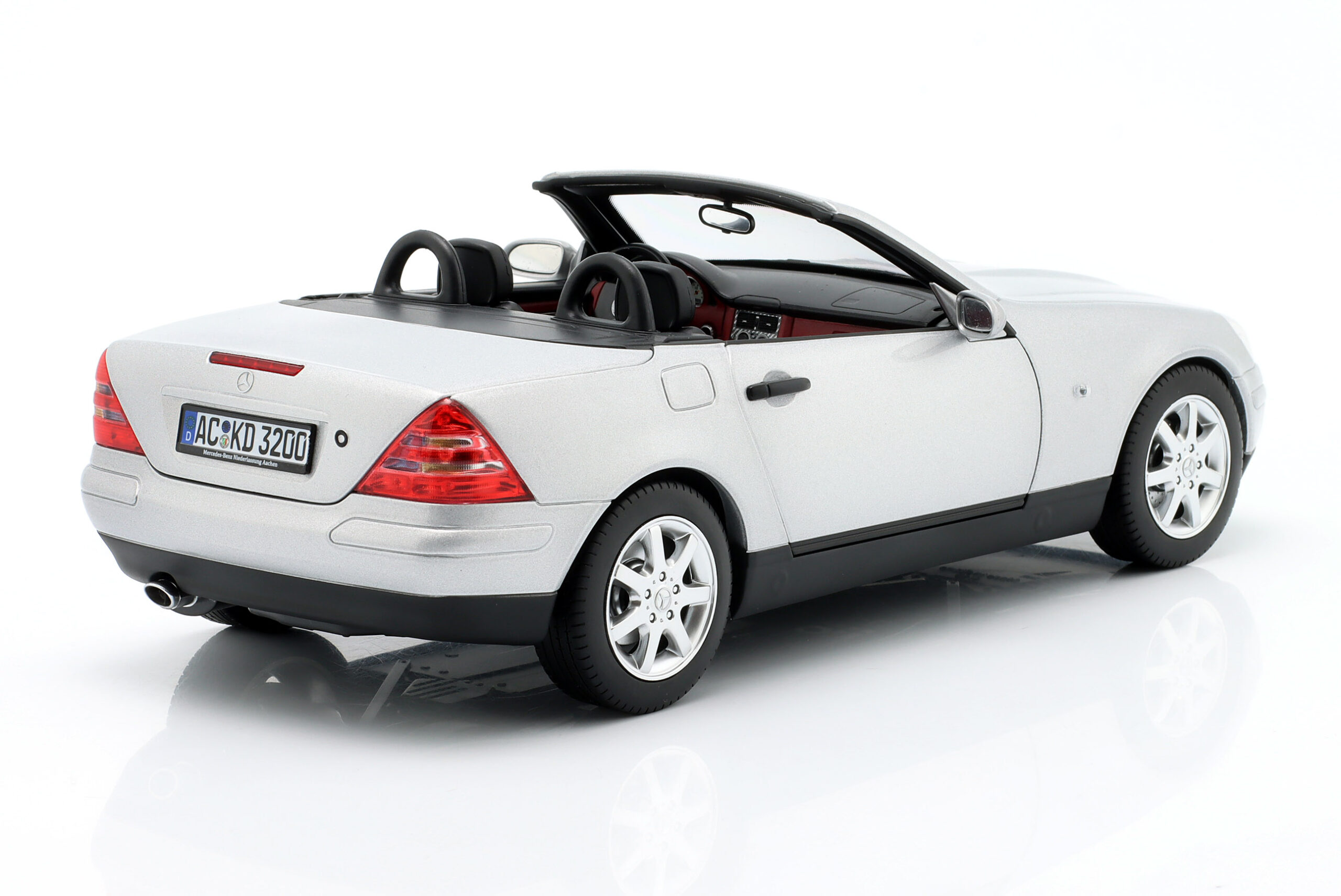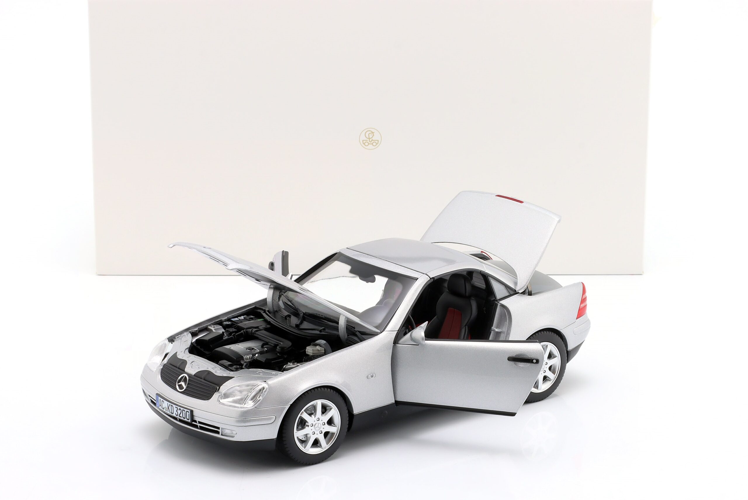 Kolekcjonerski model metalowy z elementami plastikowymi samochodu MERCEDES-BENZ SLK z roku 1996 w kolorze Brilliant silver.