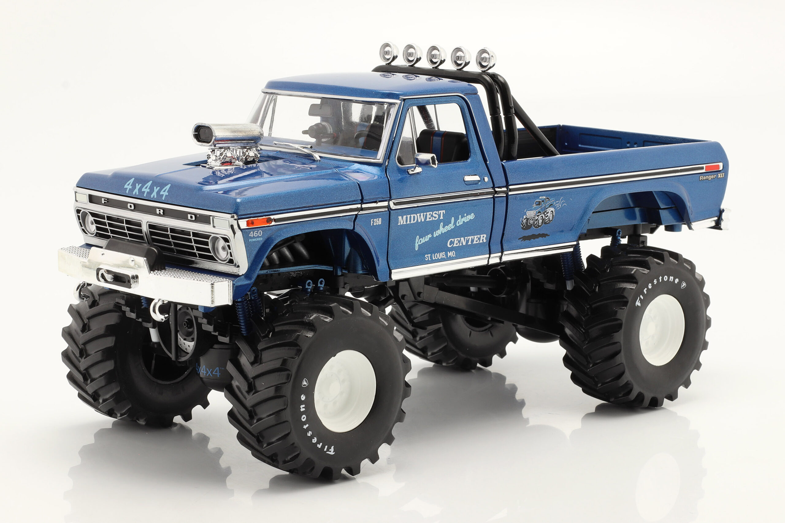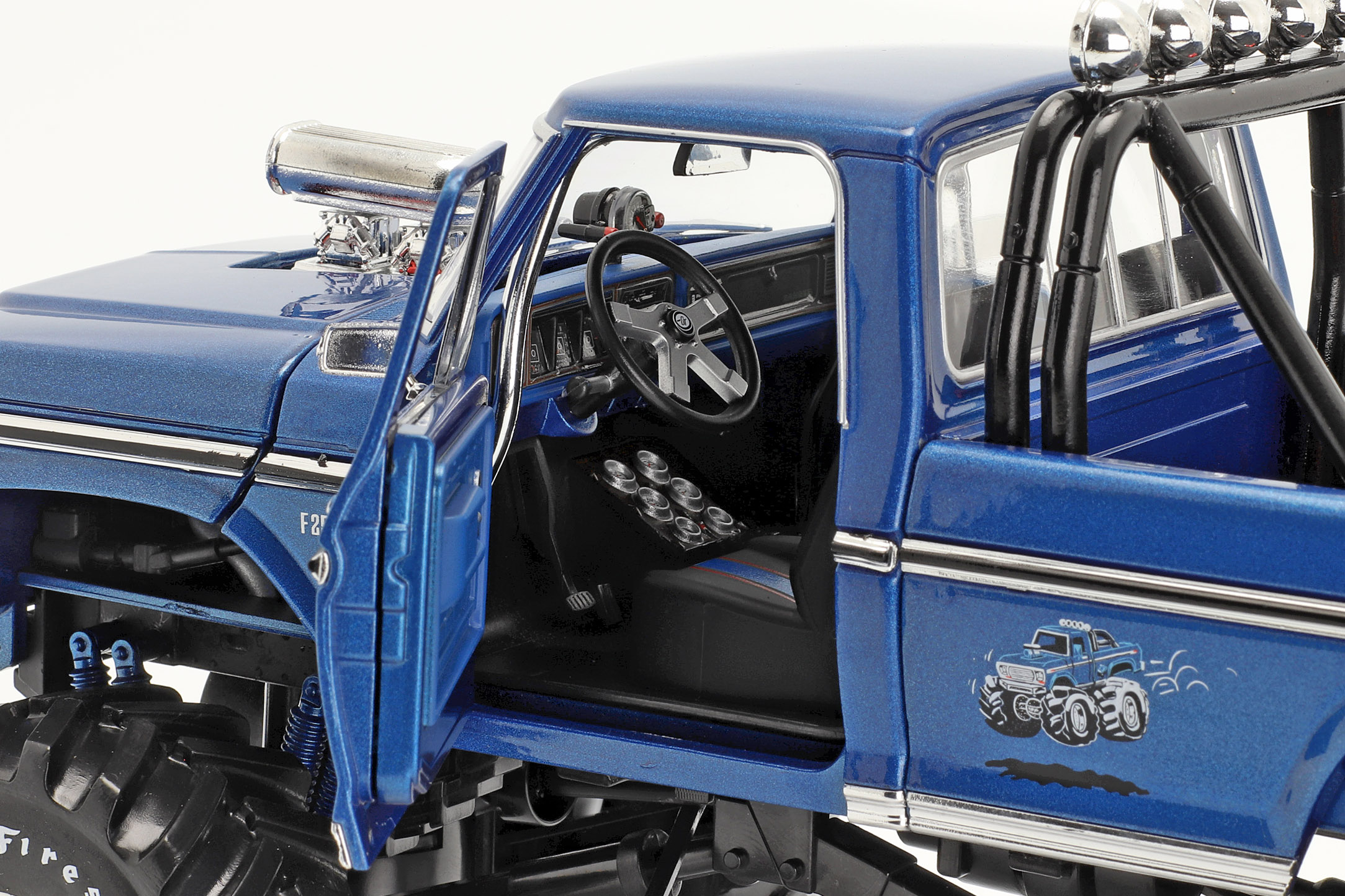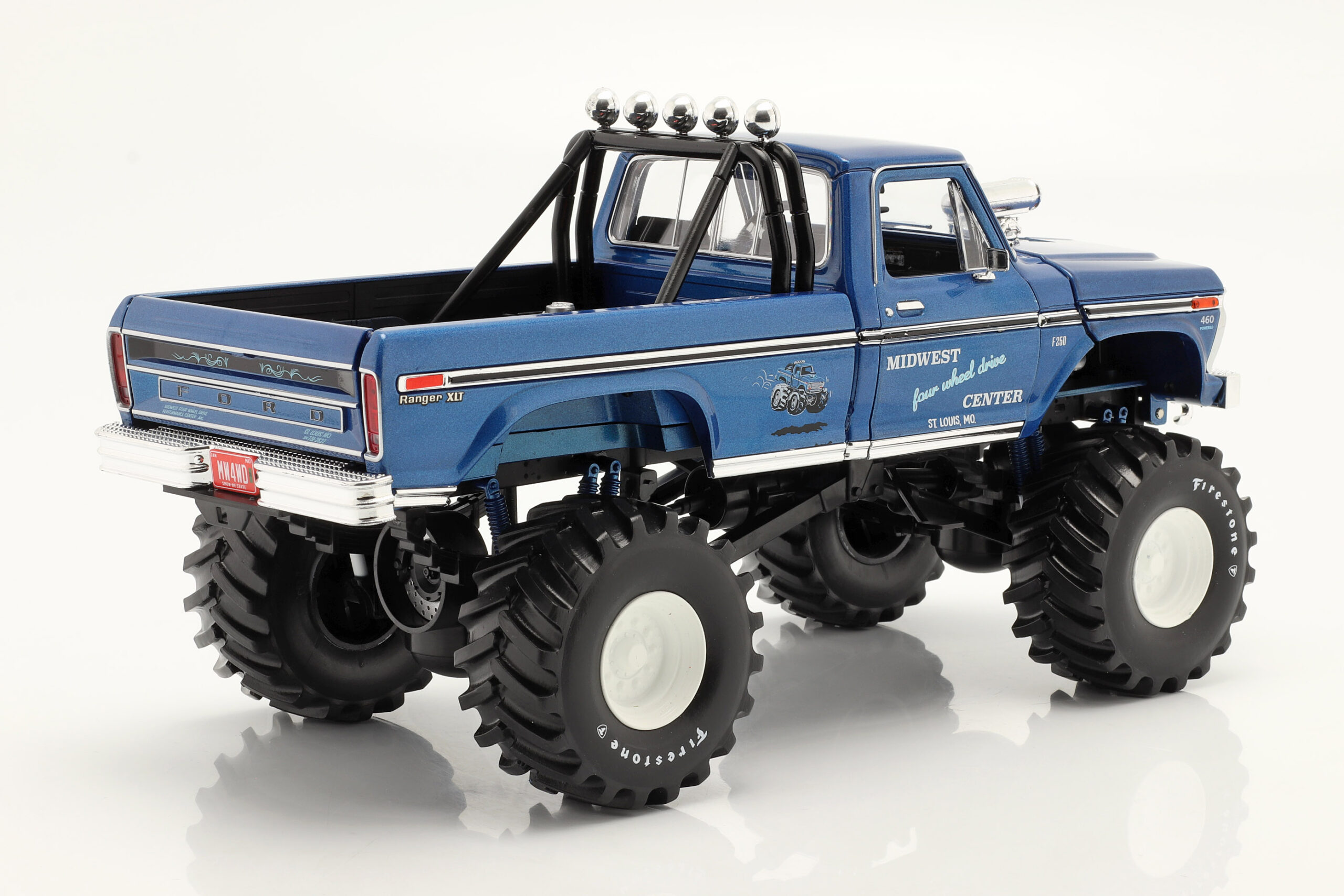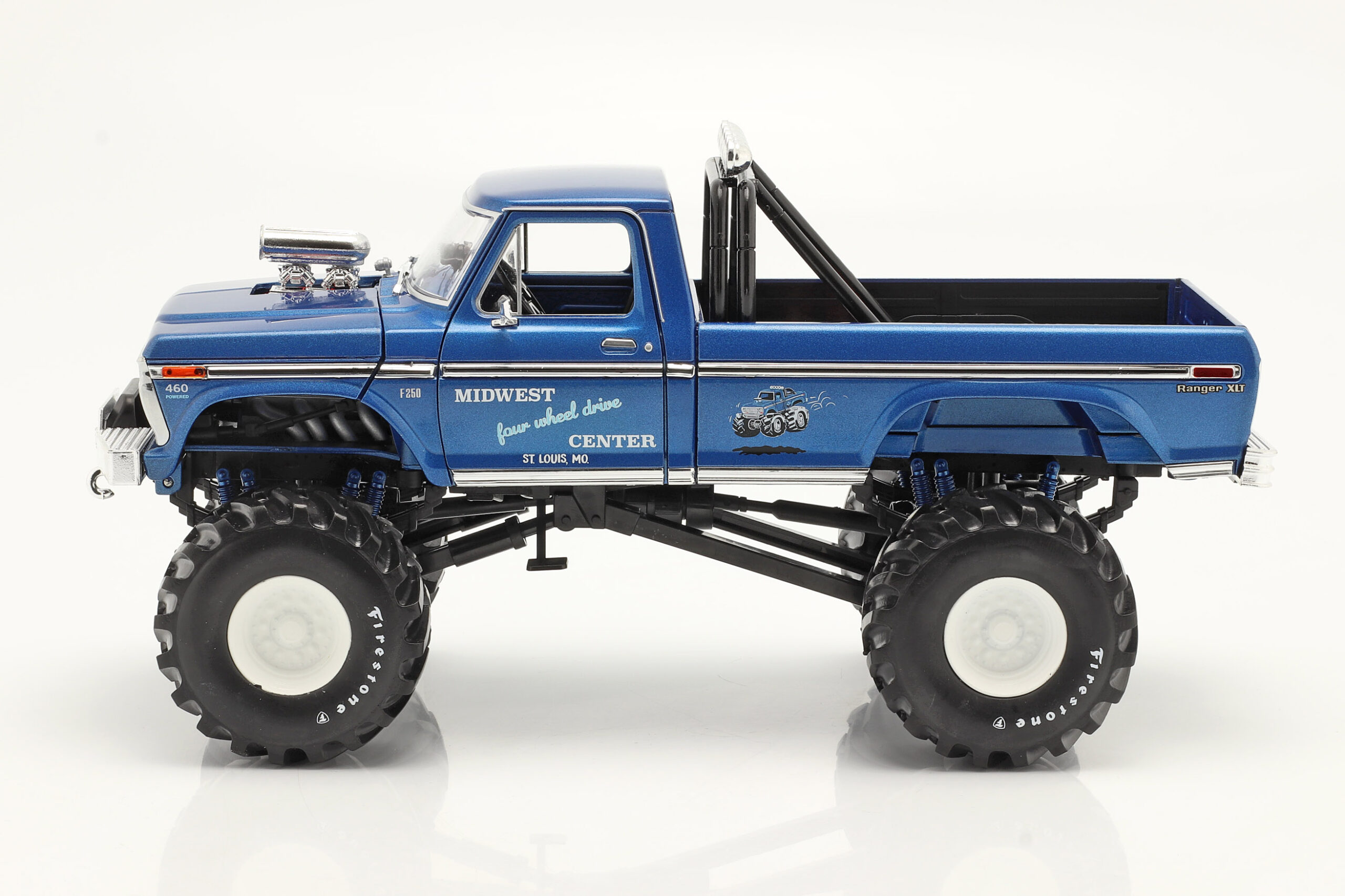 Kolekcjonerski model metalowy z elementami plastikowymi MONSTER TRUCKA Midwest Four Wheel Drive & Performance Center FORD F-250 Monster Truck (with 48-inch Tires) z roku 1974 w kolorze Niebieskim.Model ma otwierane drzwi,pokrywę silnika i bagażnika.