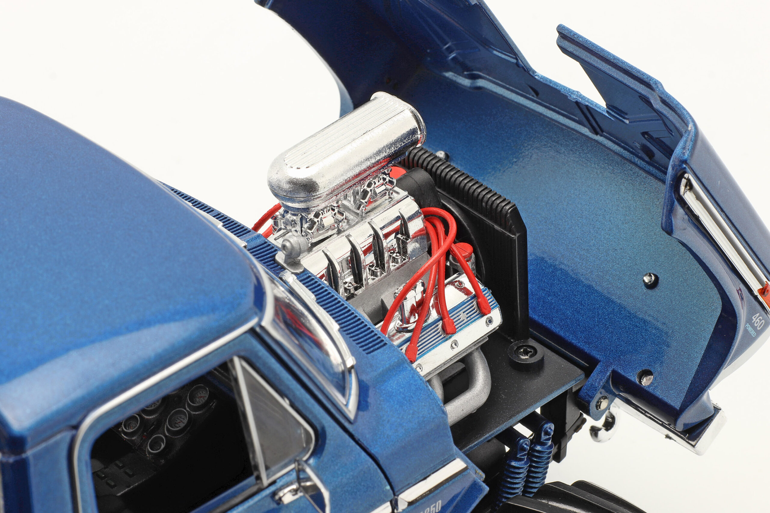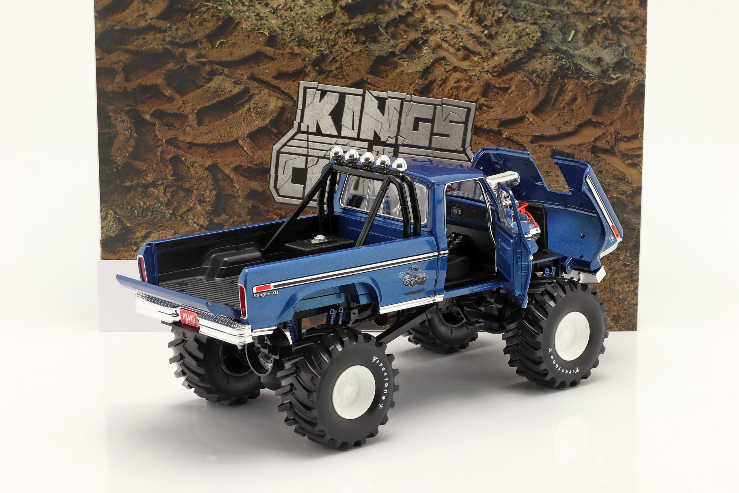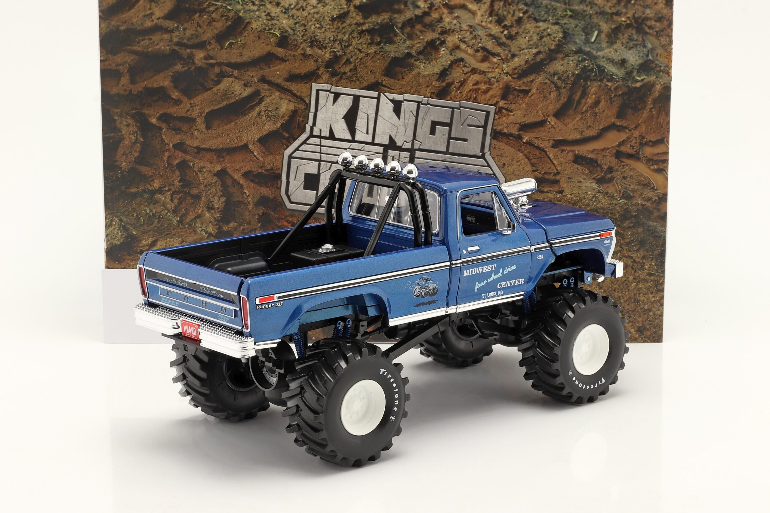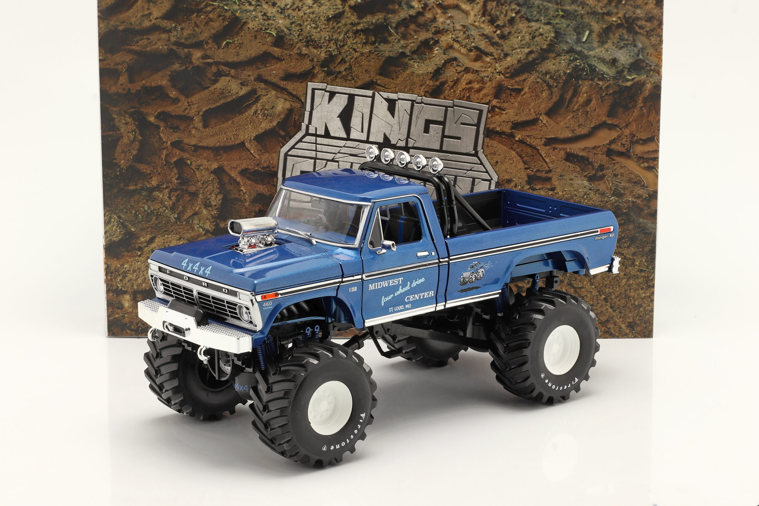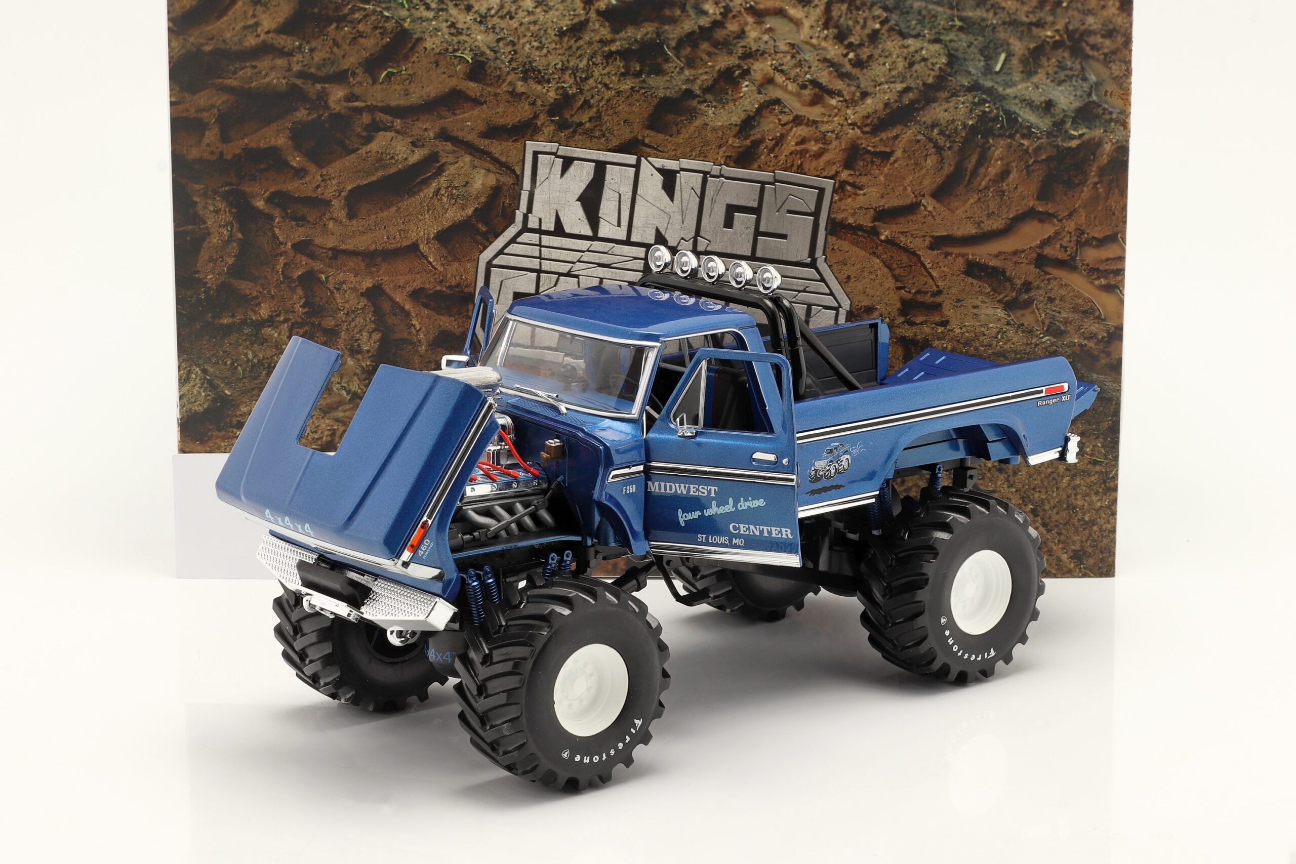 Kolekcjonerski model metalowy z elementami plastikowymi MONSTER TRUCKA Midwest Four Wheel Drive & Performance Center FORD F-250 Monster Truck (with 48-inch Tires) z roku 1974 w kolorze Niebieskim.Model ma otwierane drzwi,pokrywę silnika i bagażnika.