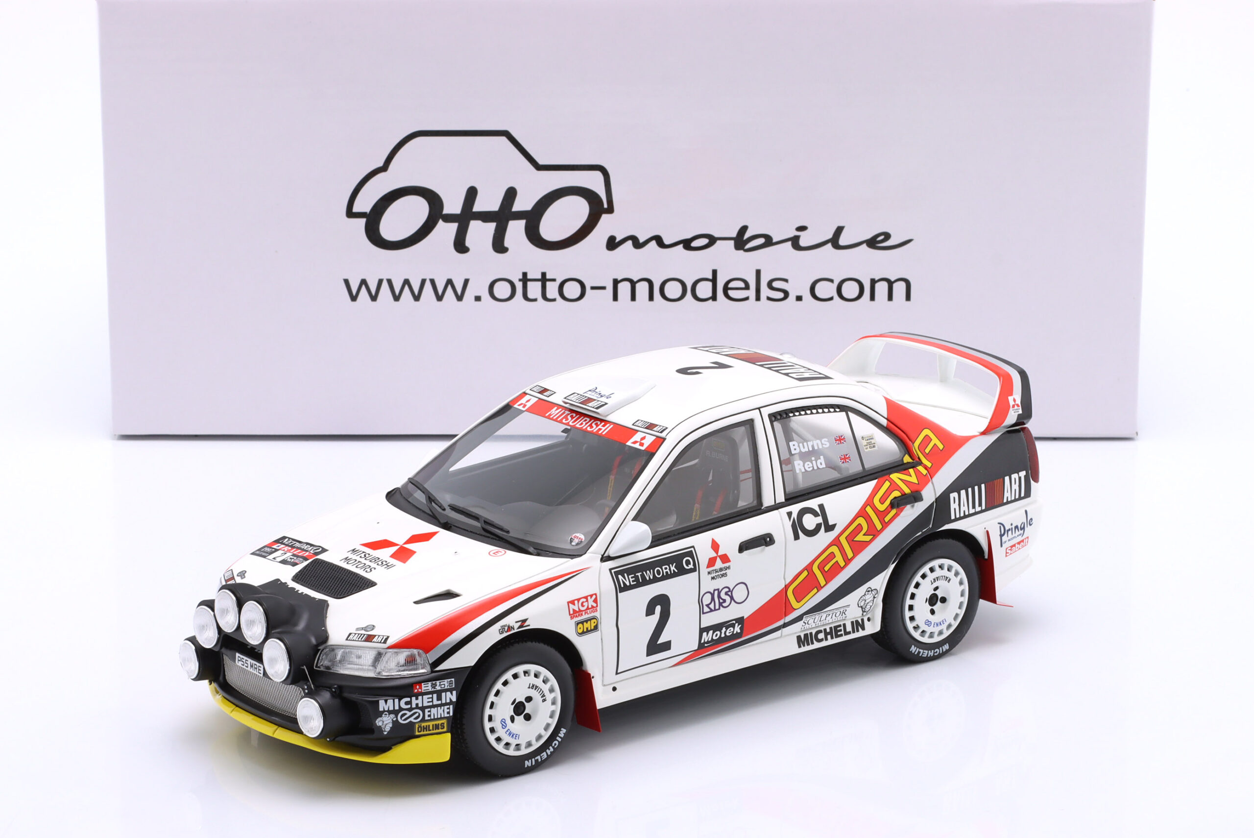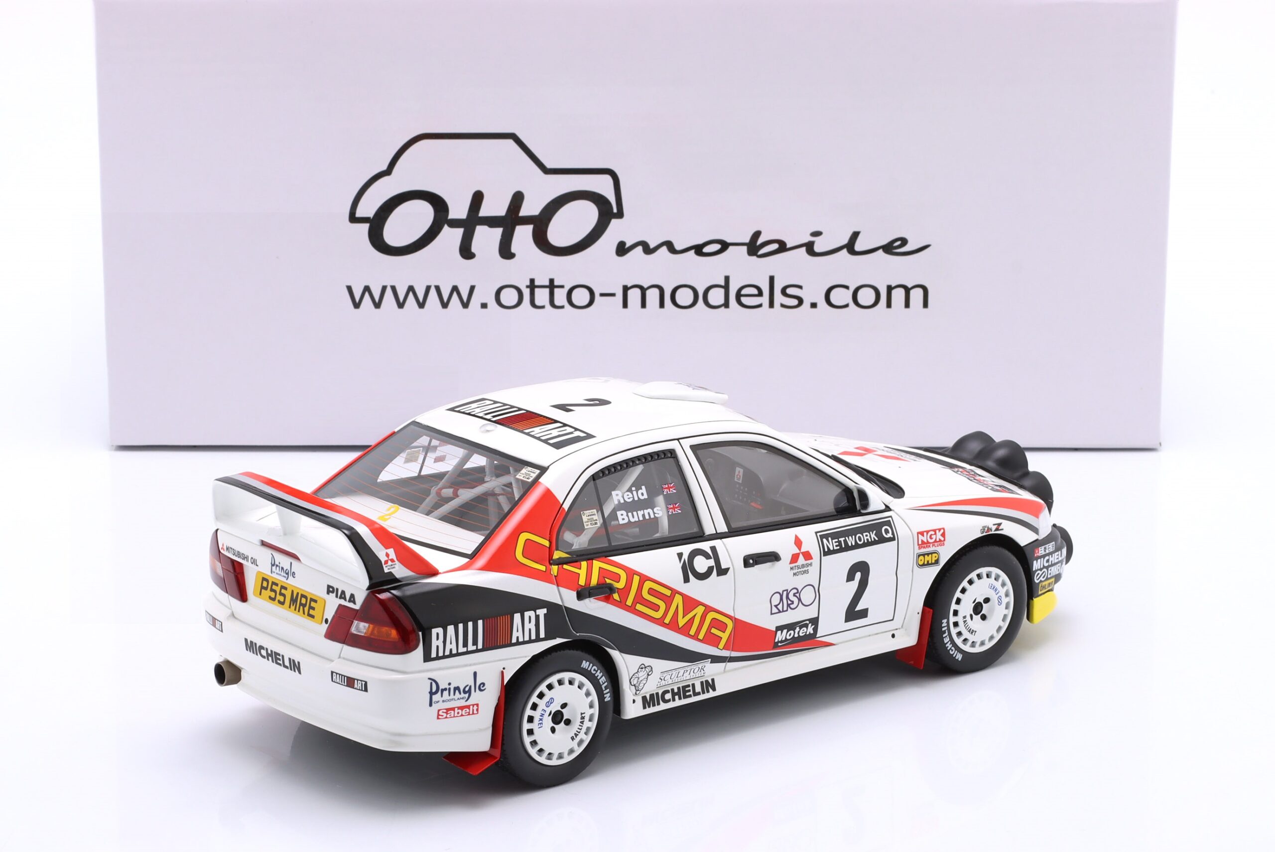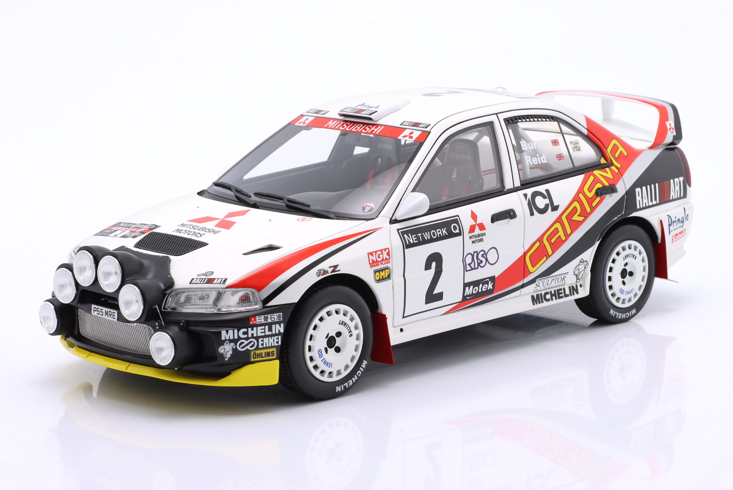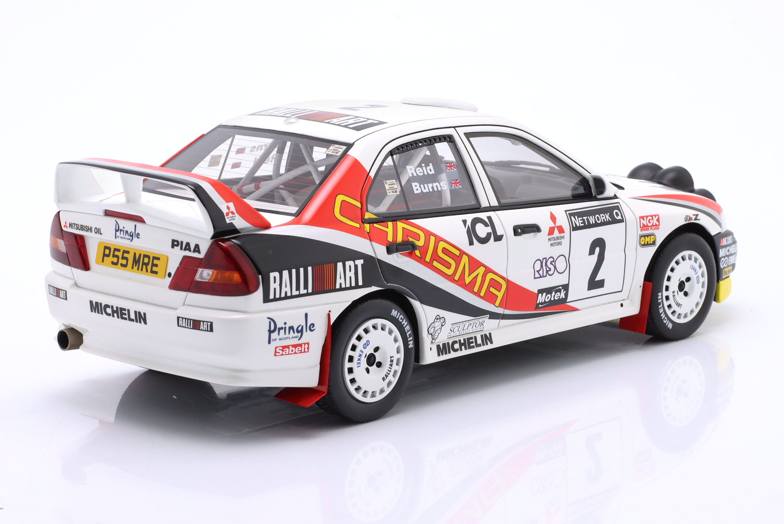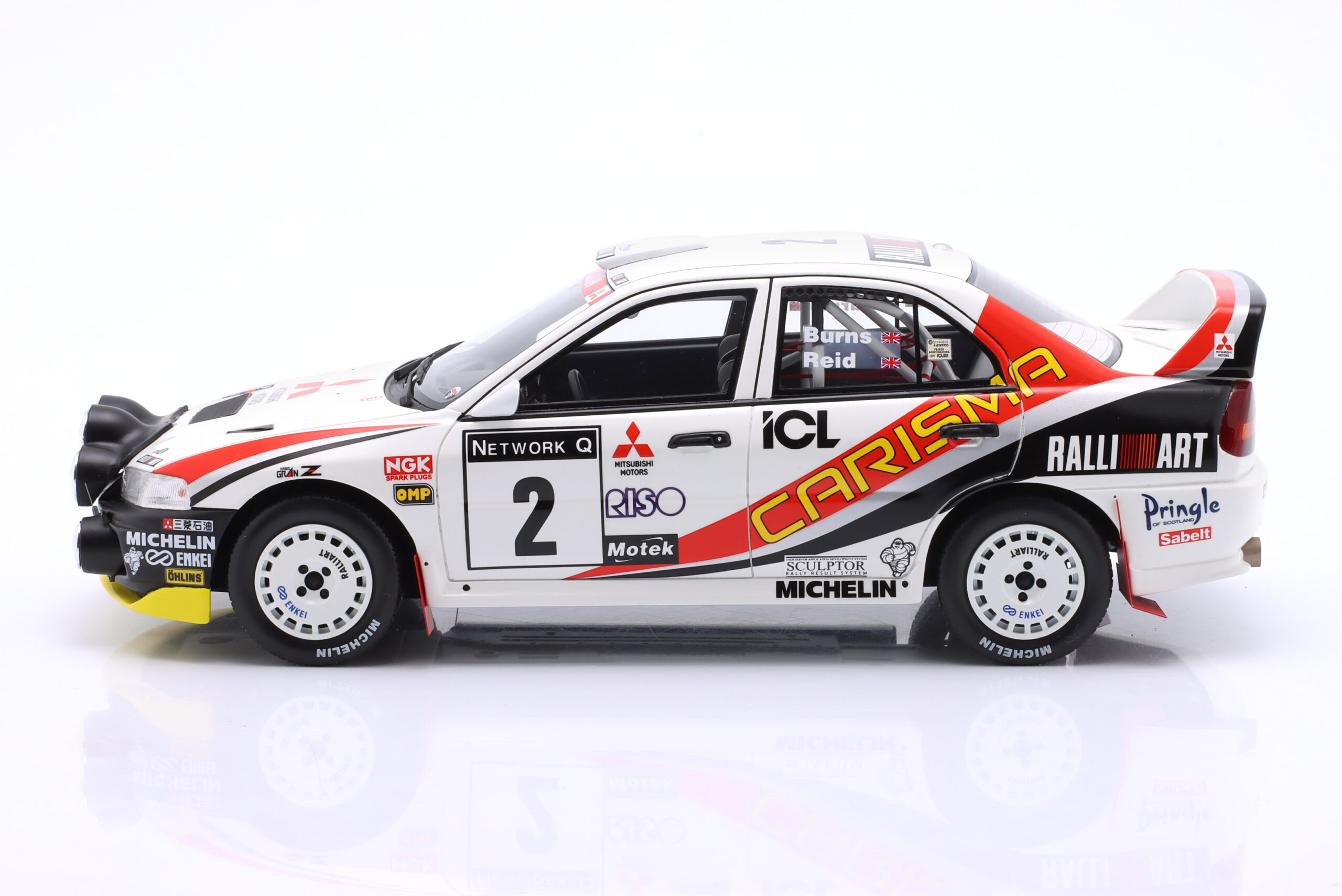 Kolekcjonerski wykonany z żywicy samochodu rajdowego MITSUBISHI CARISMA GT Gr.A #2,w którym załoga R.Burns/R.Reid startowała w Rajdzie RAC w roku 1997.Model nie posiada otwieranych elementów.Zapkowany w styropianowe pudełko z kartonową obwolutą.Edycja limitowana tylko 2000 sztuk.