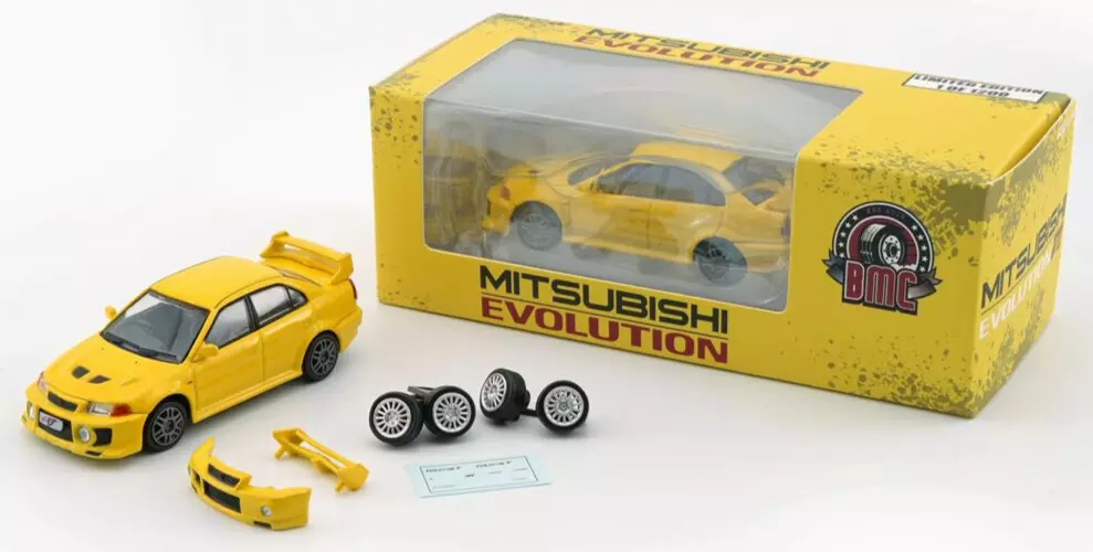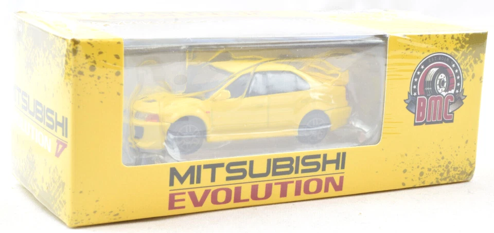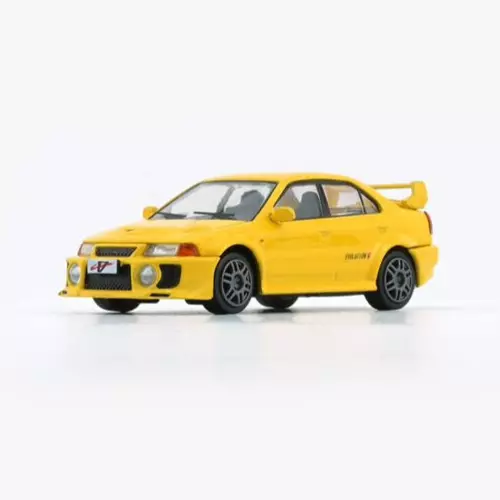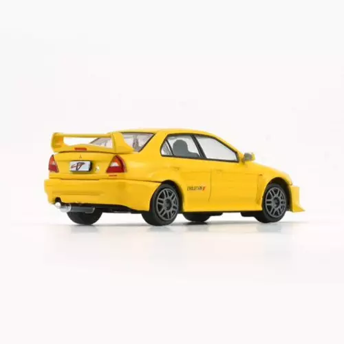 Kolekcjonerski model metalowy z elementami plastikowymi samochodu MITSUBISHI LANCER EVO V w kolorze żółtym.Model zapakowany w blister i kartonowe pudełko.