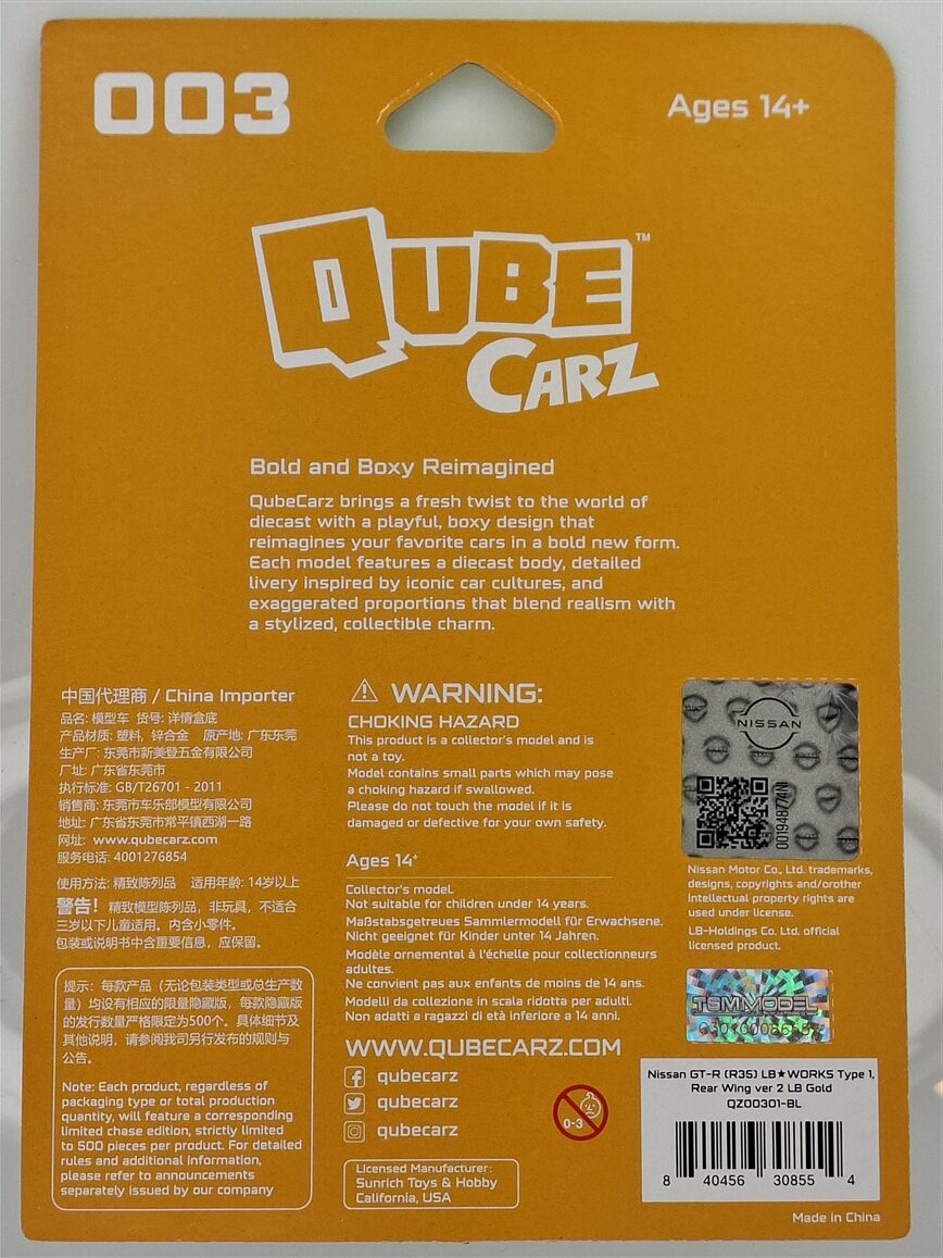 Kolekcjonerski model metalowy z elementami plastikowymi samochodu NISSAN GT-R (R35) LB WORKS Type 1,ver.2 w kolorze Złotym.Model z nowej serii QUBE CARZ zapakowany w blister.
