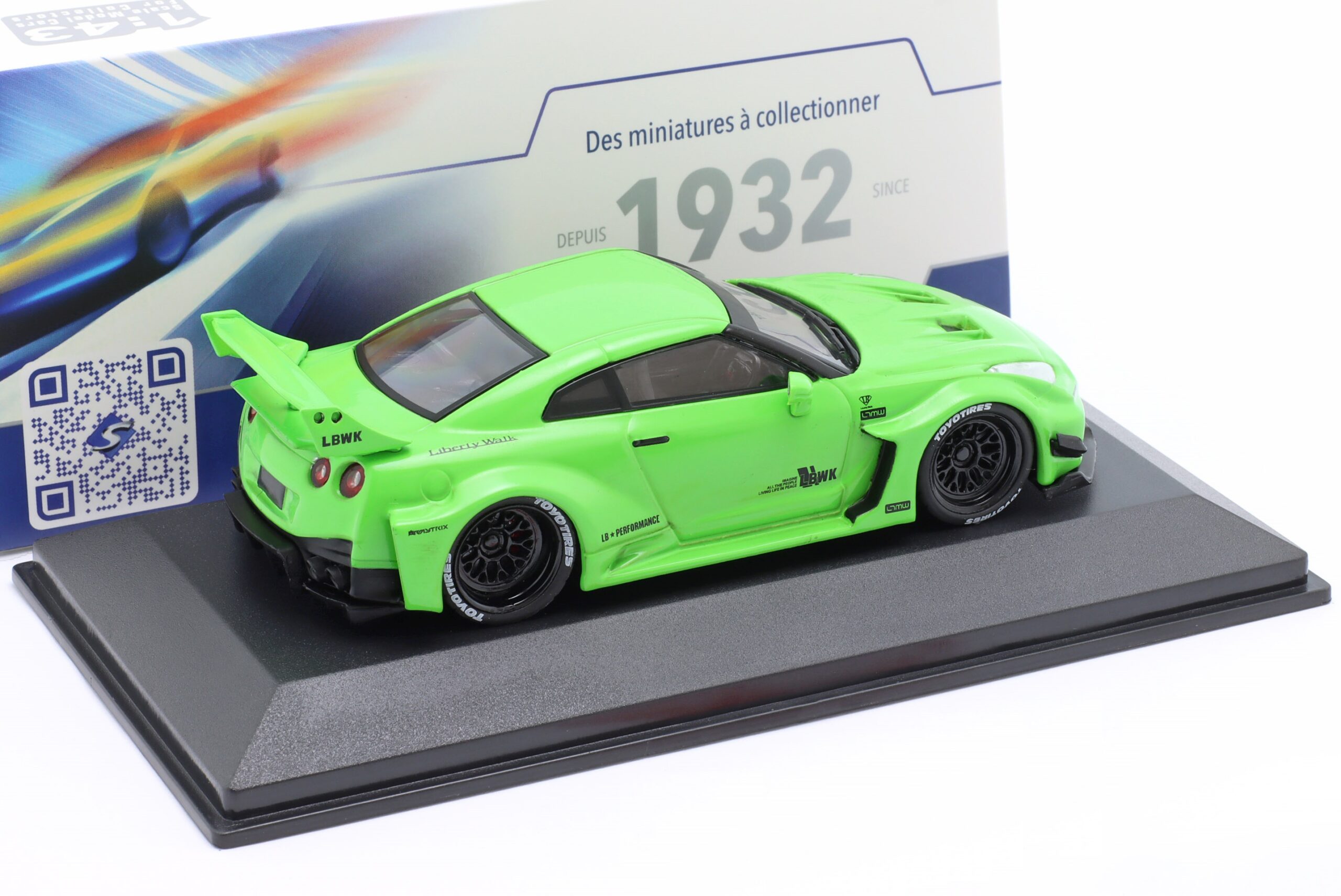 Kolekcjonerski model metalowy z elementami plastikowymi samochodu NISSAN GT-R R35 Liberty Walk Body Kit z roku 2020 w kolorze Acid Green.Model na podstawce,posiada akrylową gablotkę ekspozycyjną.