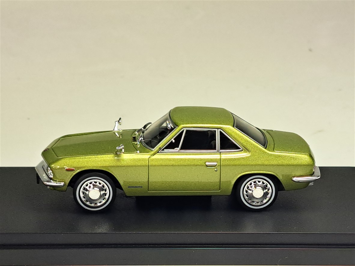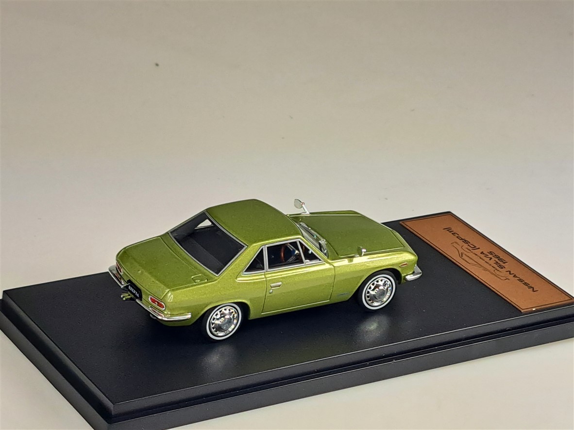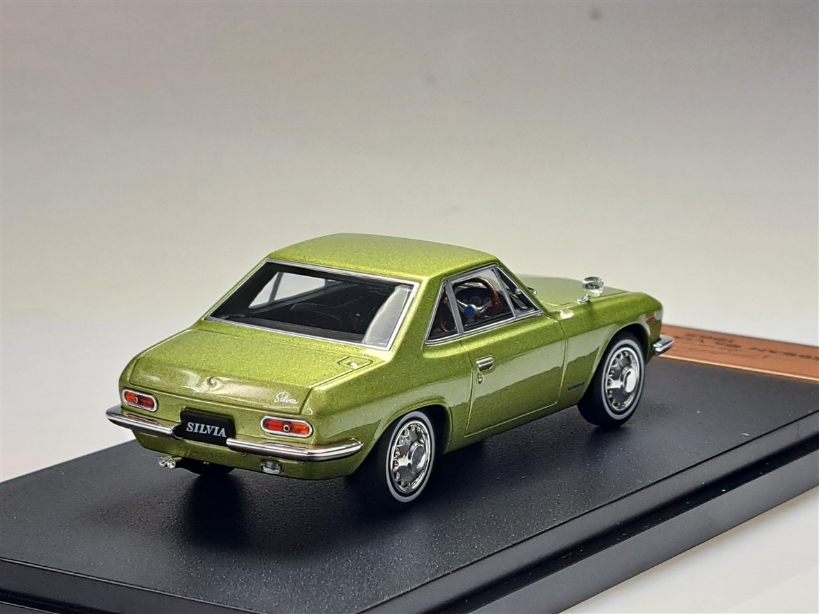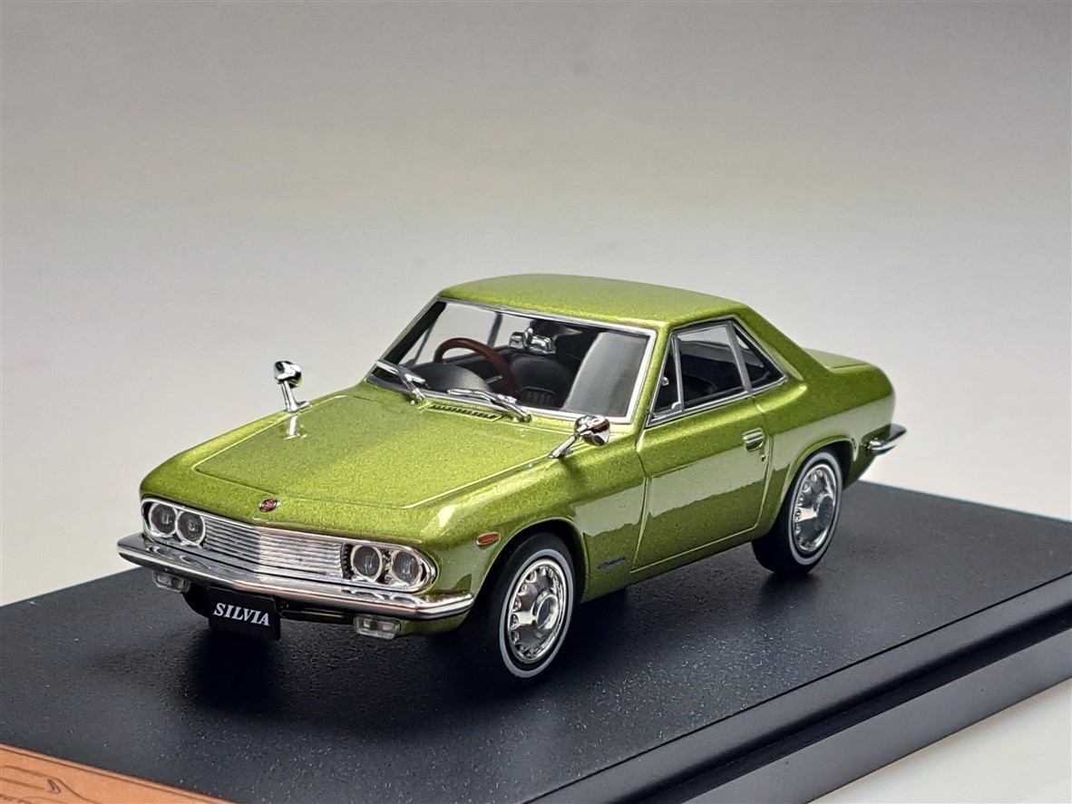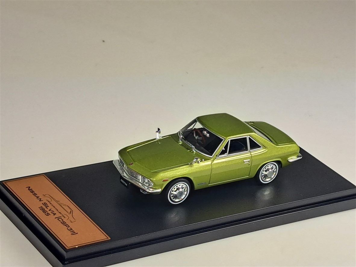 Kolekcjonerski model metalowy z elementami plastikowymi samochodu NISSAN SILVIA z roku 1965 w kolorze Zielony metallic.Model na podstawce,posiada akrylową gablotkę ekspozycyjną.