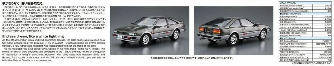 Plastikowy zestaw do sklejania modelu samochodu NISSAN Silvia/Gazelle S12 Turbo RS-X z roku 1984 w skali 1/24.Zestaw zawiera kalkomanie,ne zawiera kleju ani farb.Zdjęcia przedstawiają gotowy model ,po sklejeniu oraz pomalowaniu.