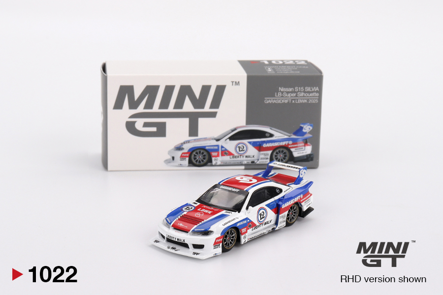 Kolekcjonerski model metalowy z elementami plastikowymi samochodu NISSAN SILVIA S15 LB-Super Silhouette Garasidrift X LBWK z roku 2025.Model zapakowany w kartonowe pudełko.