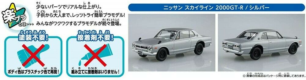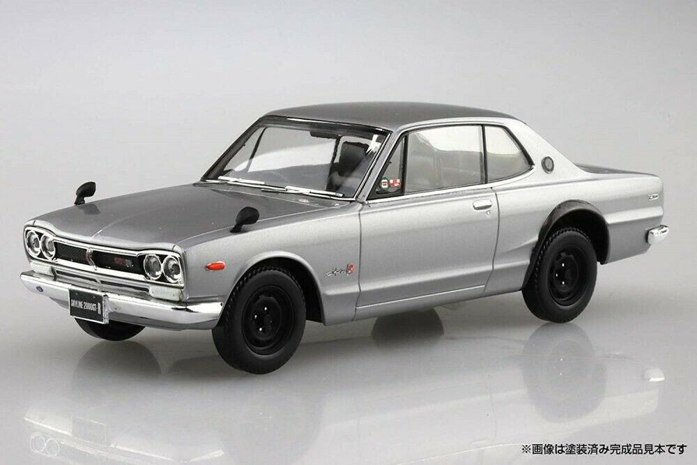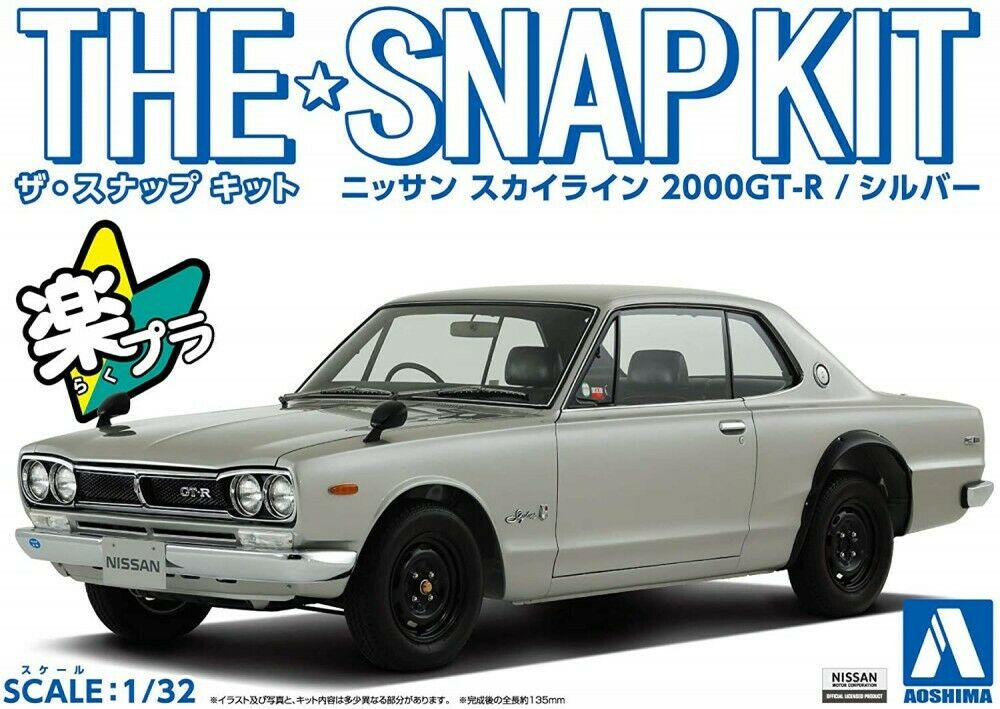 Plastikowy zestaw do składania modelu samochodu NISSAN SKYLINE 2000 GT-R z roku 1969 w kolorze Srebrnym w skali 1/32.Zestaw zawiera kalkomanie.Do złożenia modelu nie jest potrzebny klej ani farby.Zdjęcia przedstawiają gotowy model po złożeniu.